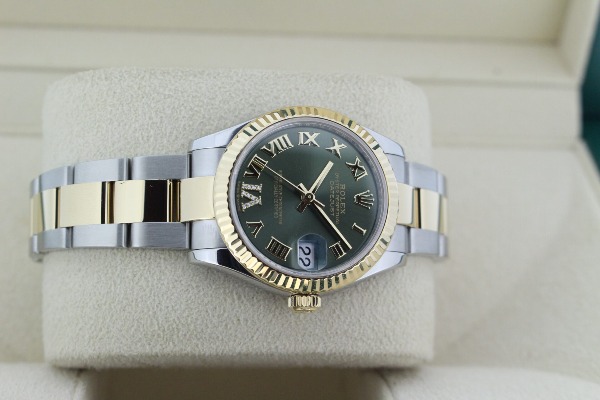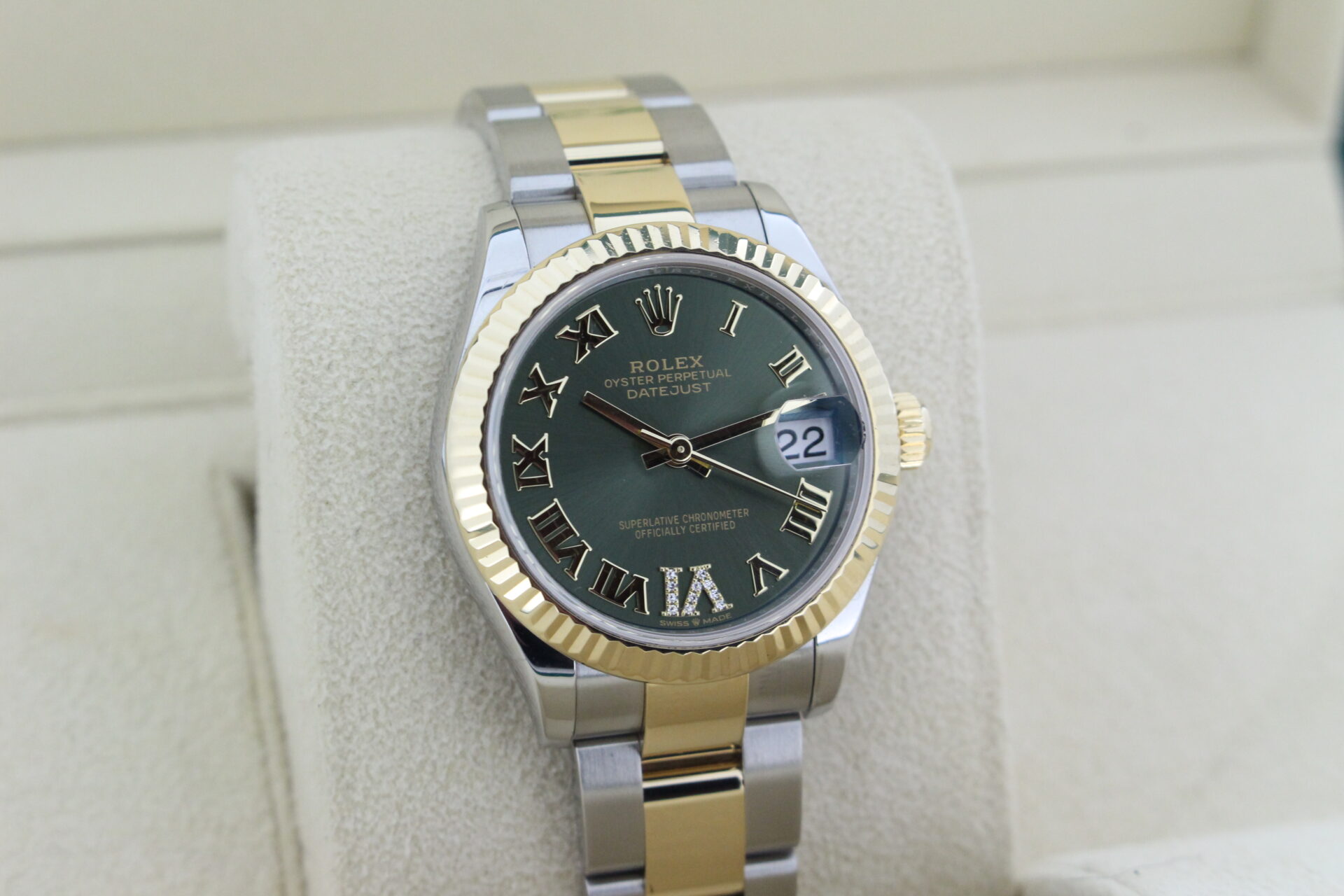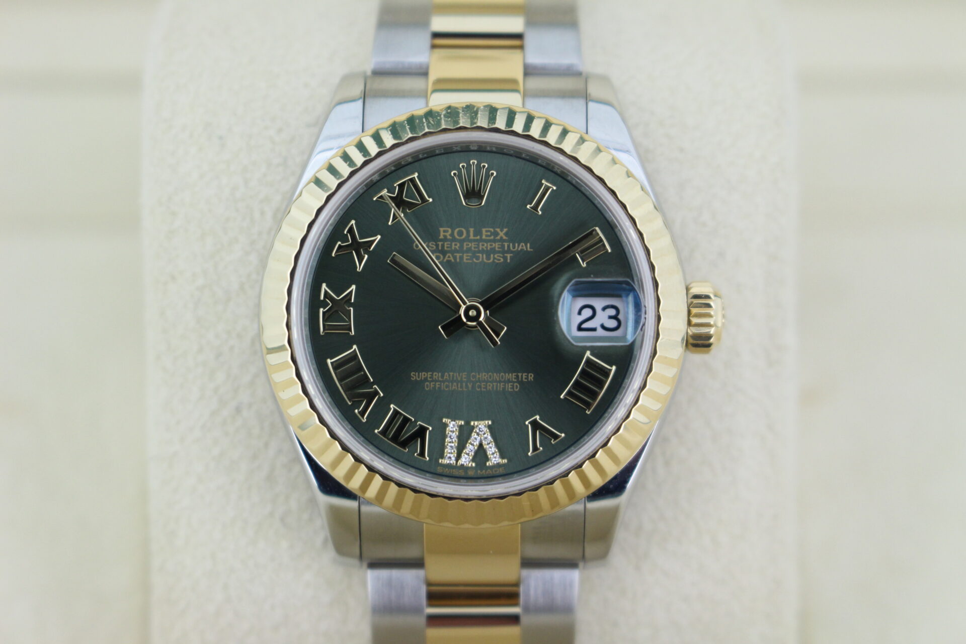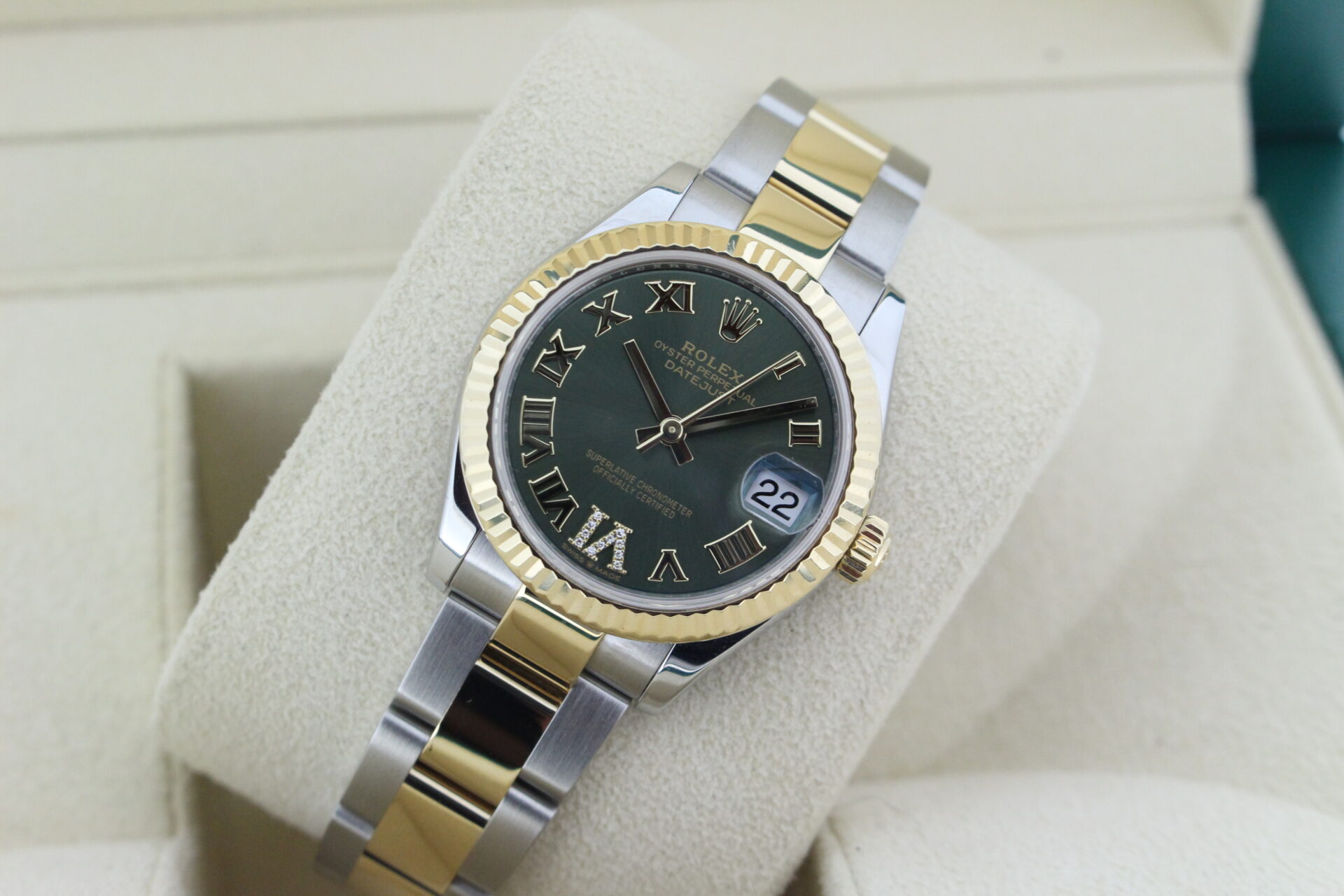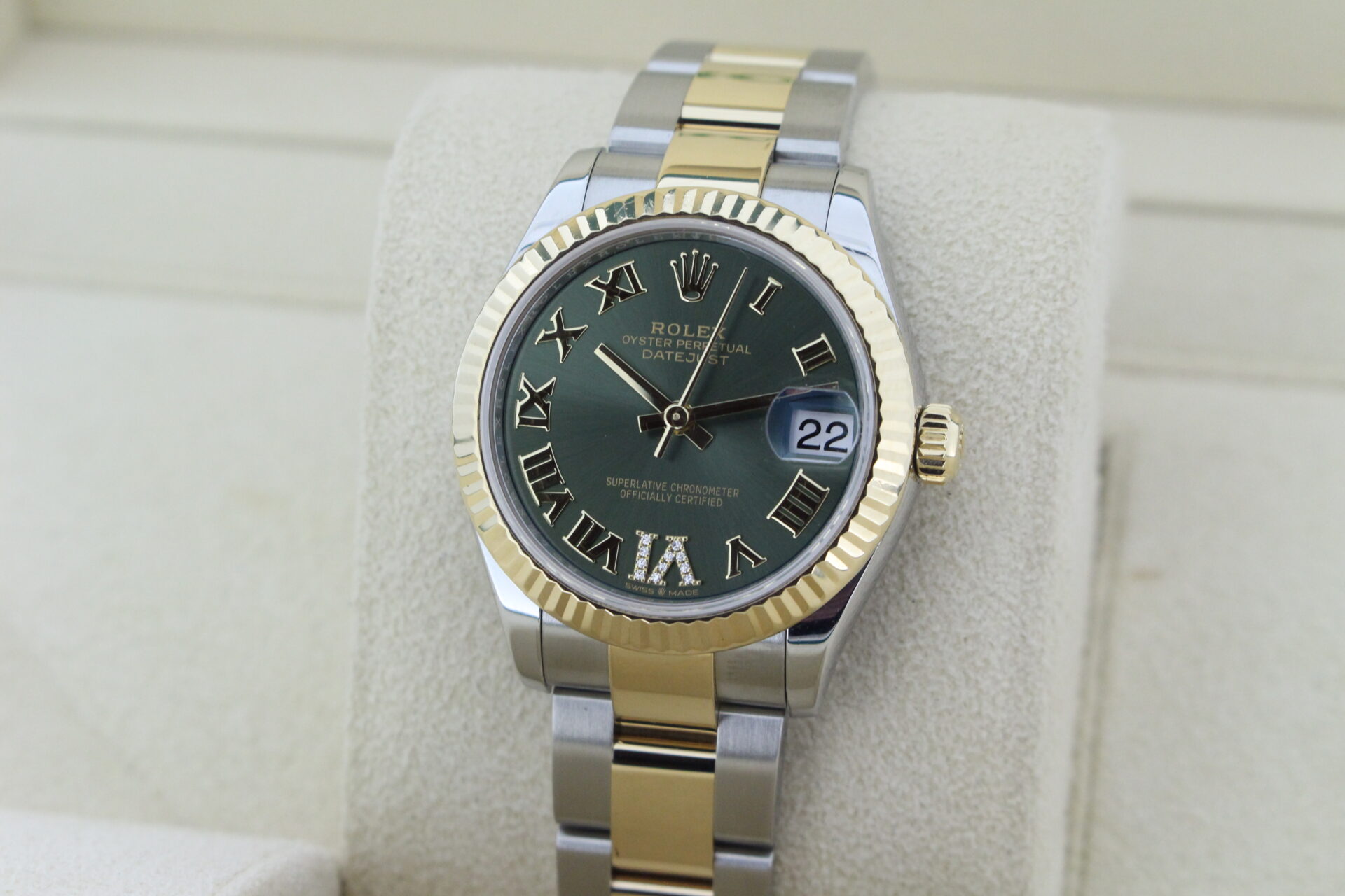 We are pleased to offer this beautiful Rolex Datejust 31. Fitted with the extremely desirable olive green diamond set dial on an oyster bracelet.