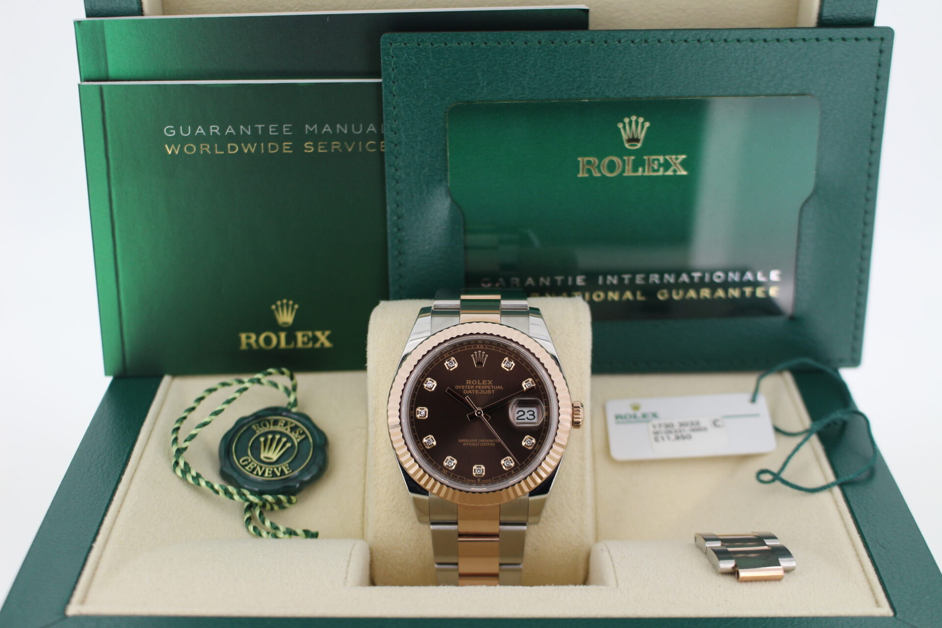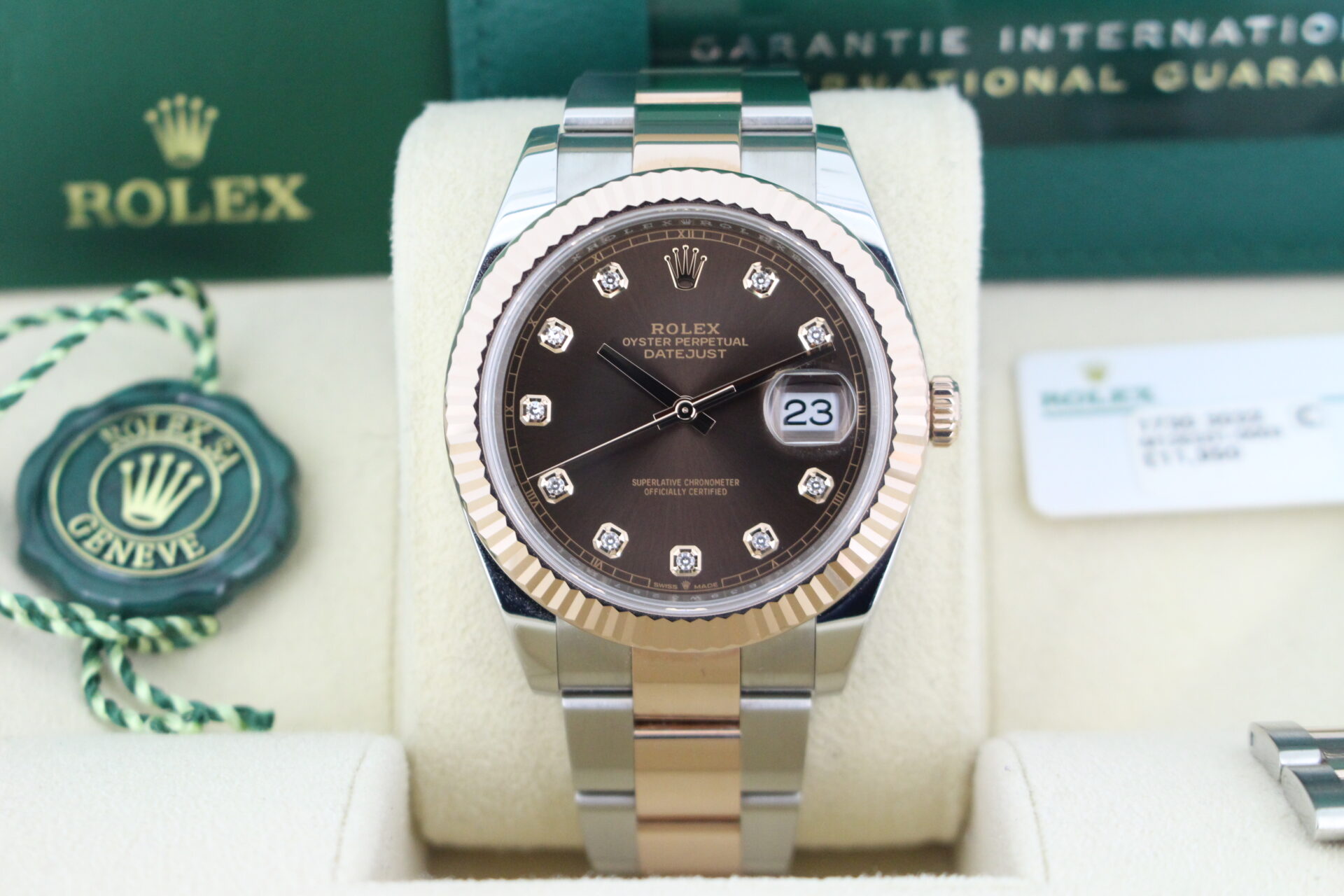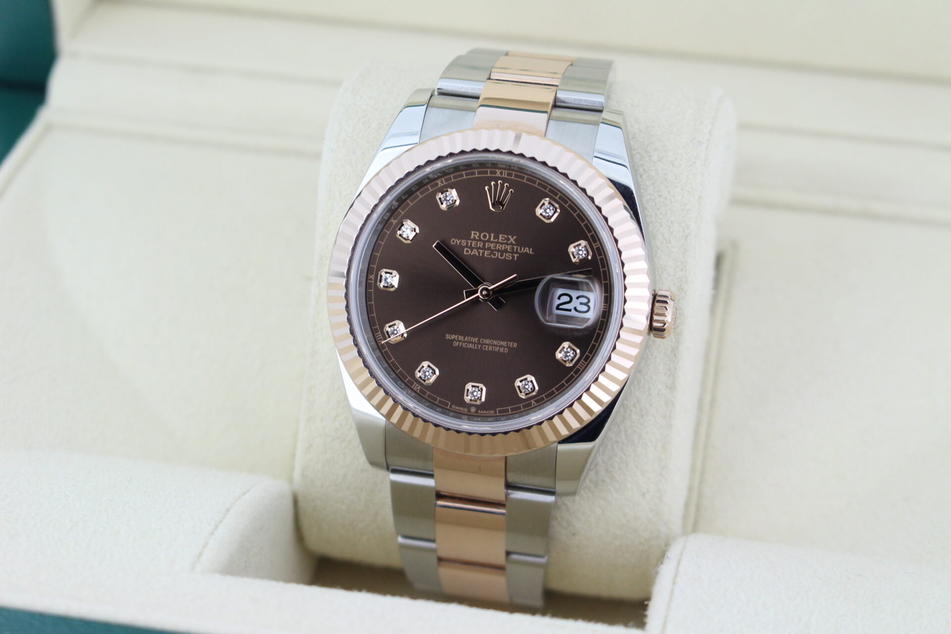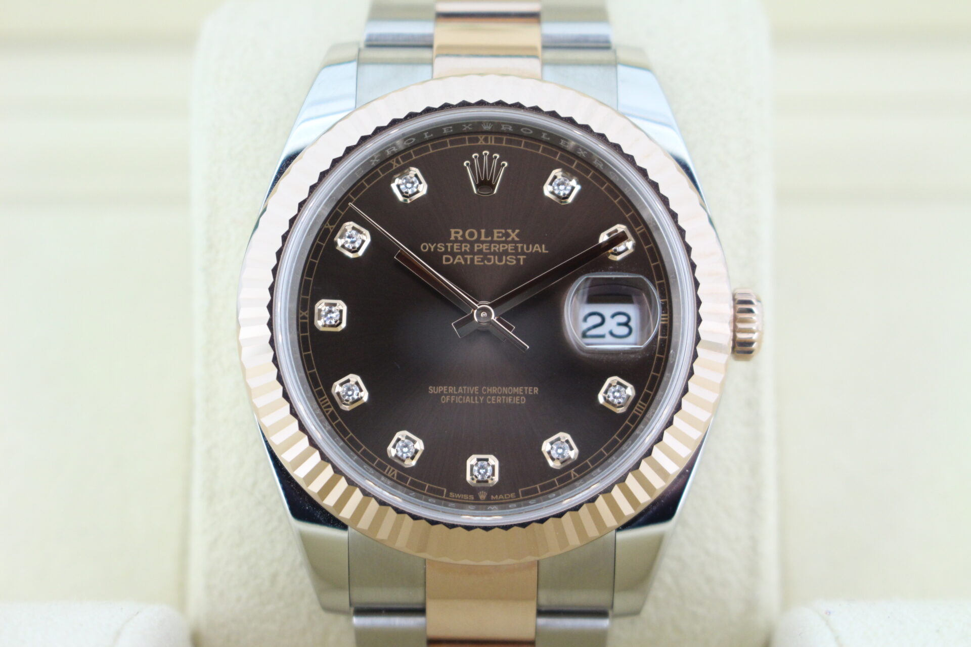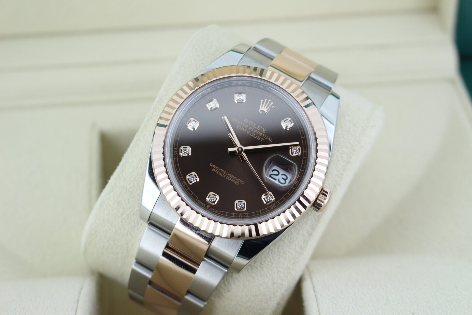 The highlight of this watch is the stunning chocolate brown dial, adorned with factory-set diamond hour markers that catch the light with understated brilliance. The fluted Everose gold bezel adds a further level of luxury and sparkle.