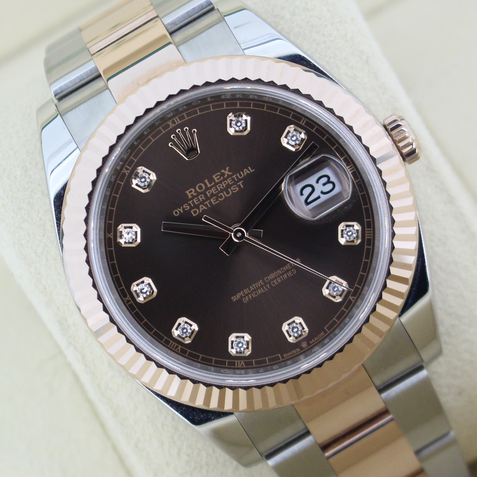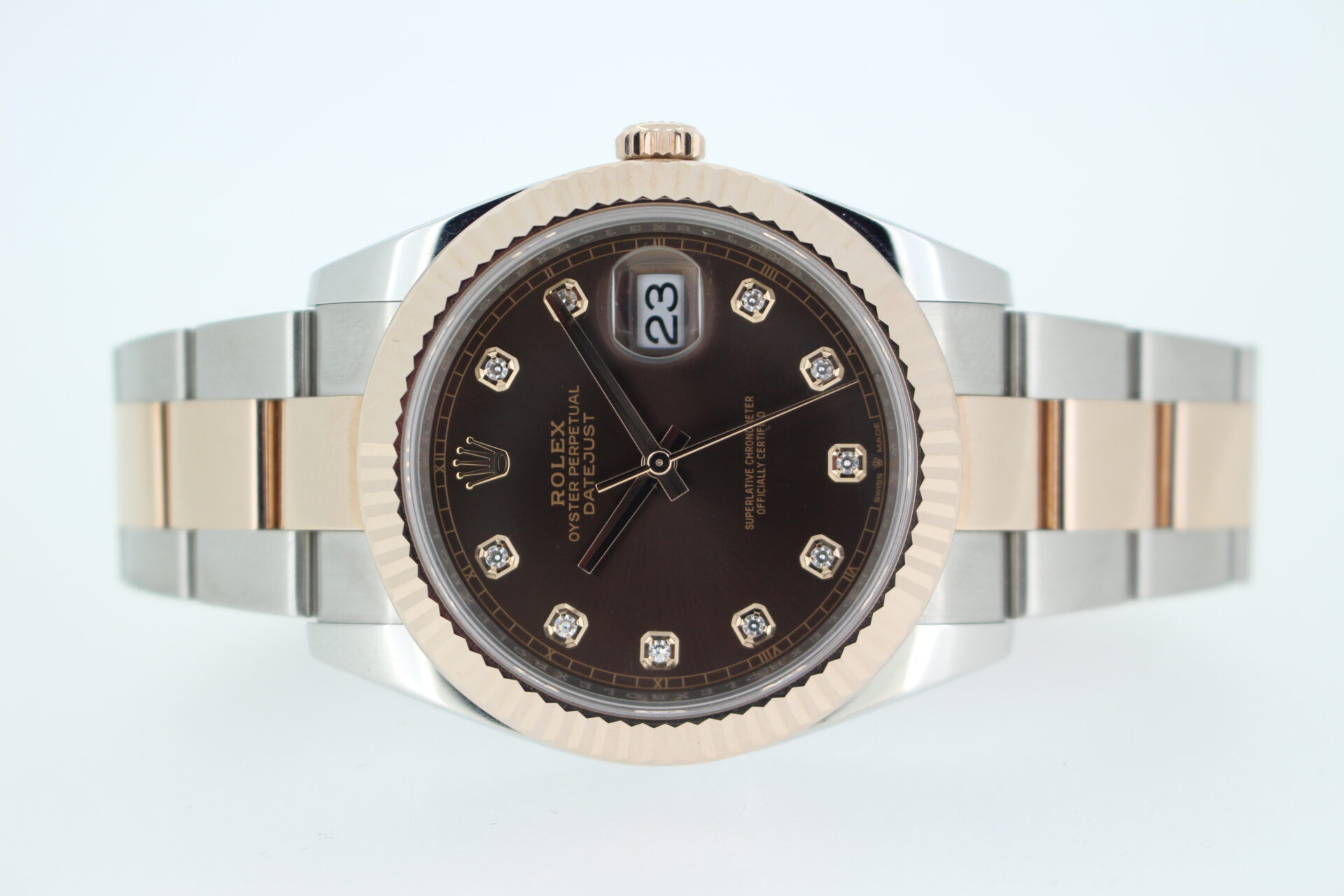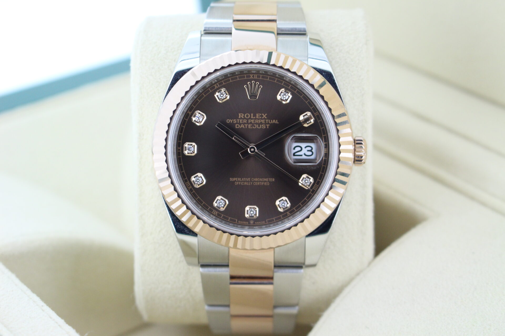 A striking bi-metal stainless steel and 18ct Everose gold Rolex Datejust 41mm with a solid 18ct rose gold fluted bezel and a factory diamond chocolate dial.
