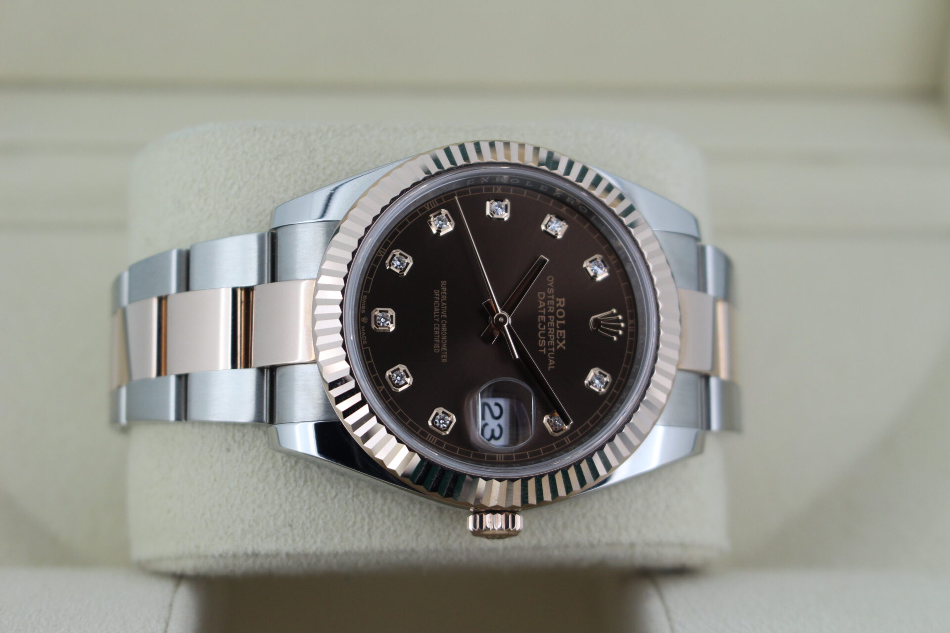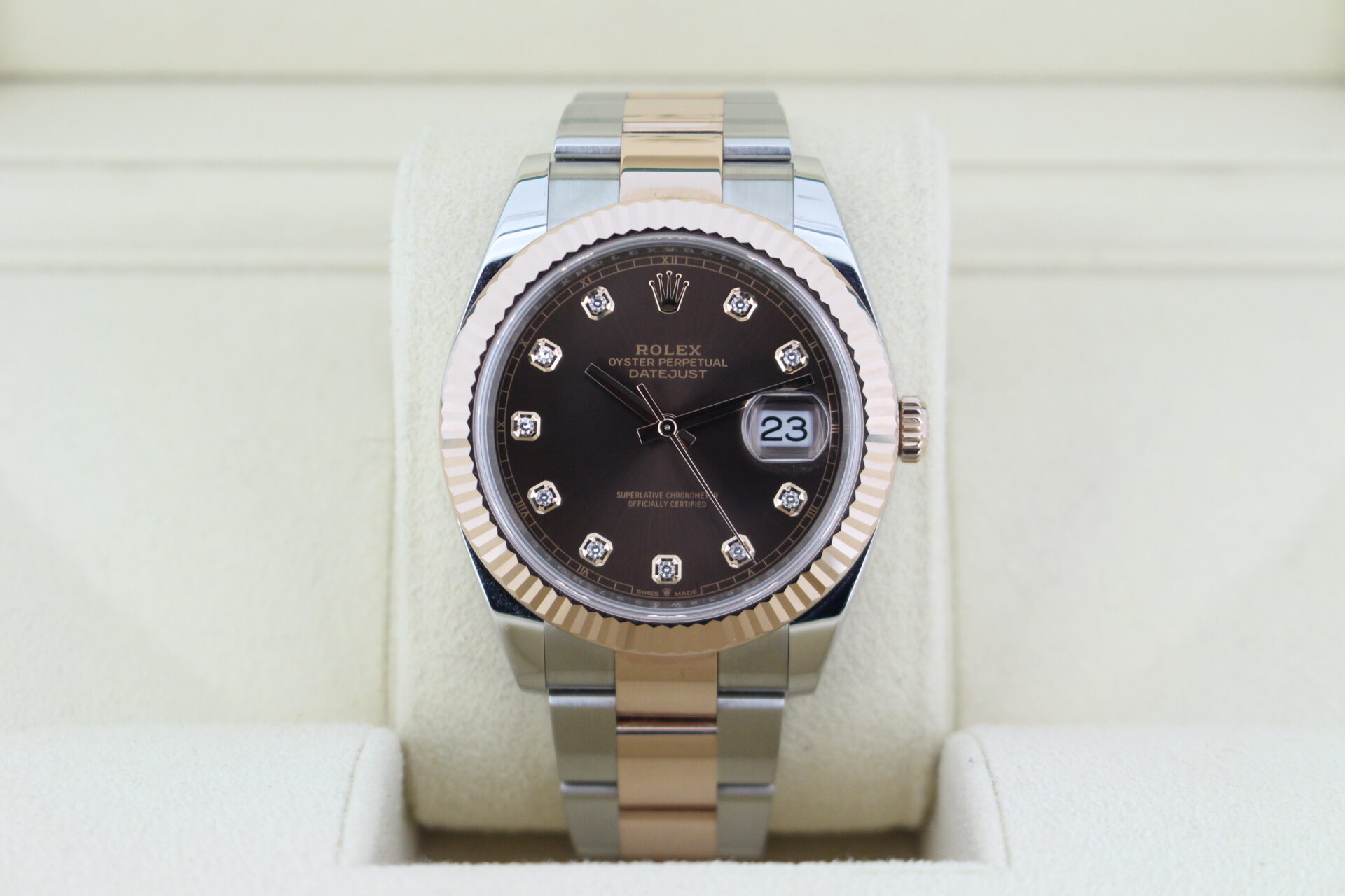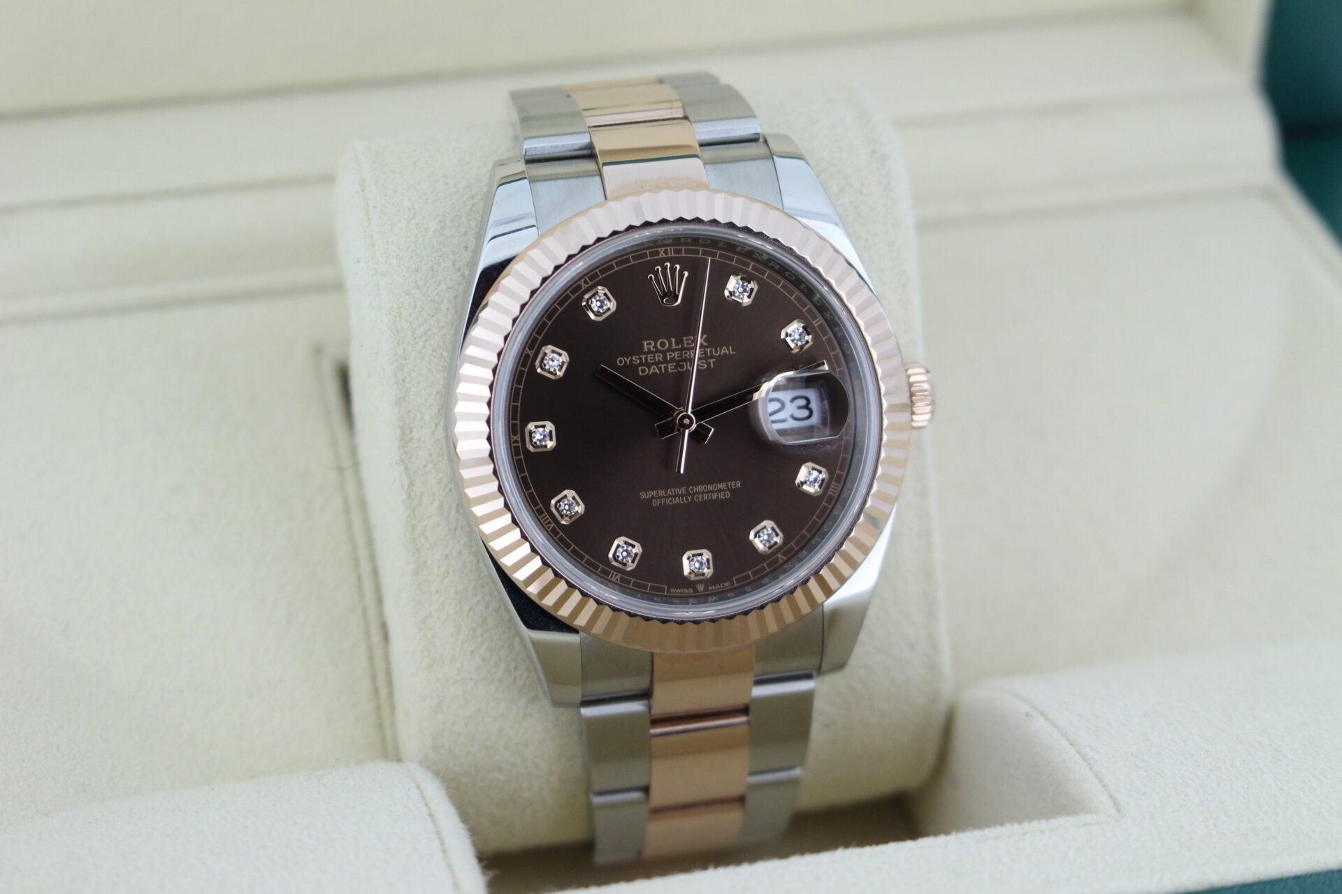 A striking bi-metal stainless steel and 18ct Everose gold Rolex Datejust 41mm with a solid 18ct rose gold fluted bezel and a factory diamond chocolate dial.