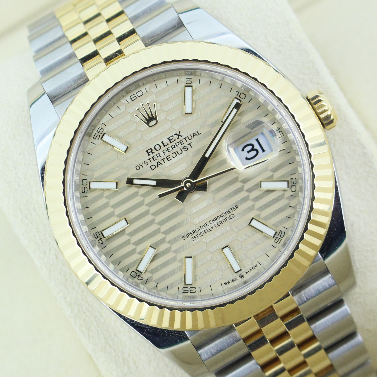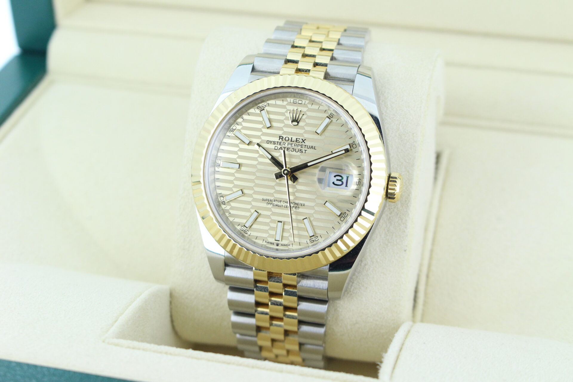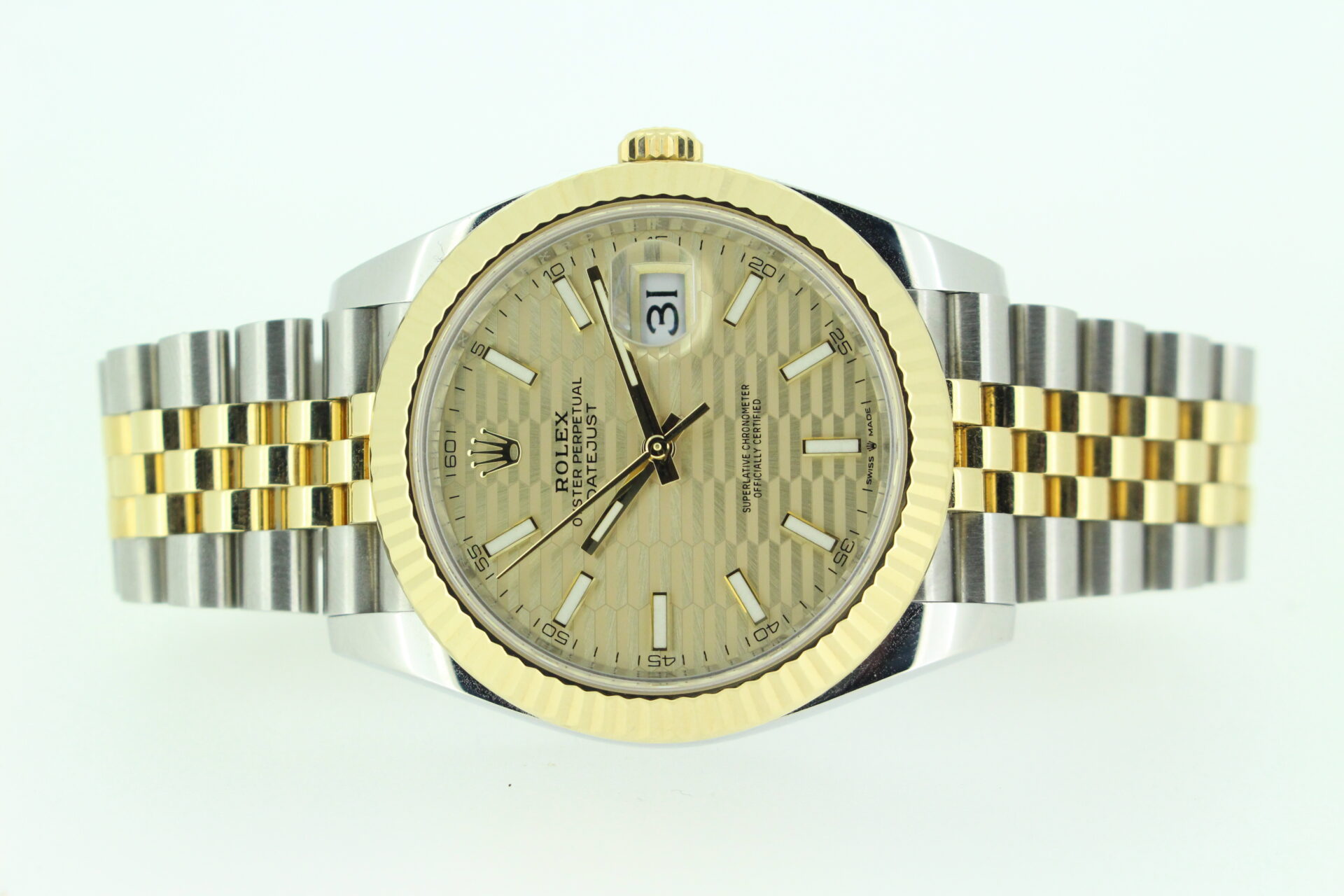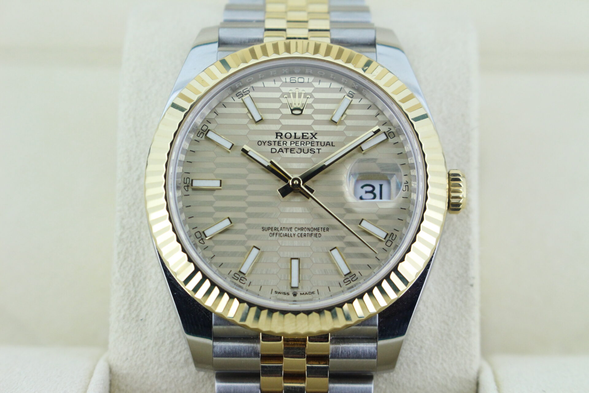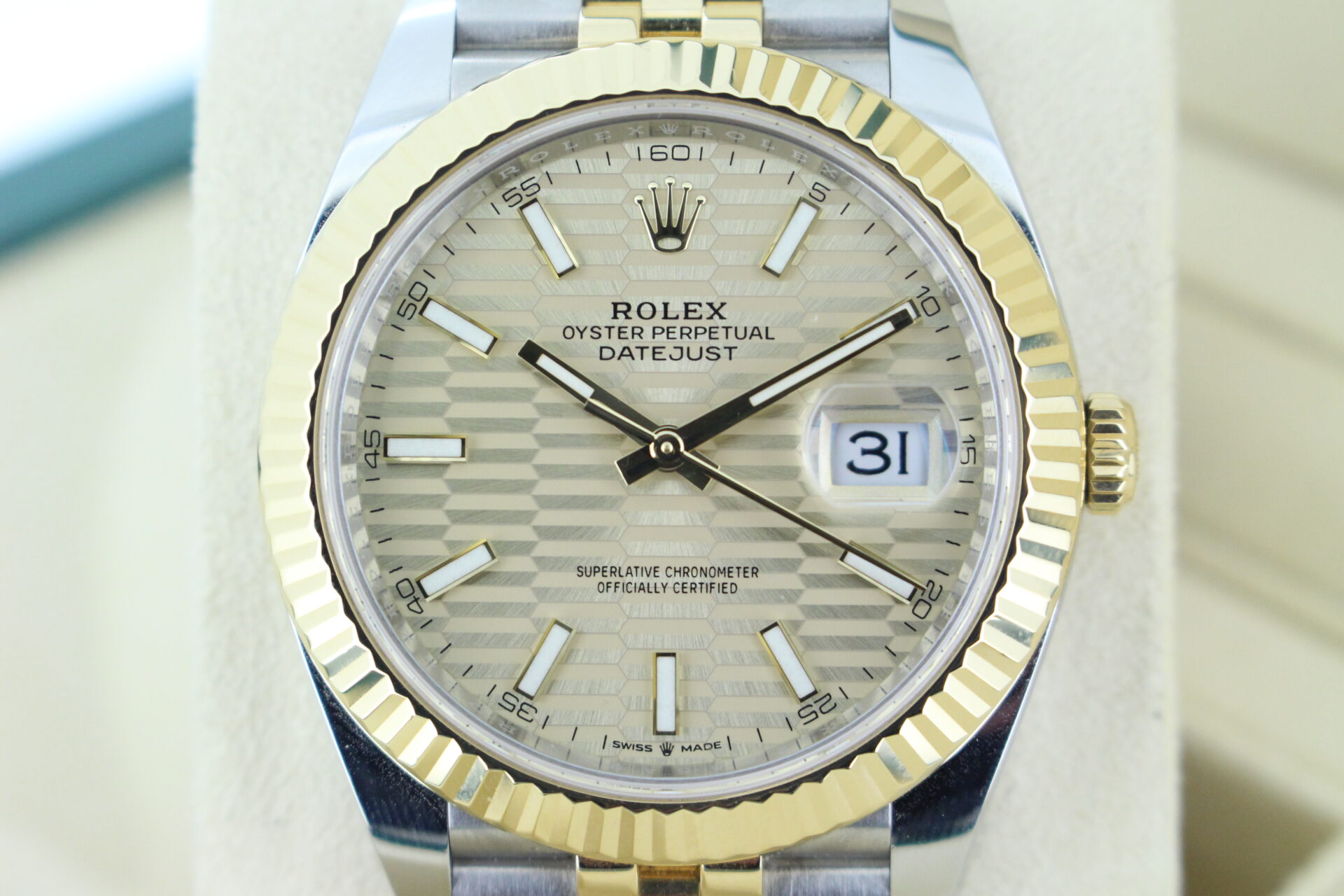 The standout feature of this watch is its champagne motif dial, adorned with Rolex’s signature “fluted” pattern — a subtle geometric texture that catches the light beautifully from every angle. Complemented by golden baton hour markers and a Cyclops lens over the date window at 3 o’clock, the dial exudes understated luxury.