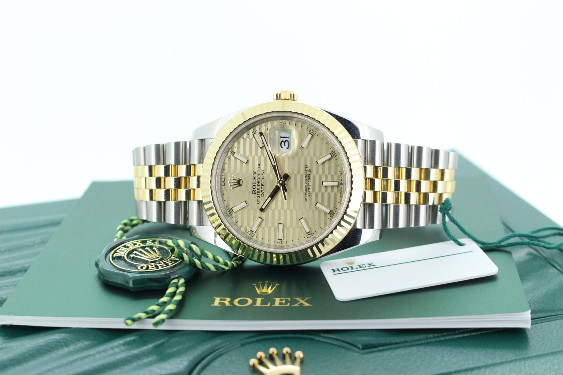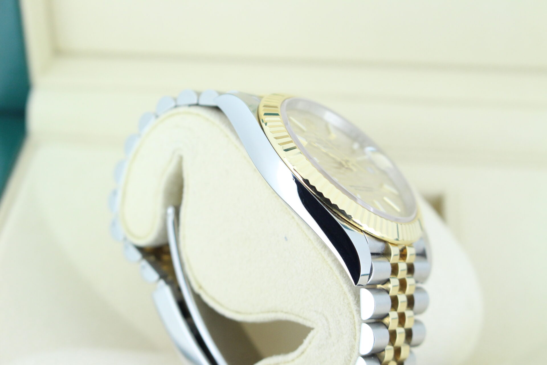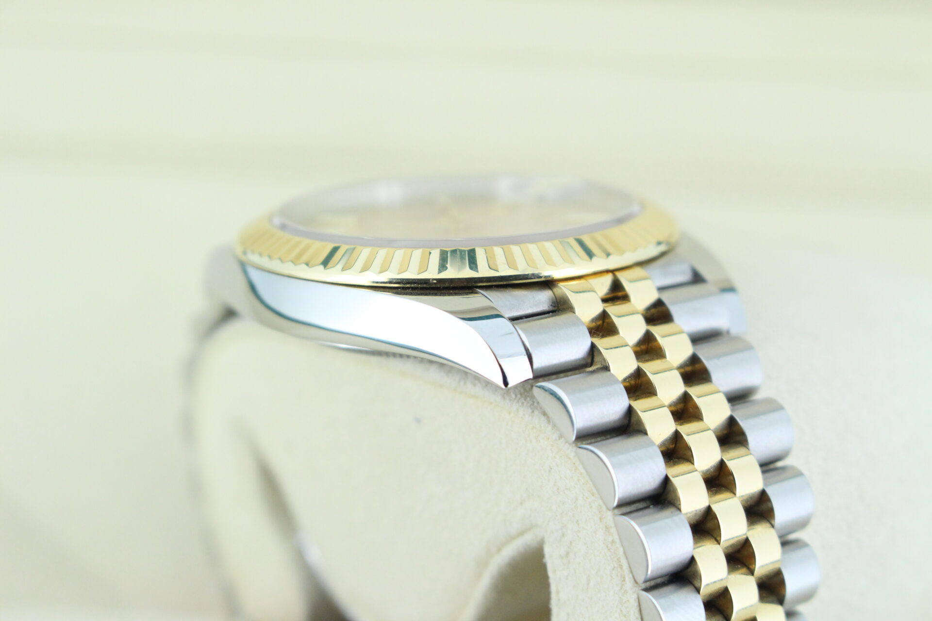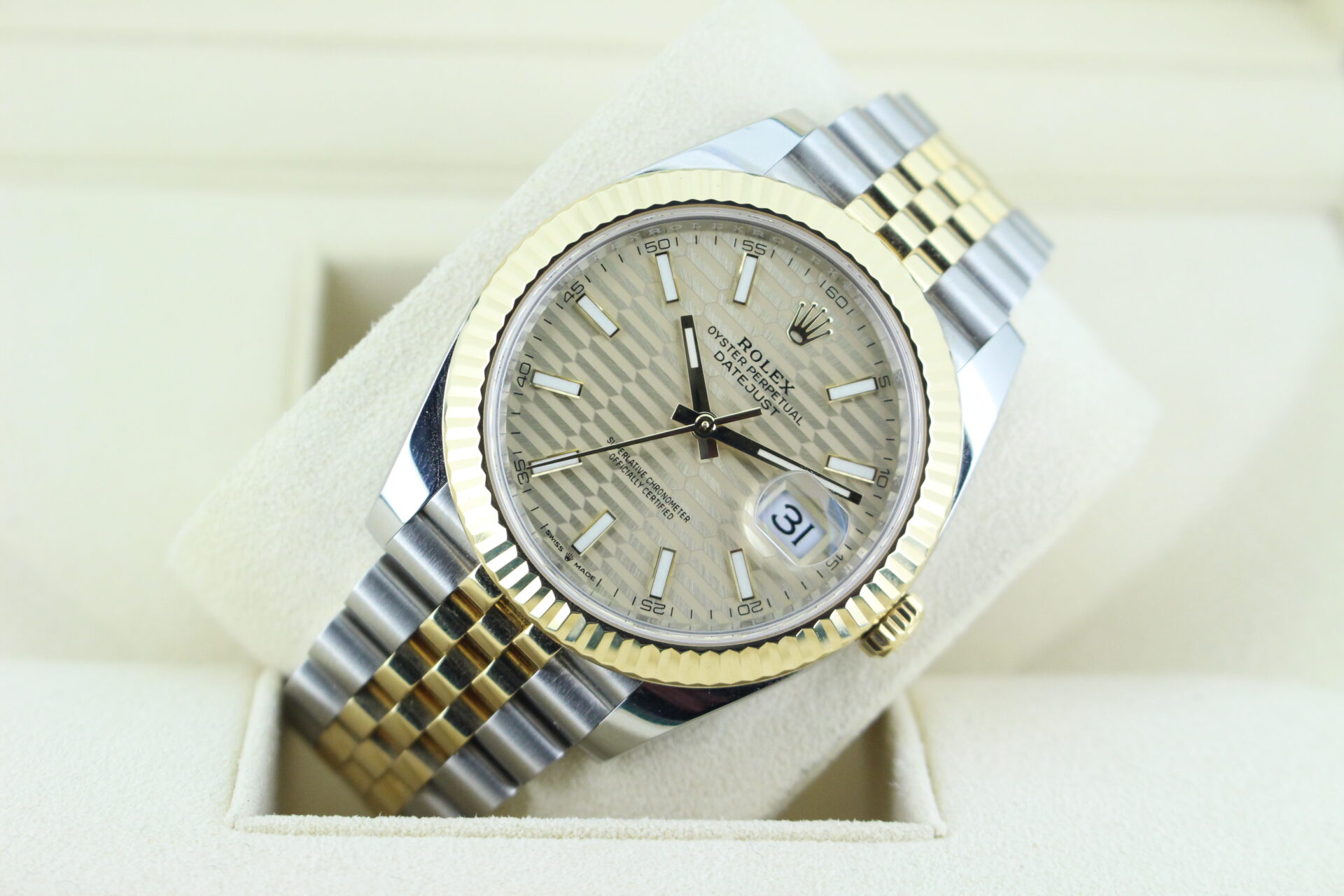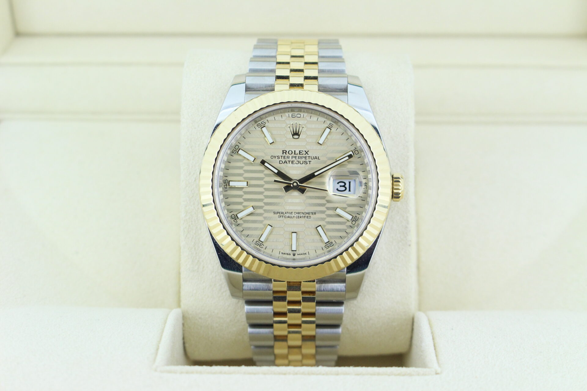 The standout feature of this watch is its champagne motif dial, adorned with Rolex’s signature “fluted” pattern — a subtle geometric texture that catches the light beautifully from every angle. Complemented by golden baton hour markers and a Cyclops lens over the date window at 3 o’clock, the dial exudes understated luxury.