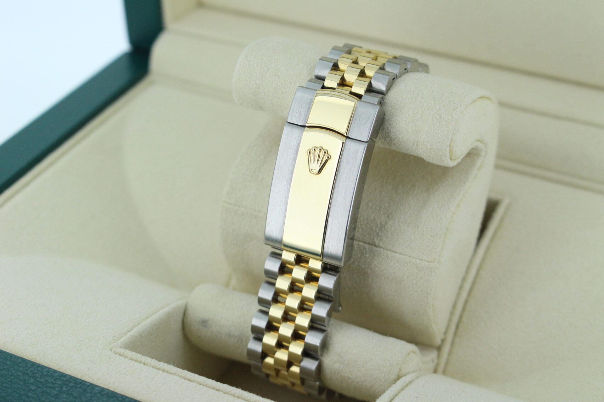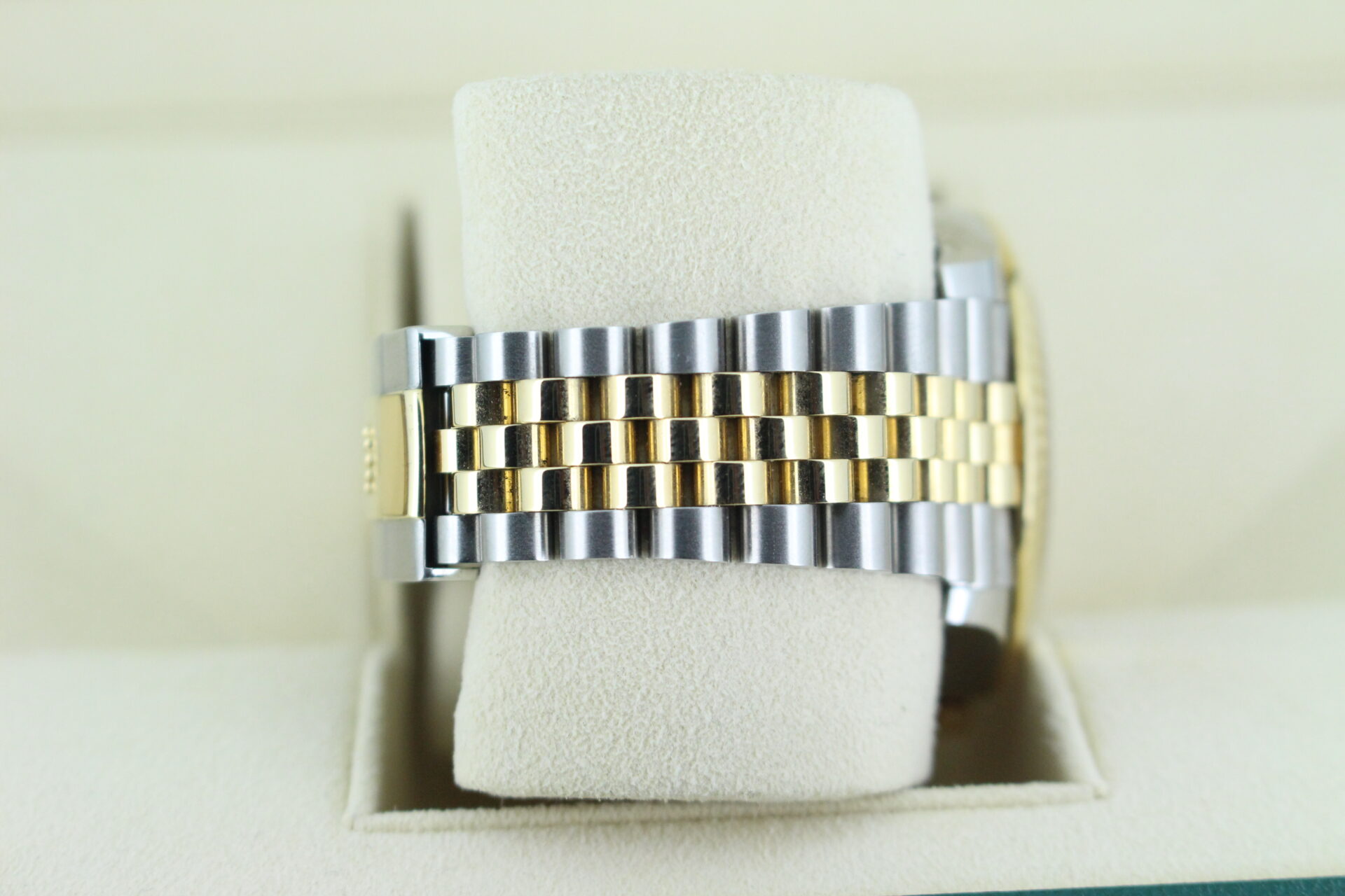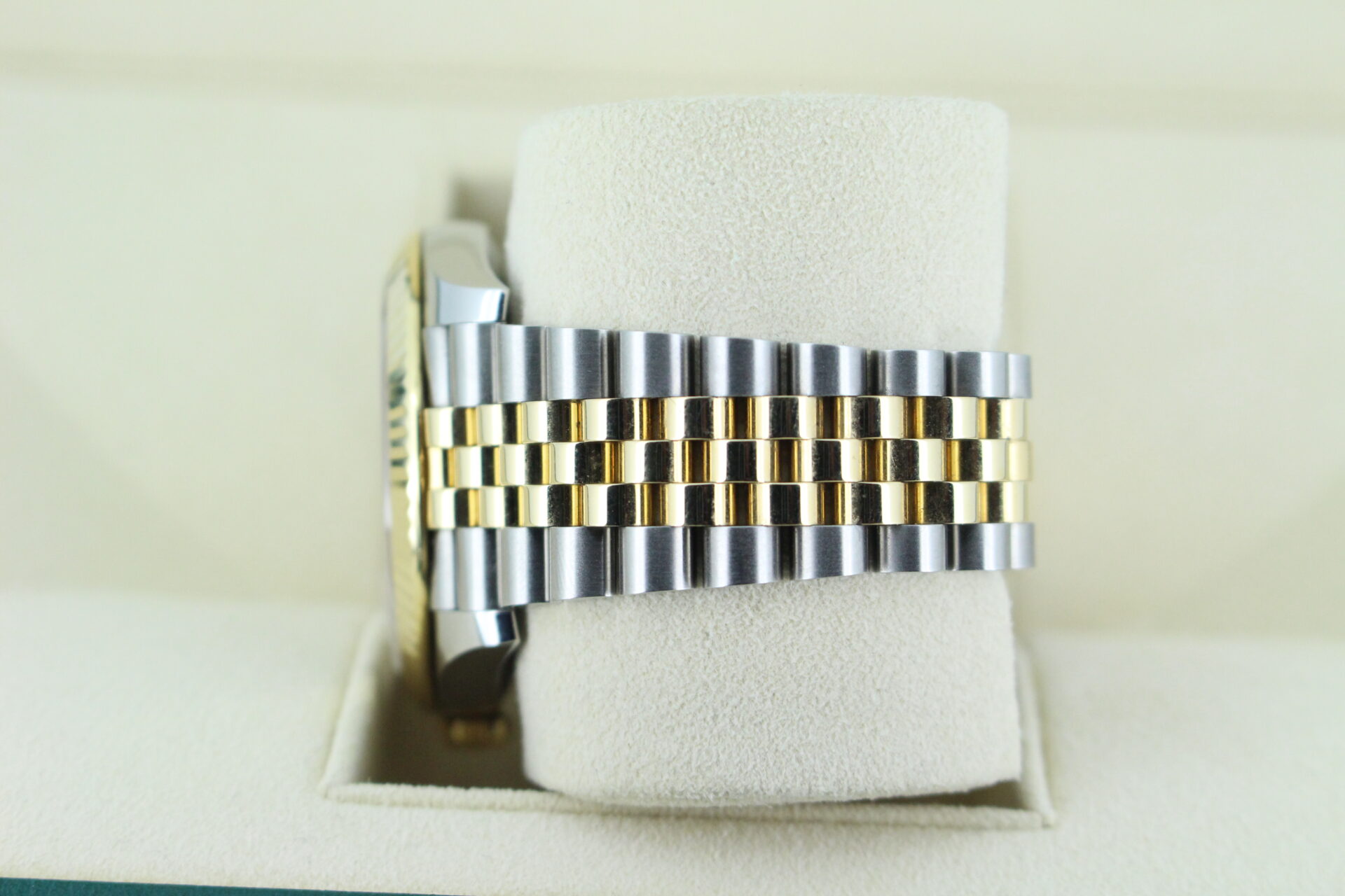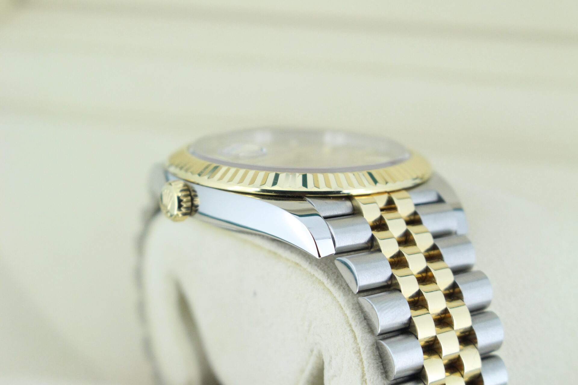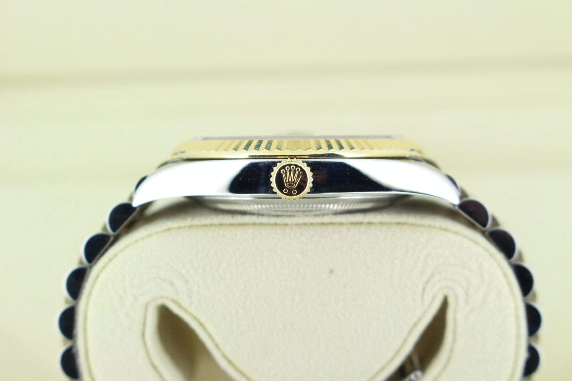 The standout feature of this watch is its champagne motif dial, adorned with Rolex’s signature “fluted” pattern — a subtle geometric texture that catches the light beautifully from every angle. Complemented by golden baton hour markers and a Cyclops lens over the date window at 3 o’clock, the dial exudes understated luxury.
