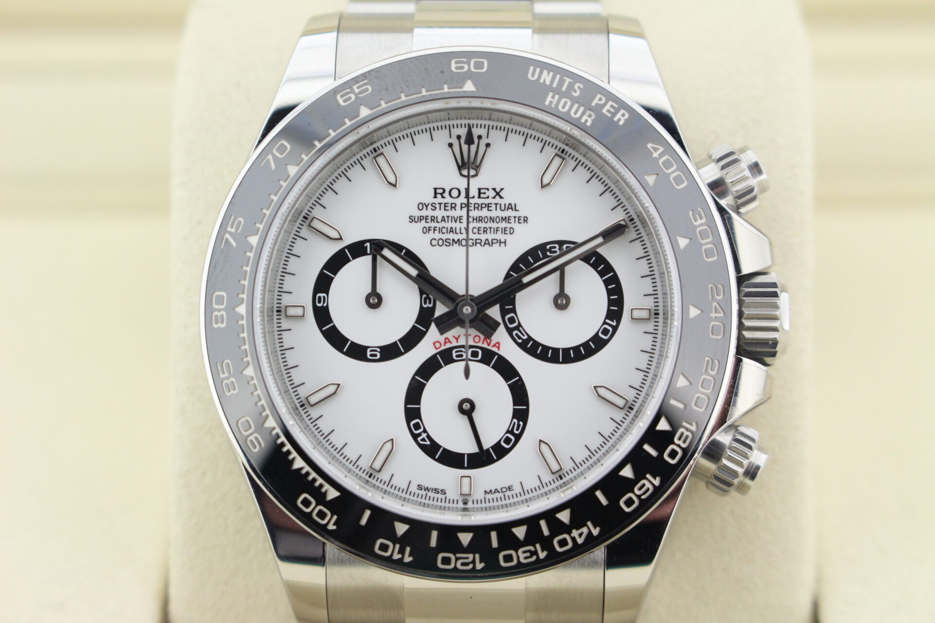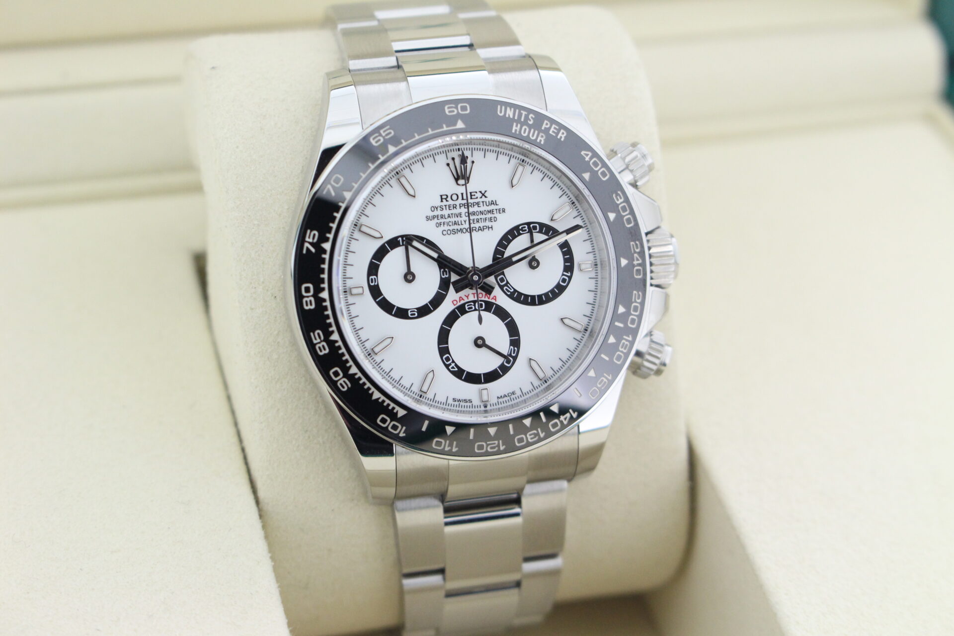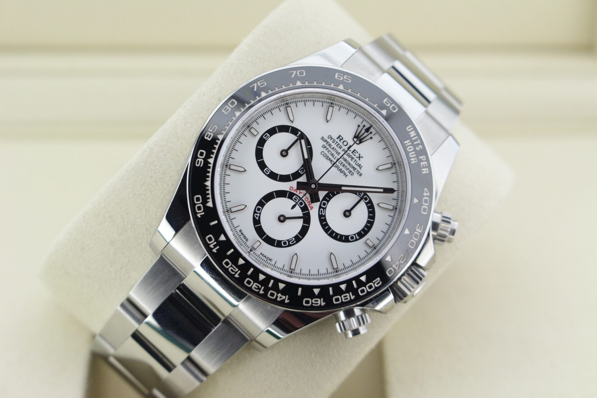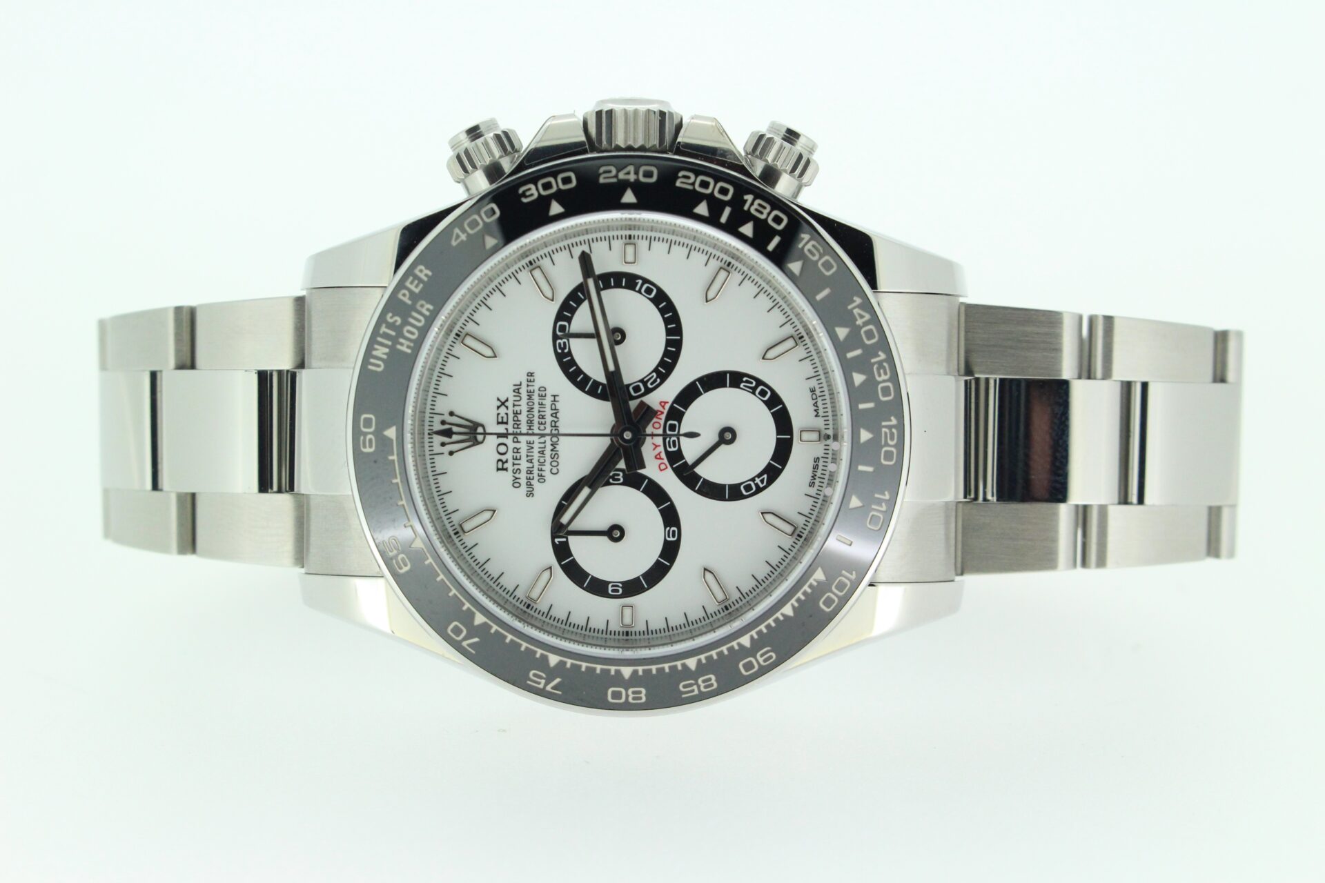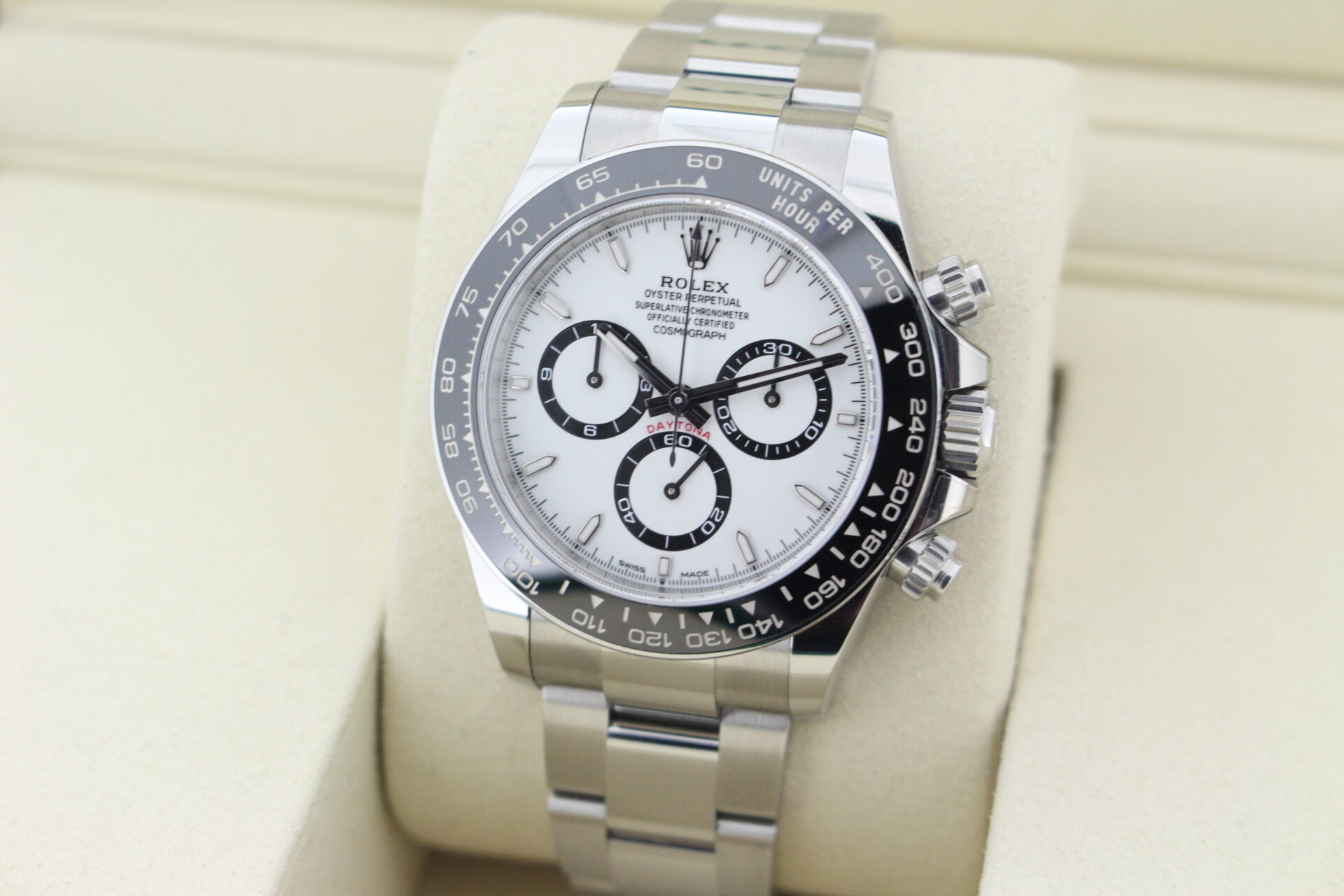 A stunning new reference gents Rolex Daytona watch in stainless steel with a white ‘Panda’ dial and black ceramic bezel set with numerals.