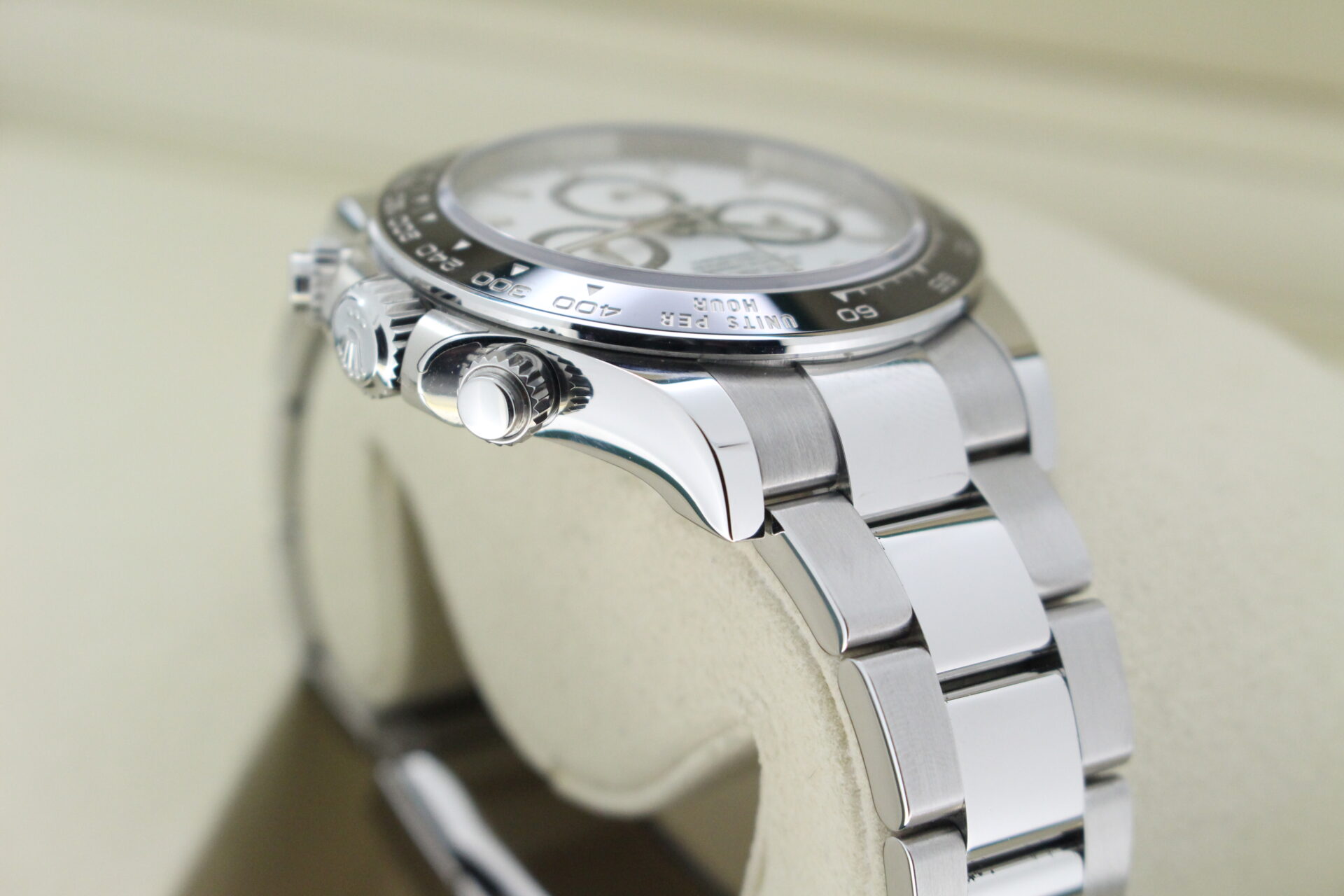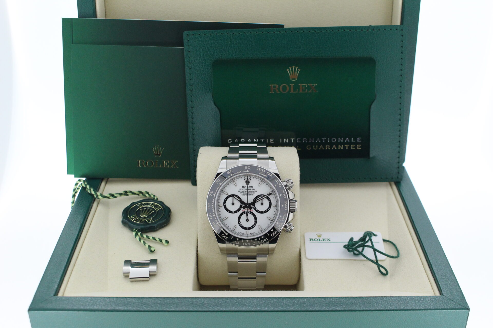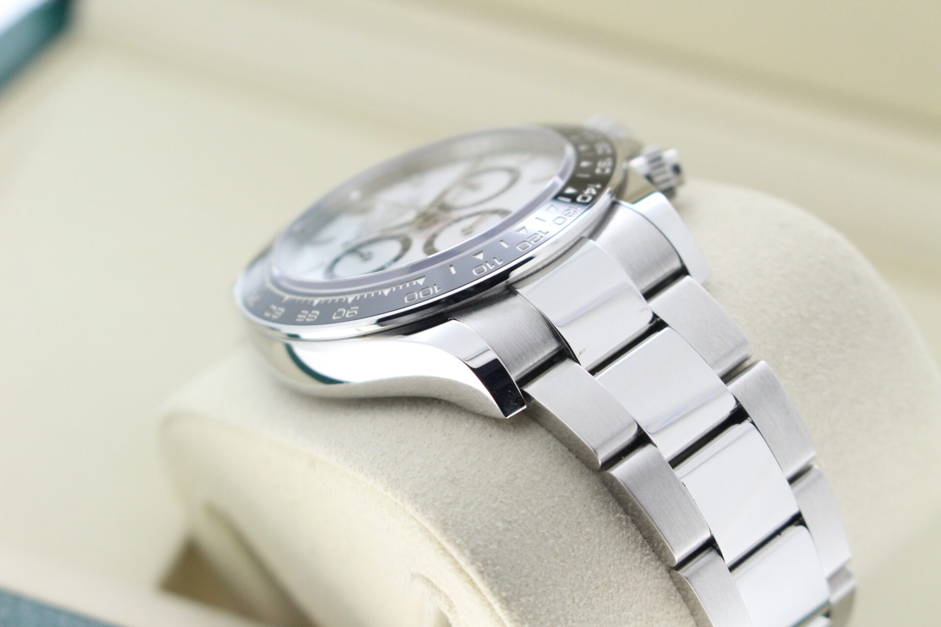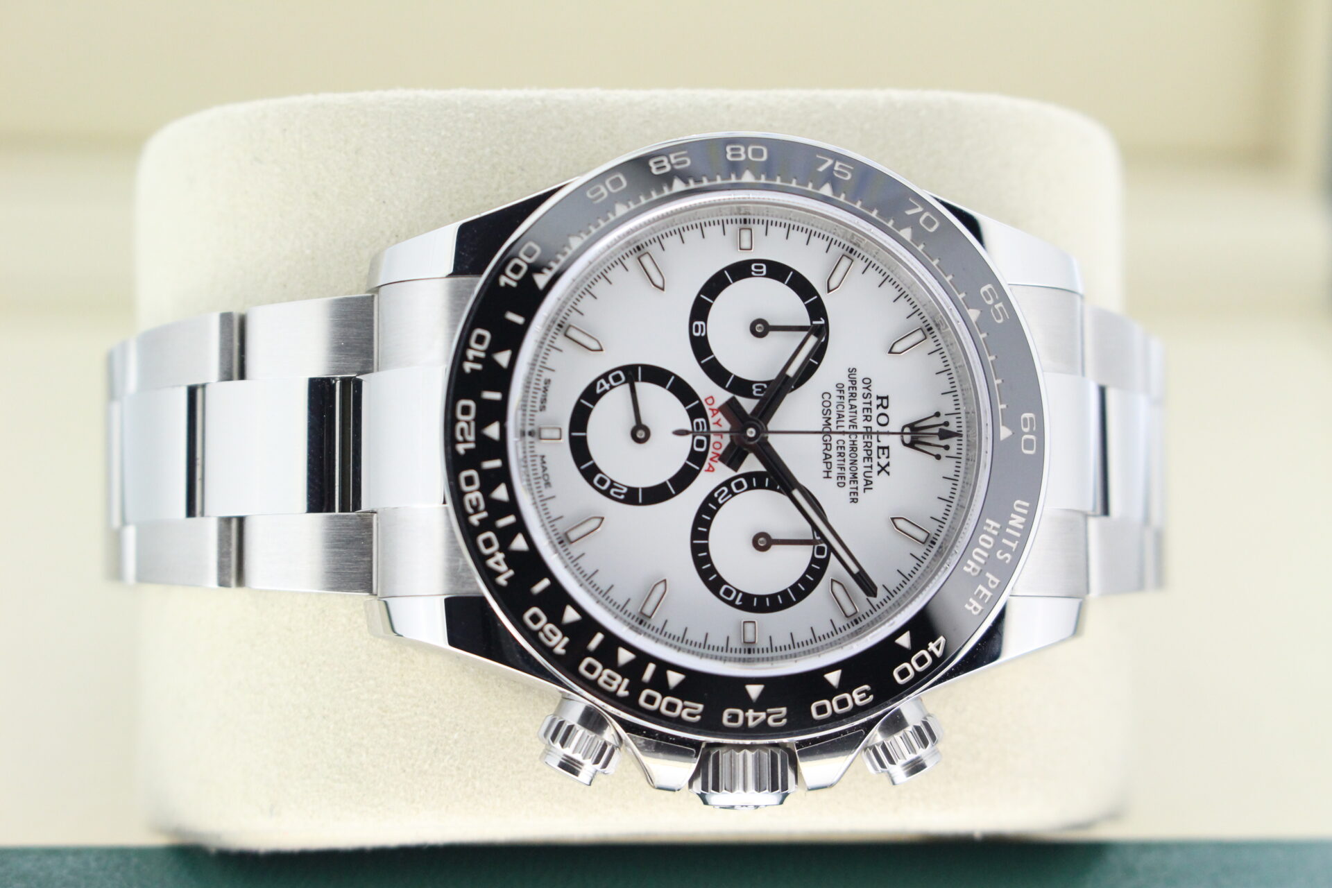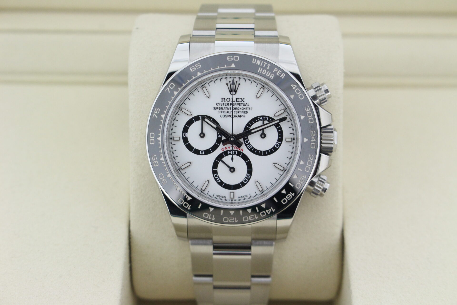A stunning new reference gents Rolex Daytona watch in stainless steel with a white ‘Panda’ dial and black ceramic bezel set with numerals.