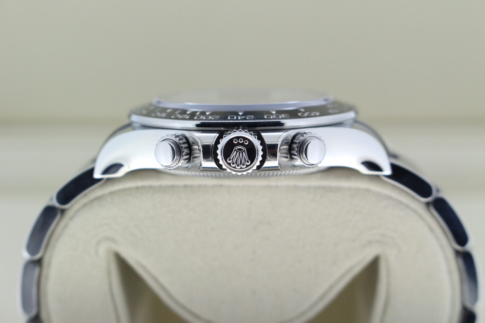 It has the stunning white dial set with 18ct white gold luminous baton markers and sub-dials, 18ct white gold Rolex crown and 18ct white gold luminous hands.