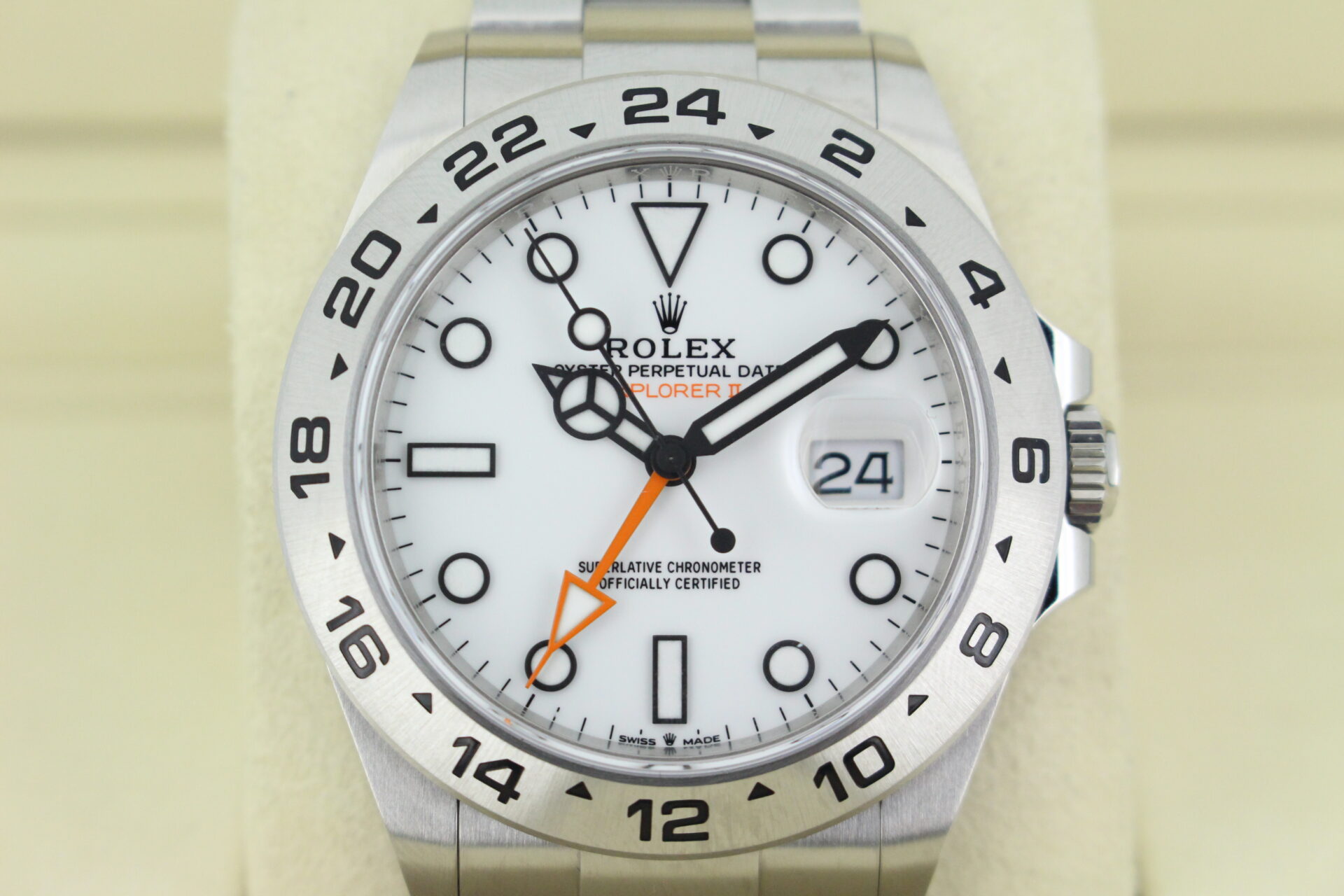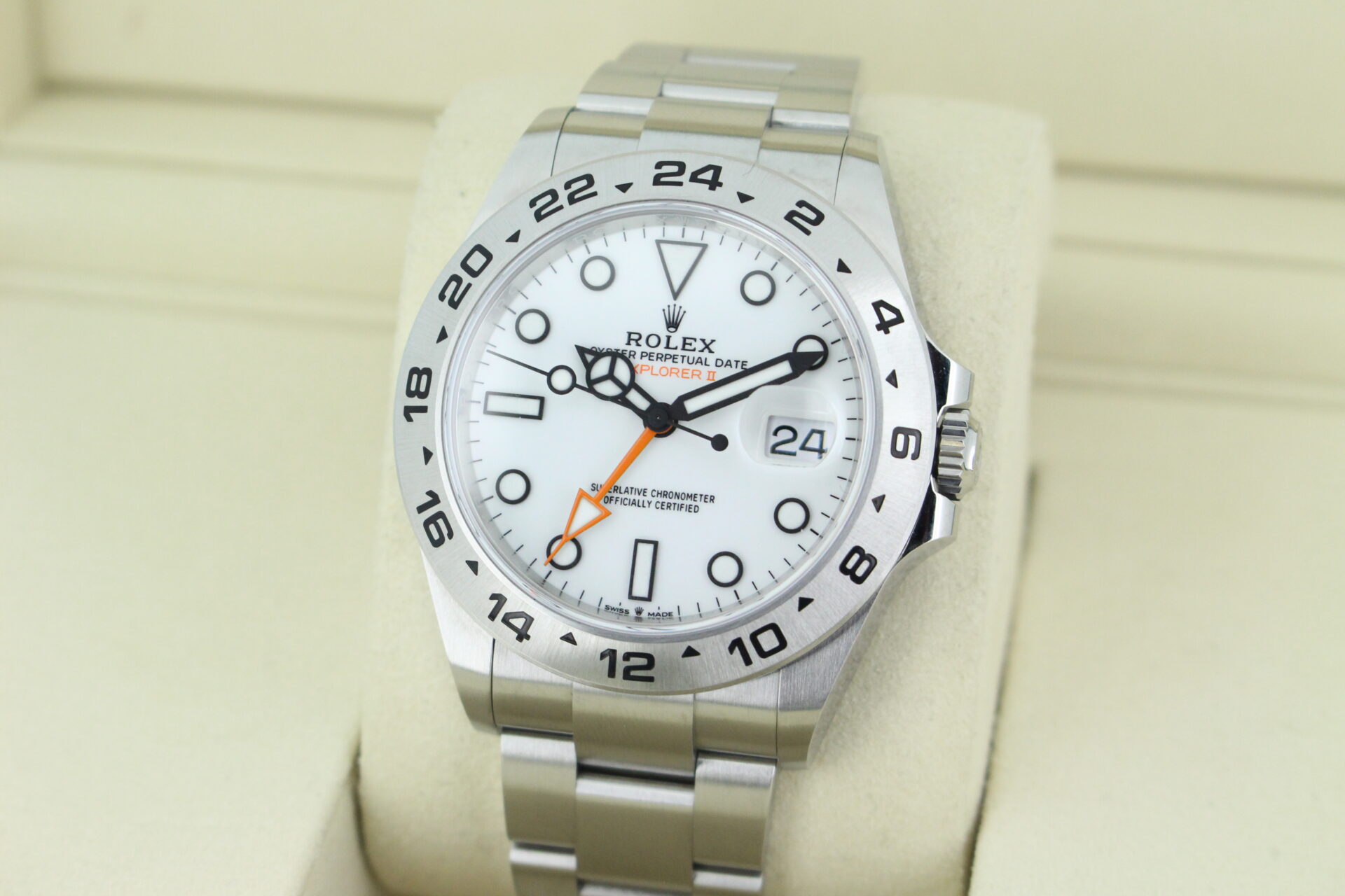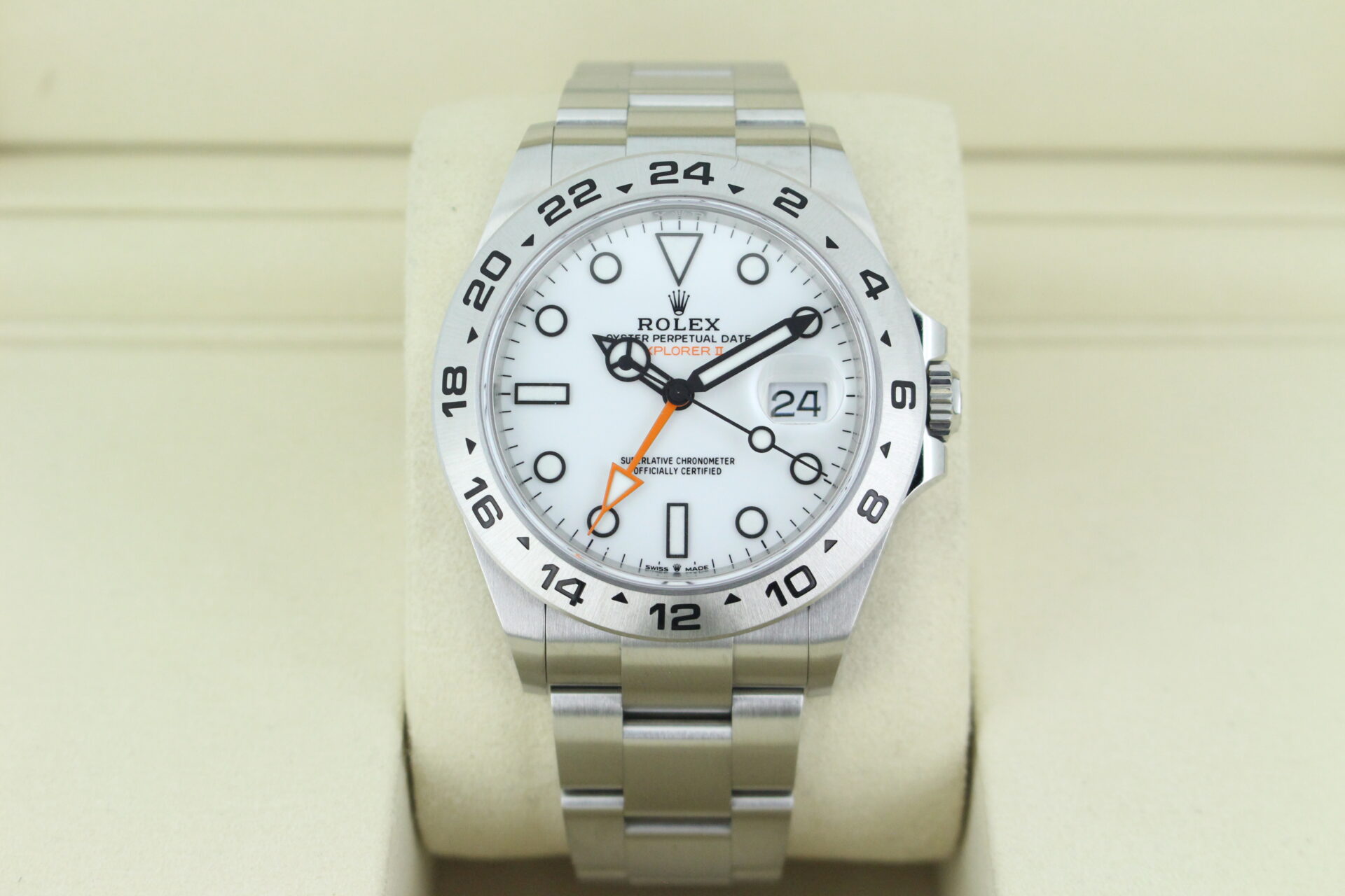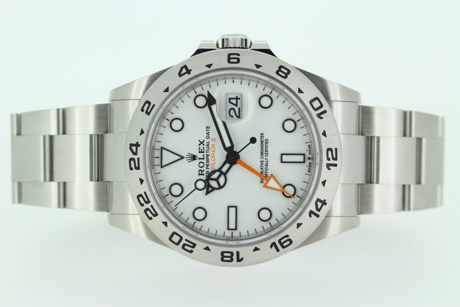 A stunning Rolex Explorer II watch in stainless steel with a white dial, an orange GMT hand and a fixed stainless steel GMT bezel.