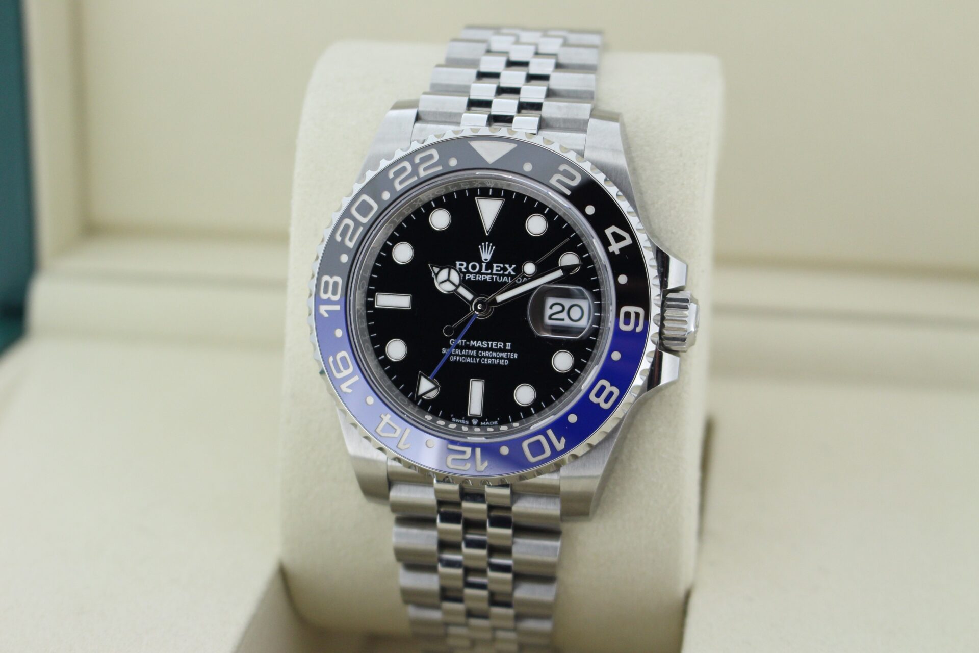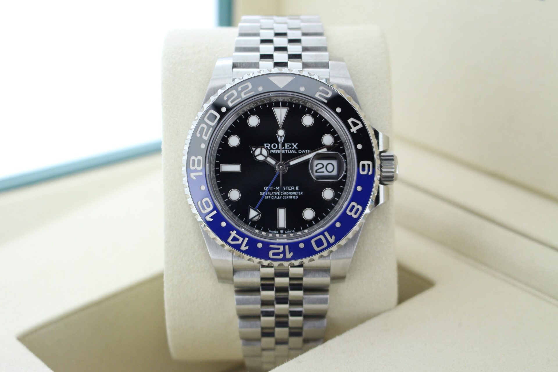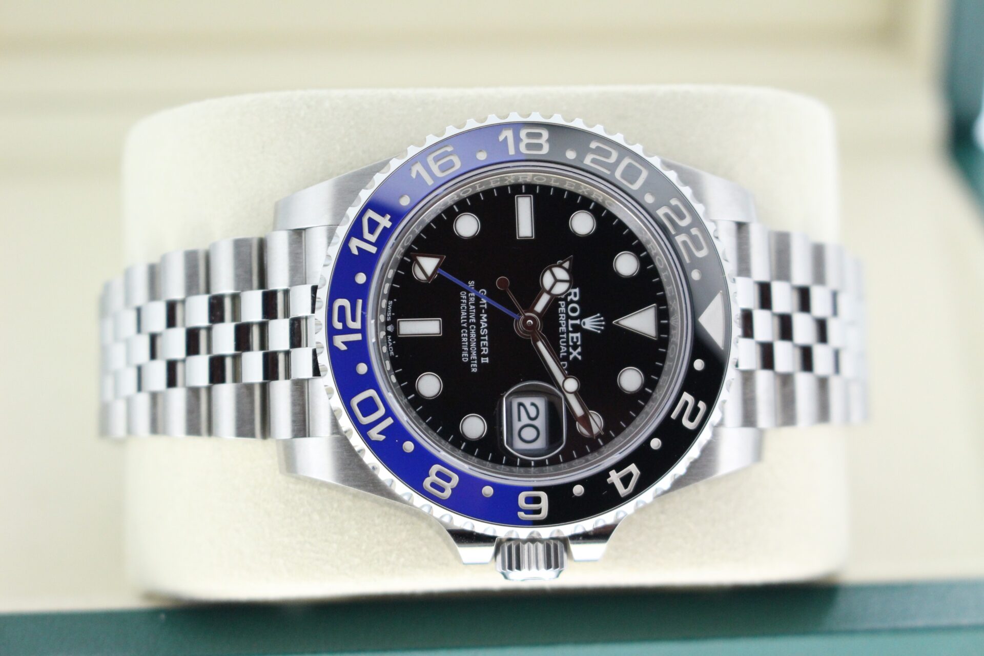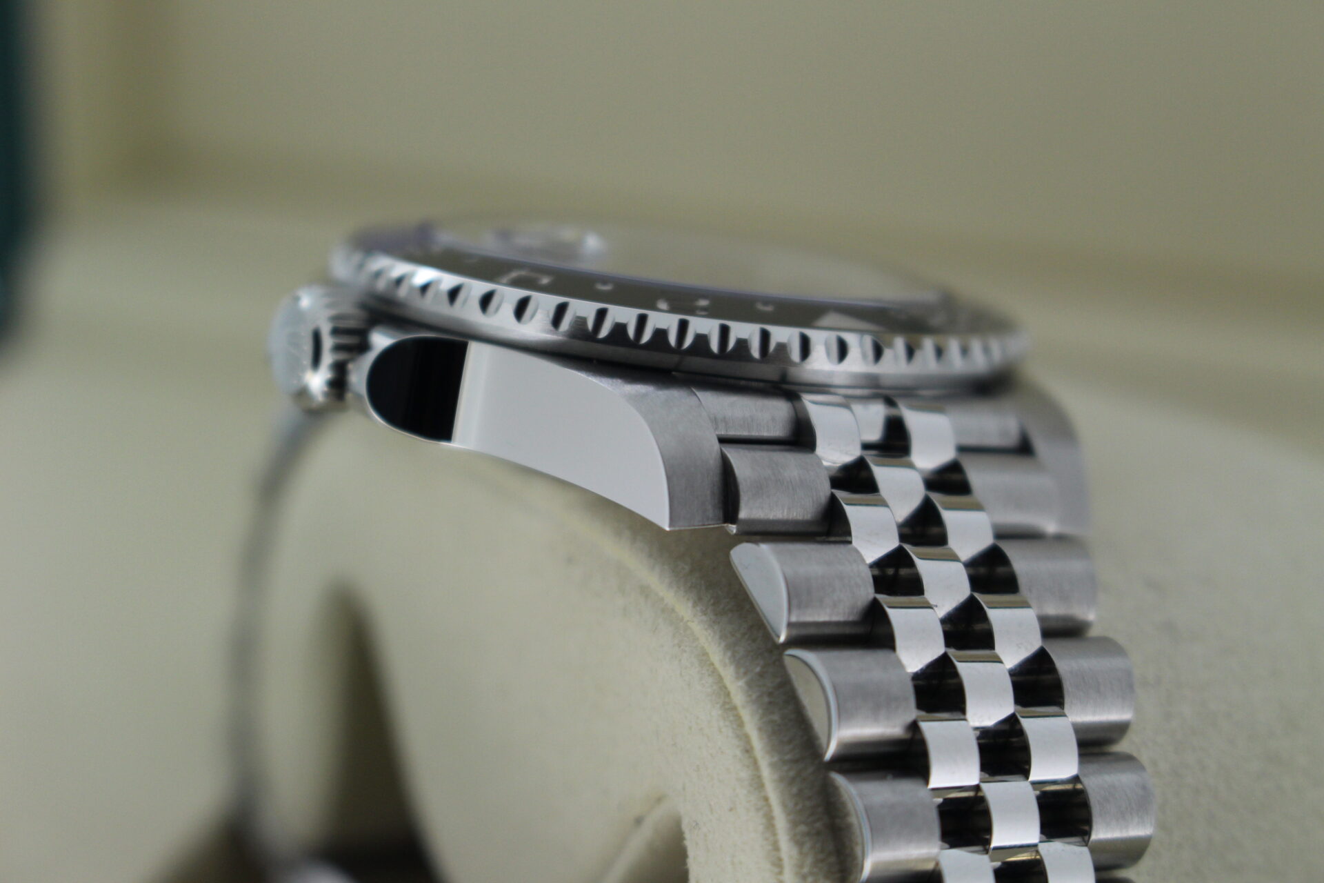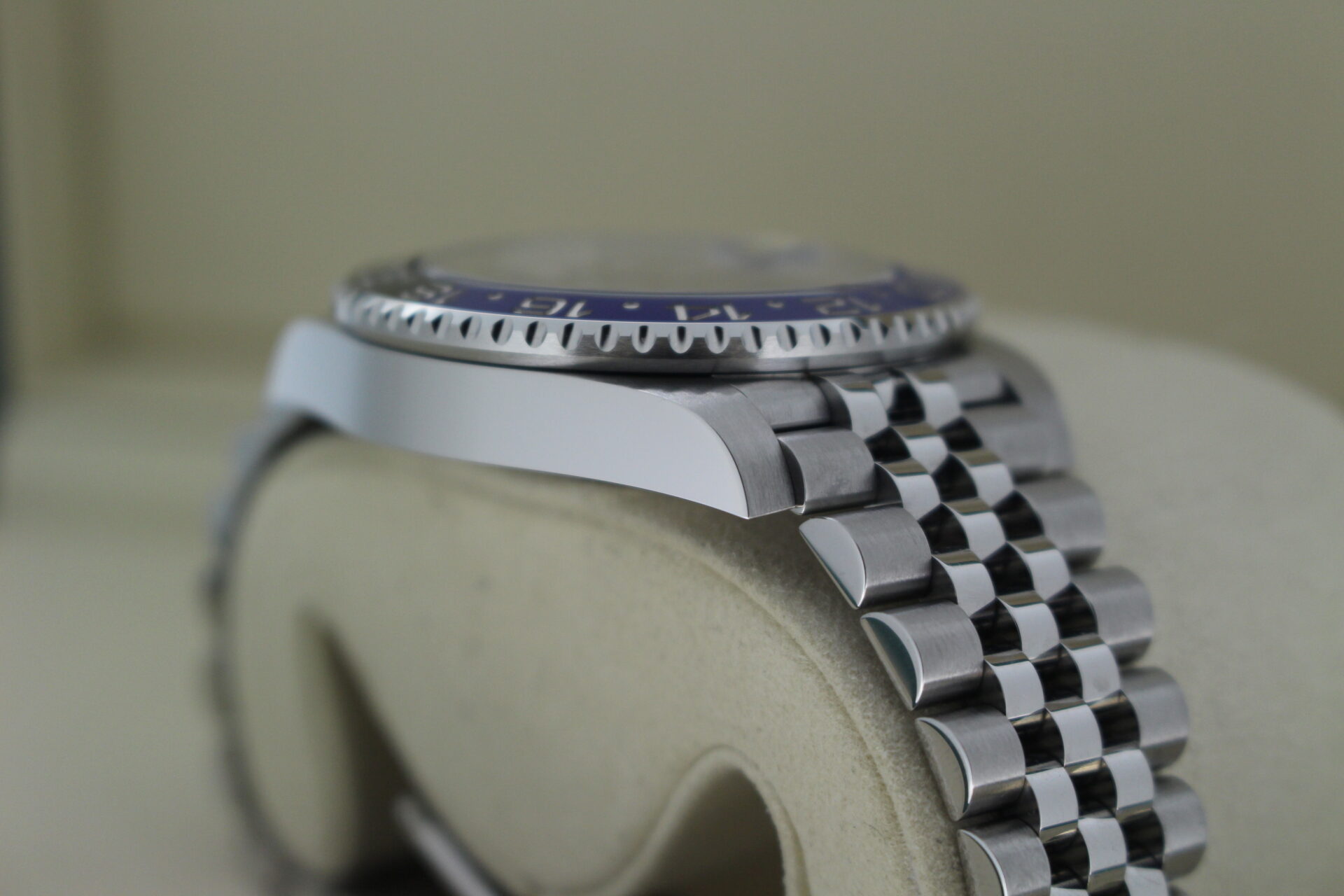 We are pleased to offer this Rolex GMT Master II “Batgirl”. Fitted on the extremely popular and sporty Rolex Jubilee bracelet.