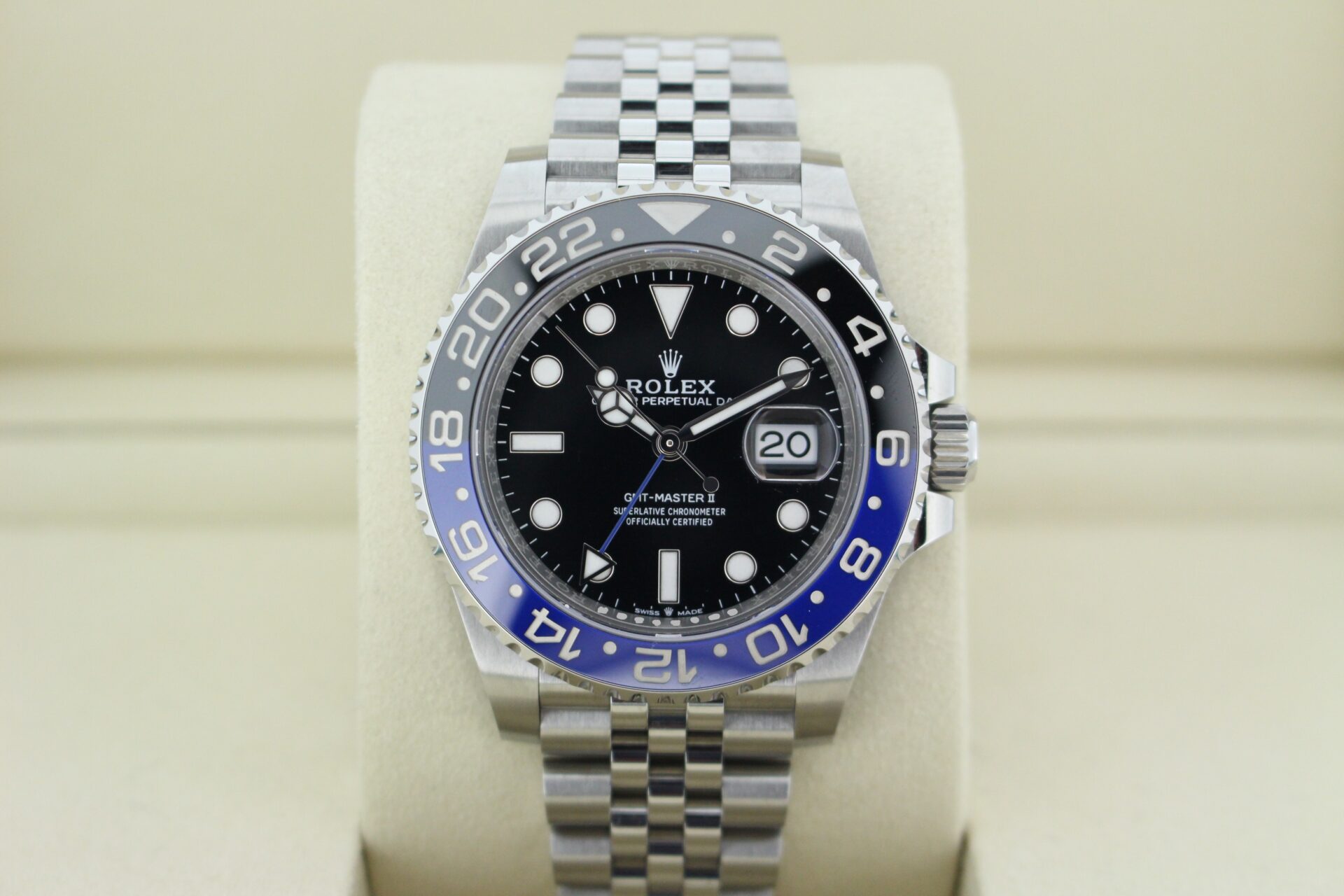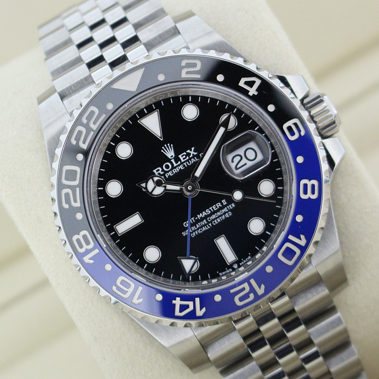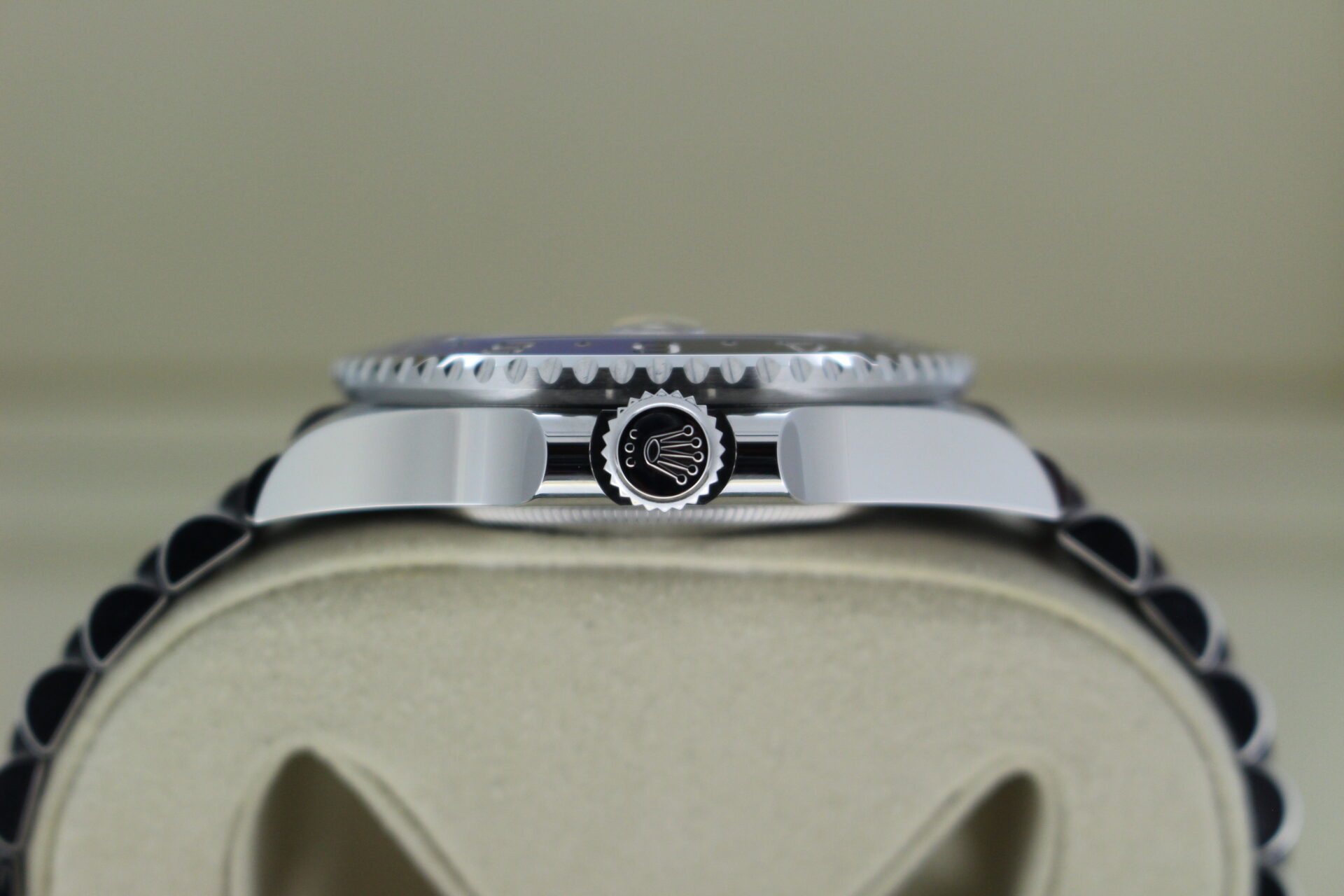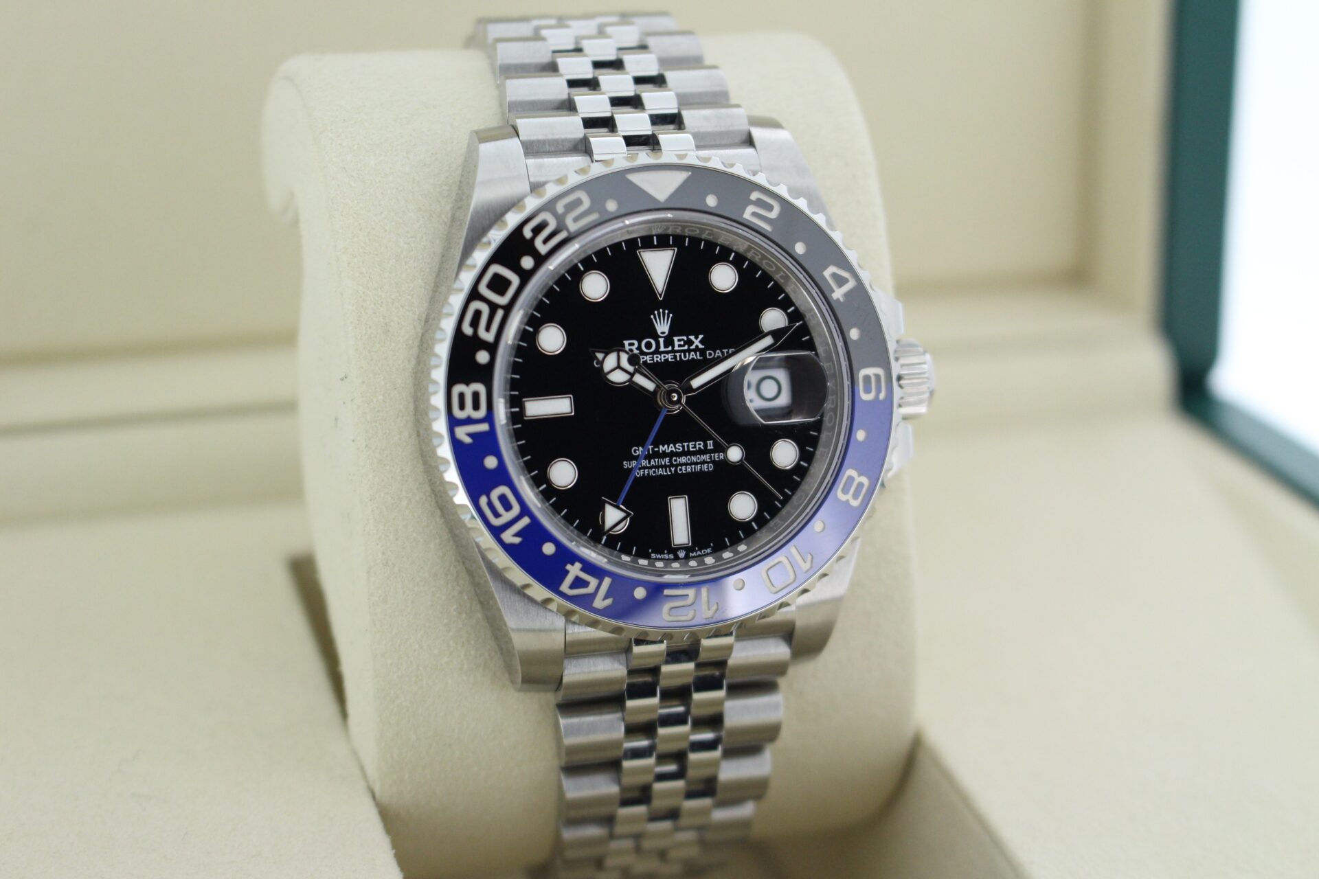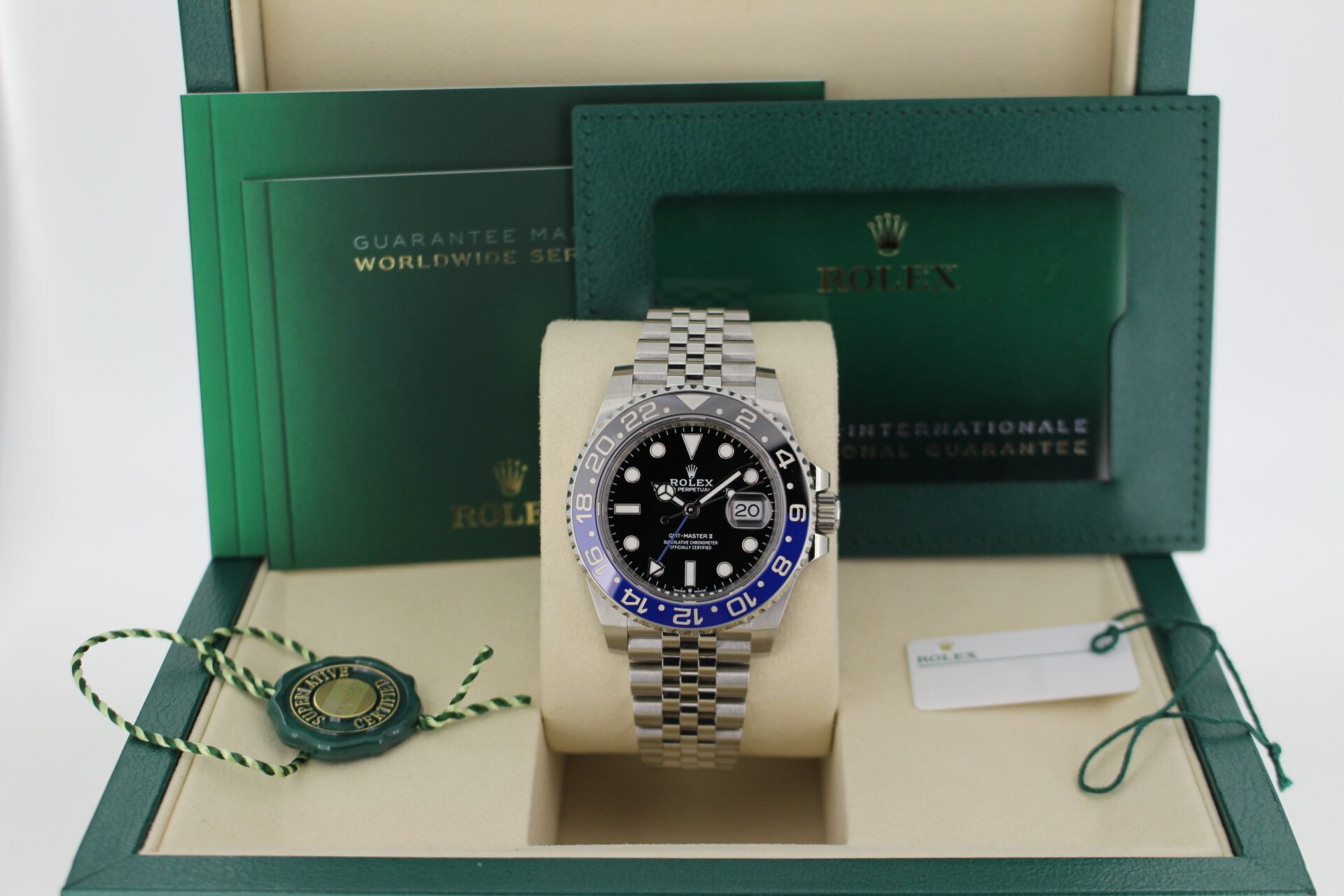 We are pleased to offer this Rolex GMT Master II “Batgirl”. Fitted on the extremely popular and sporty Rolex Jubilee bracelet.