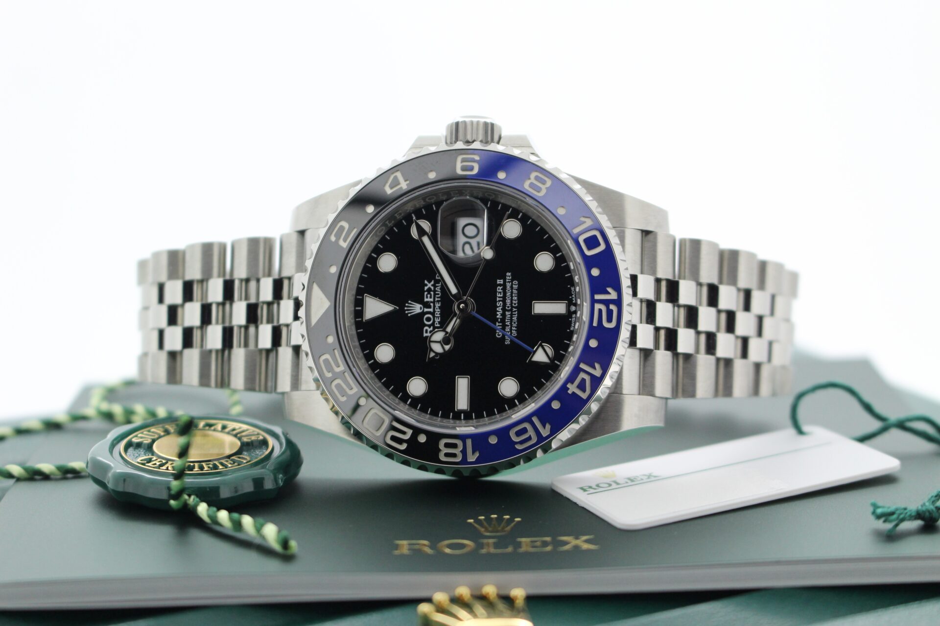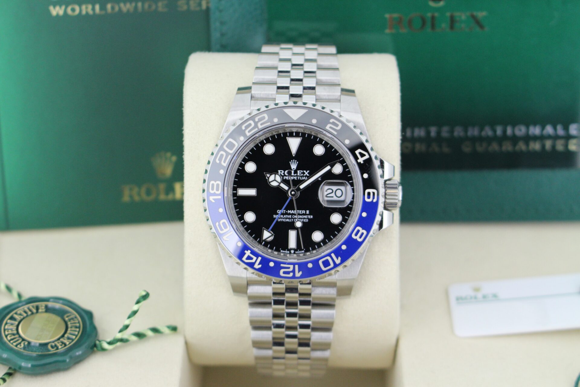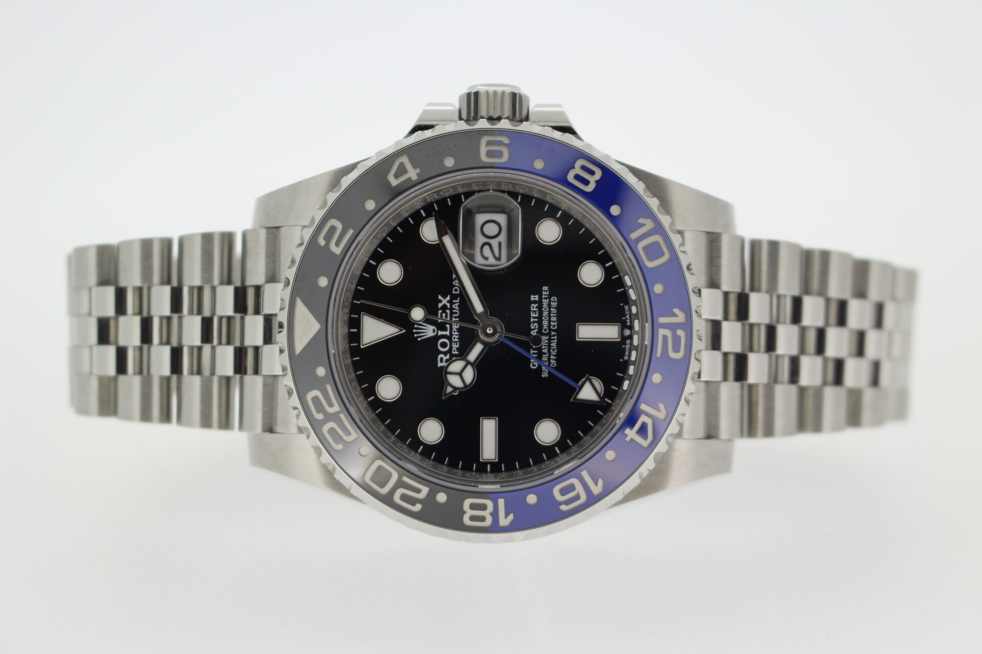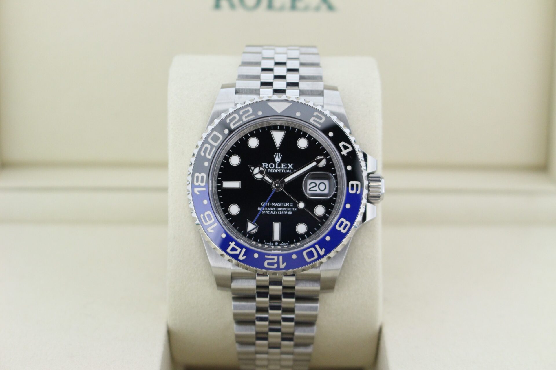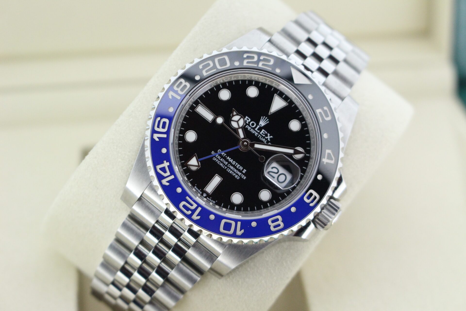 We are pleased to offer this Rolex GMT Master II “Batgirl”. Fitted on the extremely popular and sporty Rolex Jubilee bracelet.
