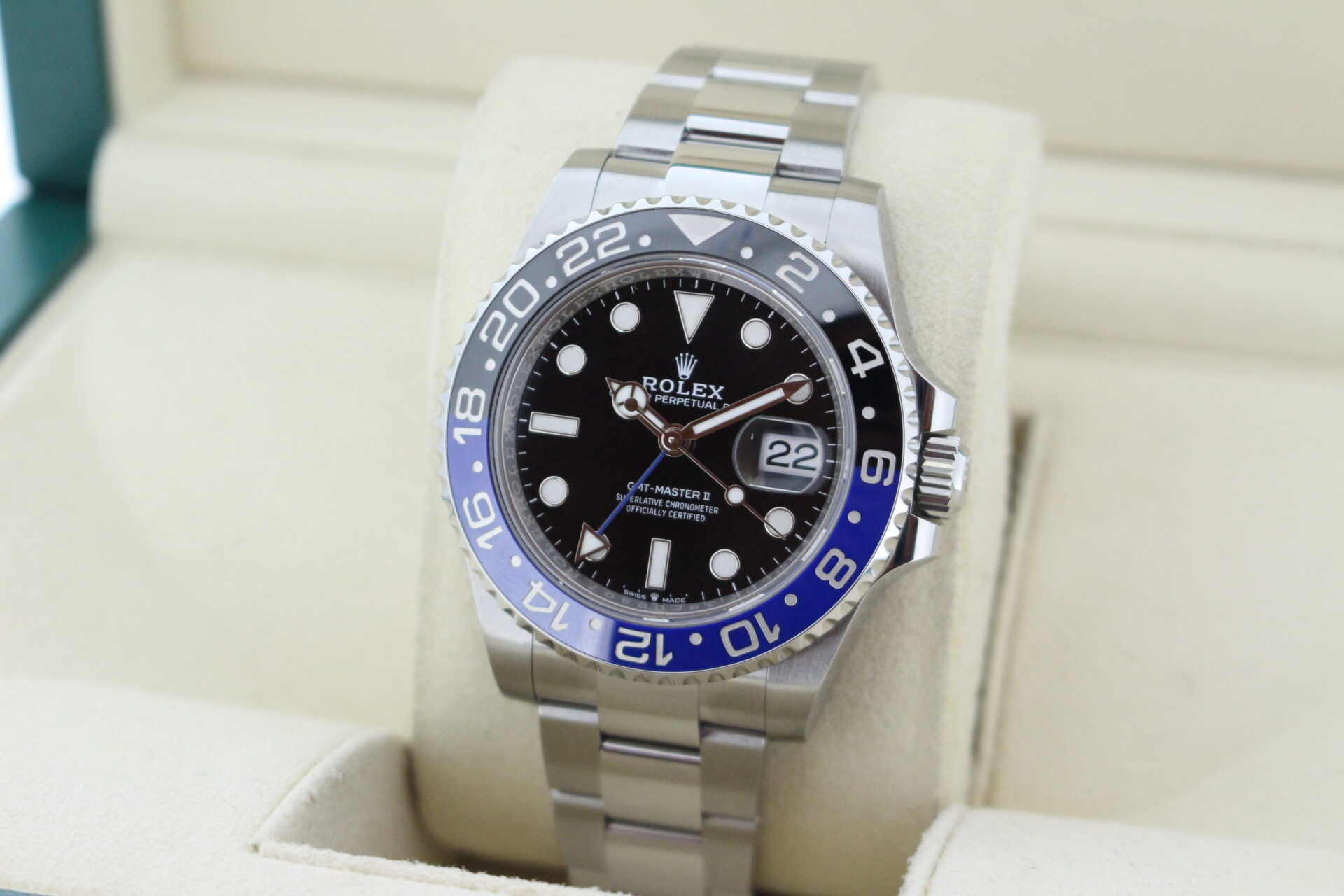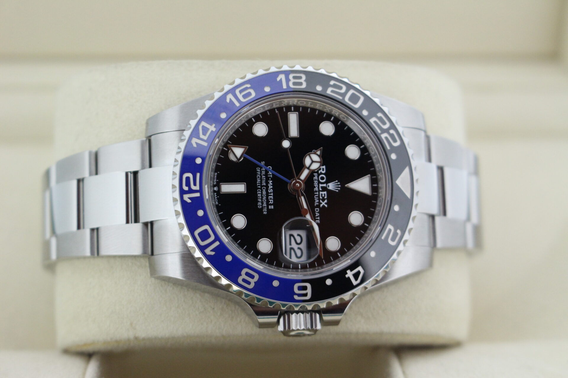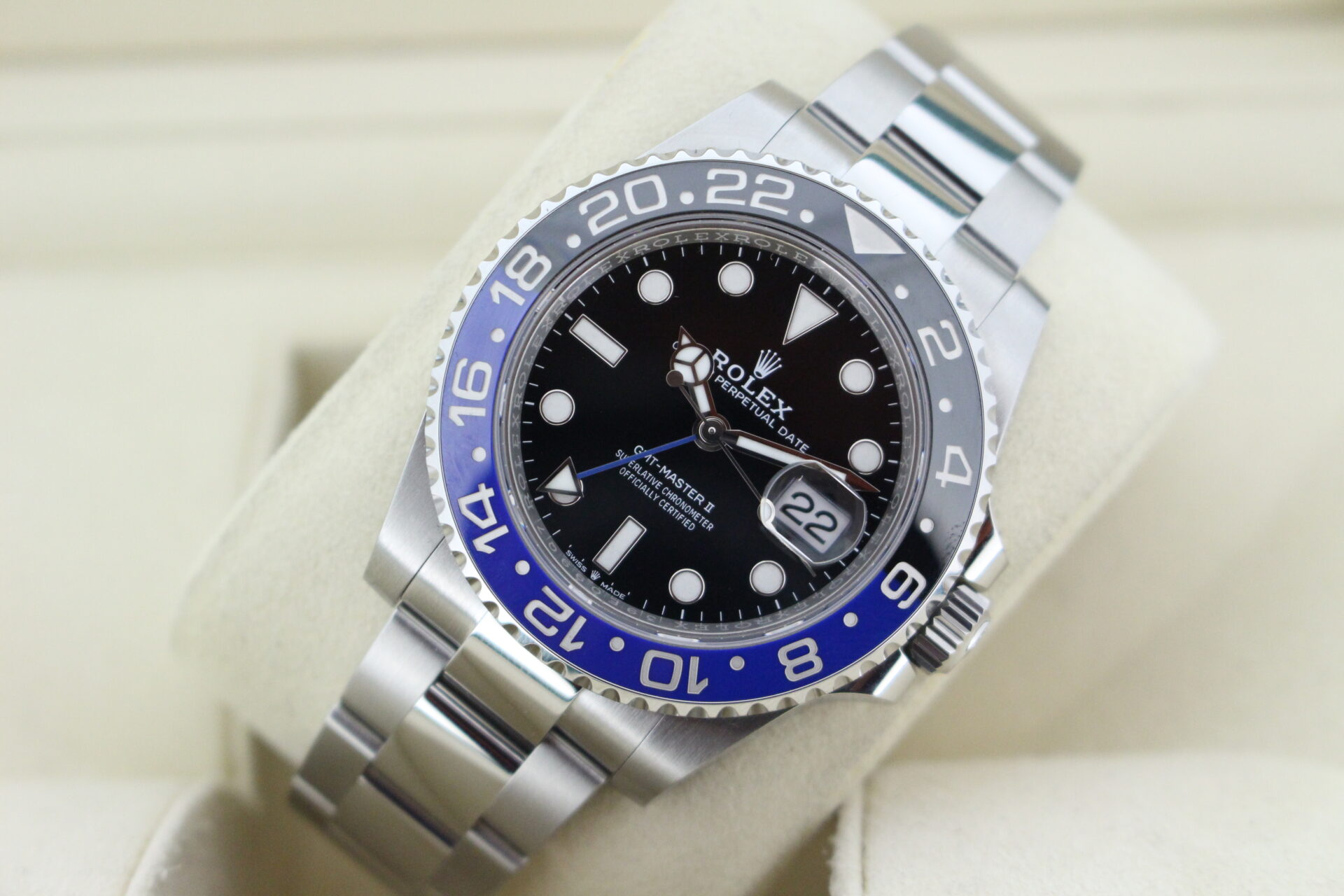 A stunning Rolex GMT Master II Batman. A Stainless Steel watch with a blue and black ceramic bezel with an additional blue GMT hand.