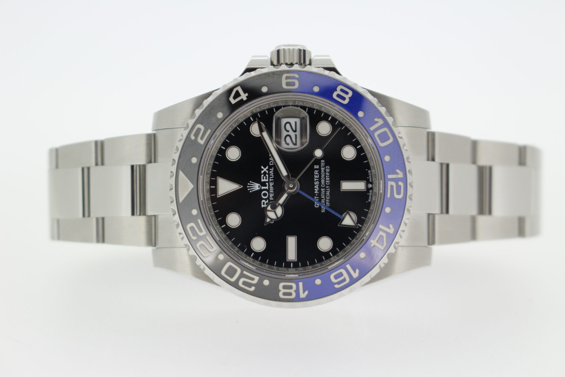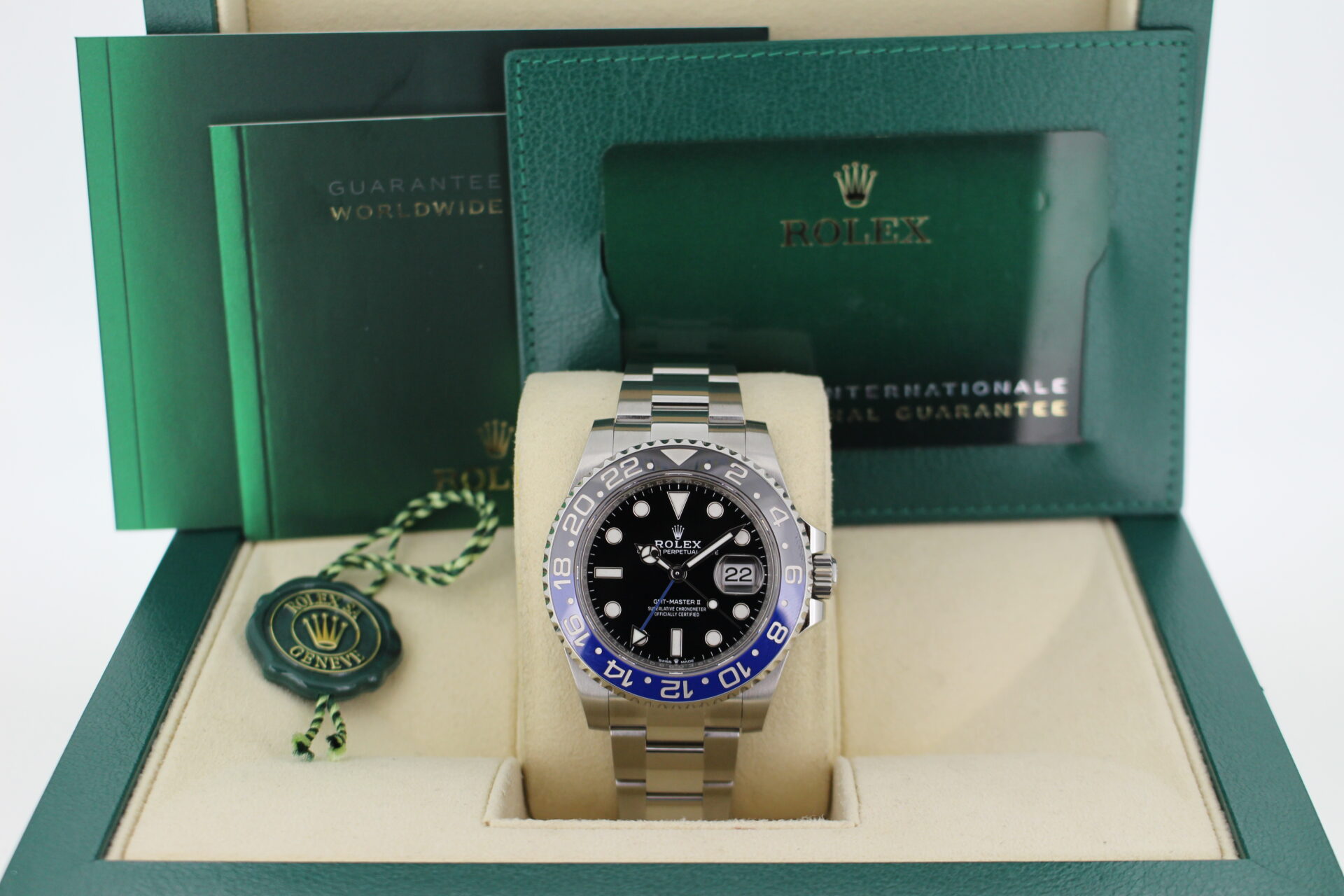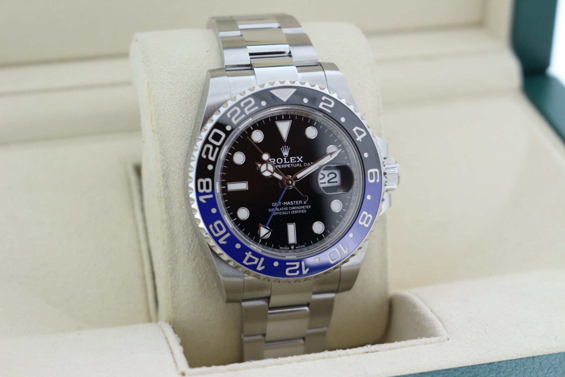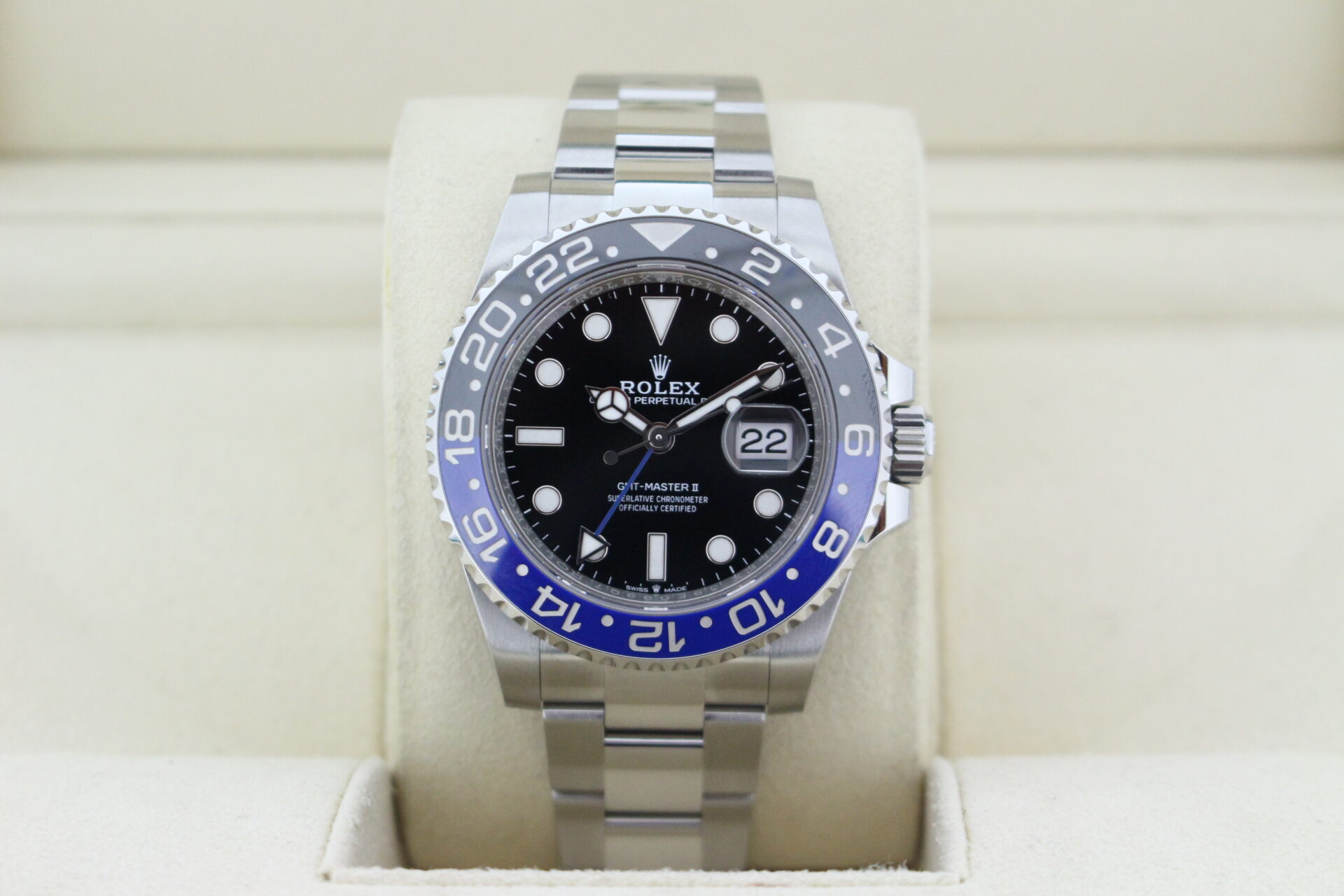 A stunning Rolex GMT Master II Batman. A Stainless Steel watch with a blue and black ceramic bezel with an additional blue GMT hand.