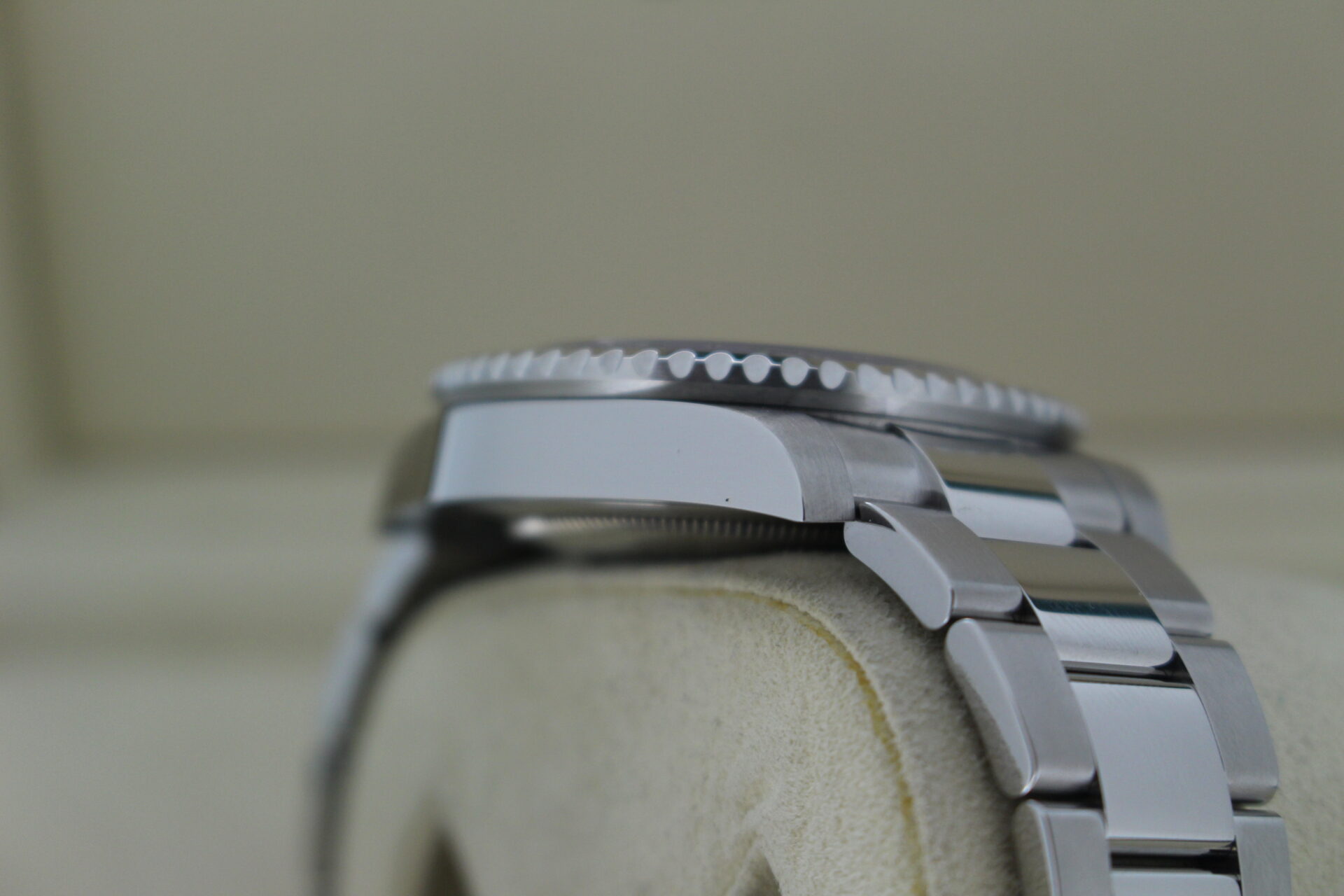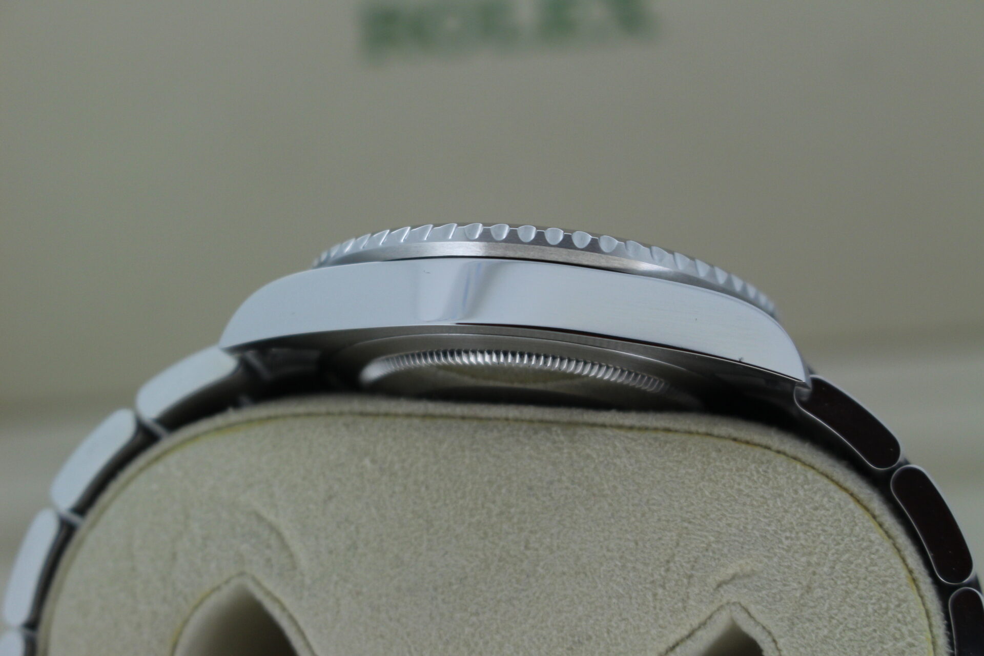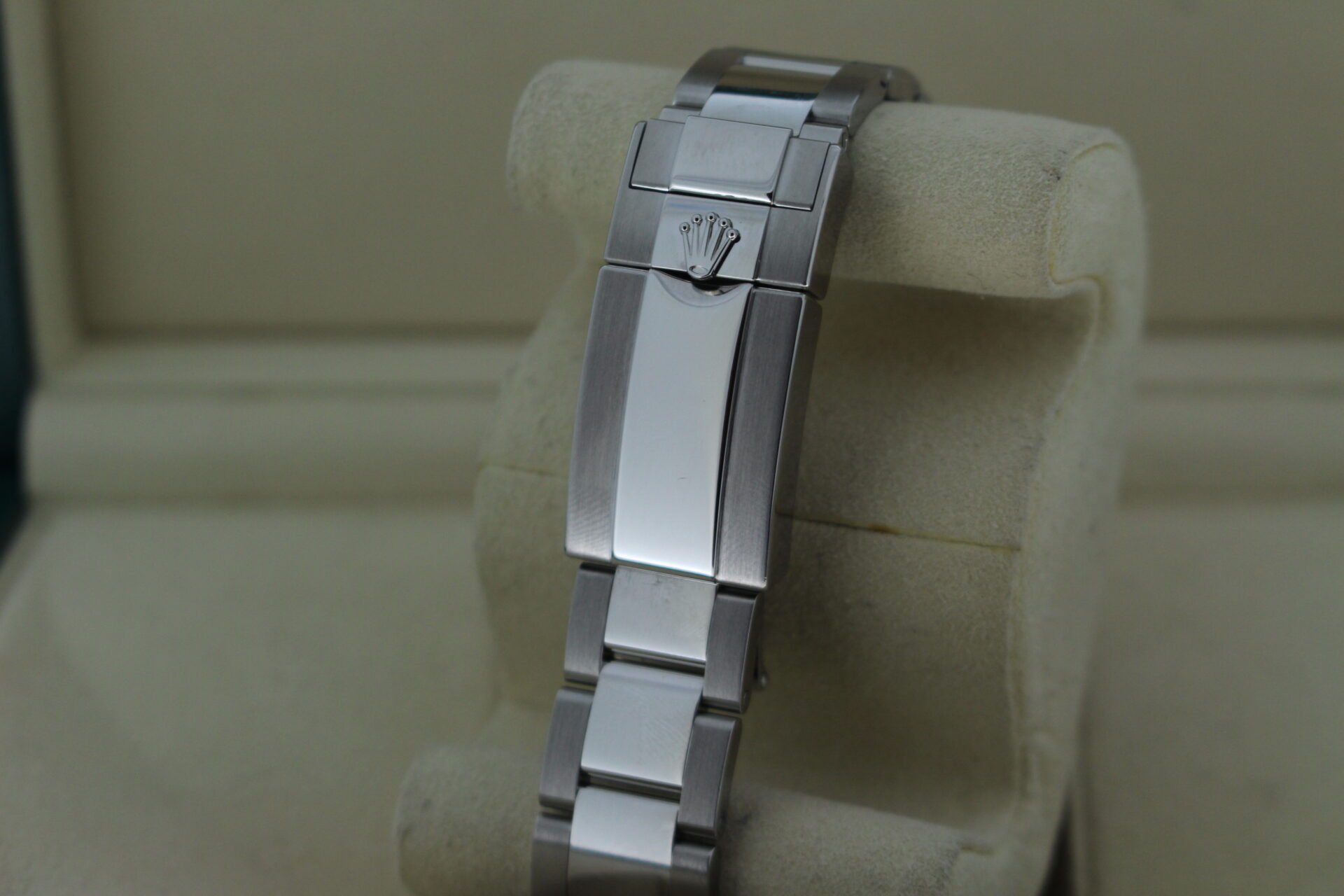 It has a stunning factory Rolex black dial set with luminous baton and dot markers in 18ct white gold, Rolex crown and 18ct white gold luminous hands. This is a very rich looking and easy to read factory dial.