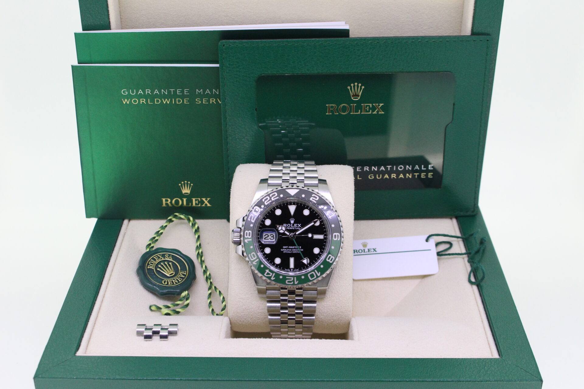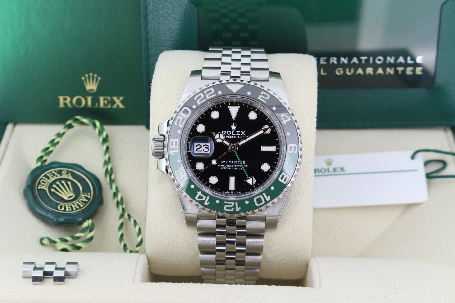 This particular watch comes as a full set from new including both inner and outer boxes, both swing tags, booklets and Rolex warranty card stamped October 2023.