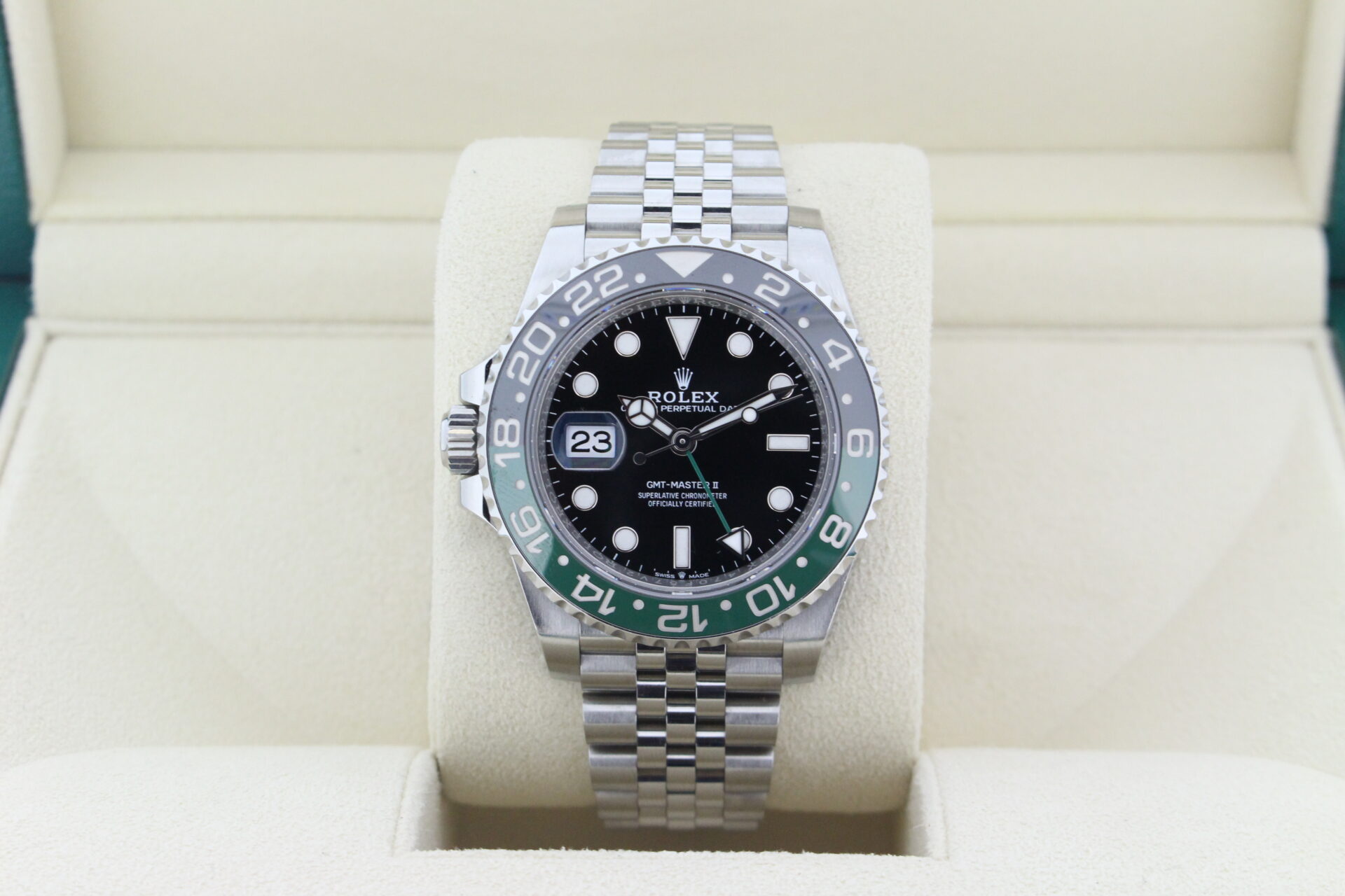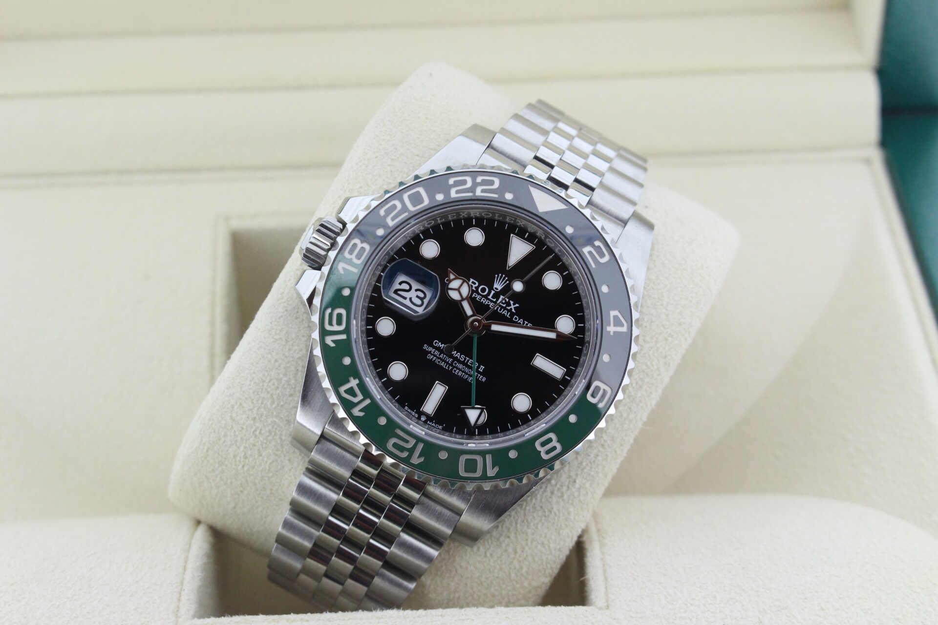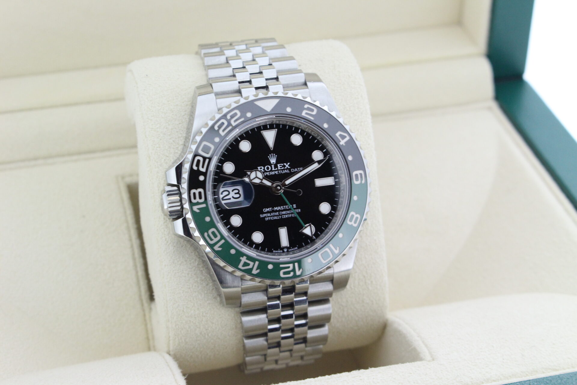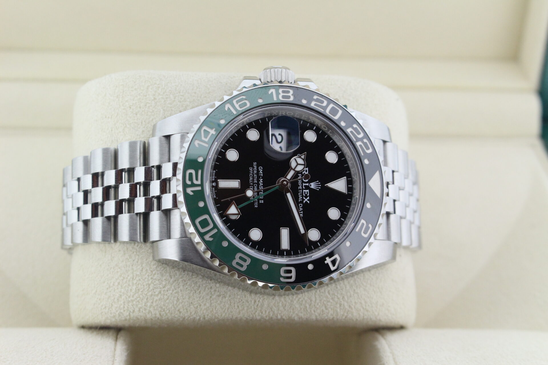 A stunning Rolex GMT Master II “Left hand drive” Sprite. Stainless Steel watch with a green and black ceramic bezel with the additional green GMT hand.