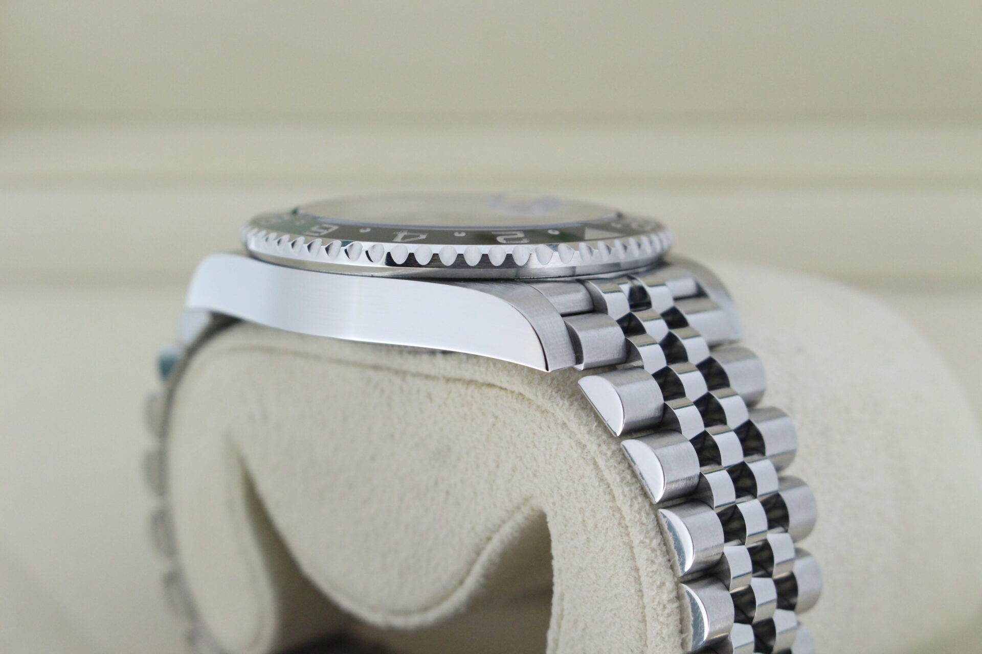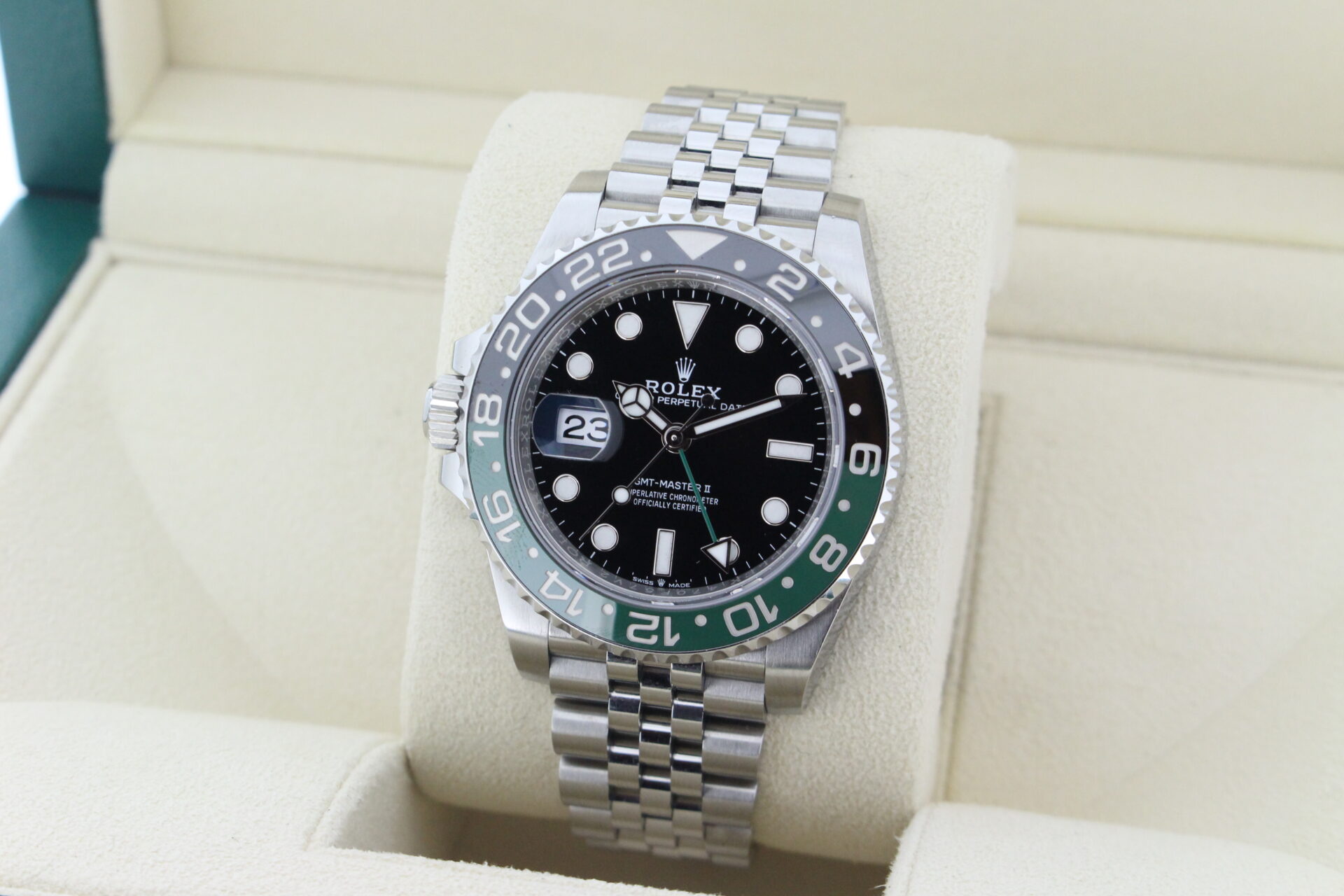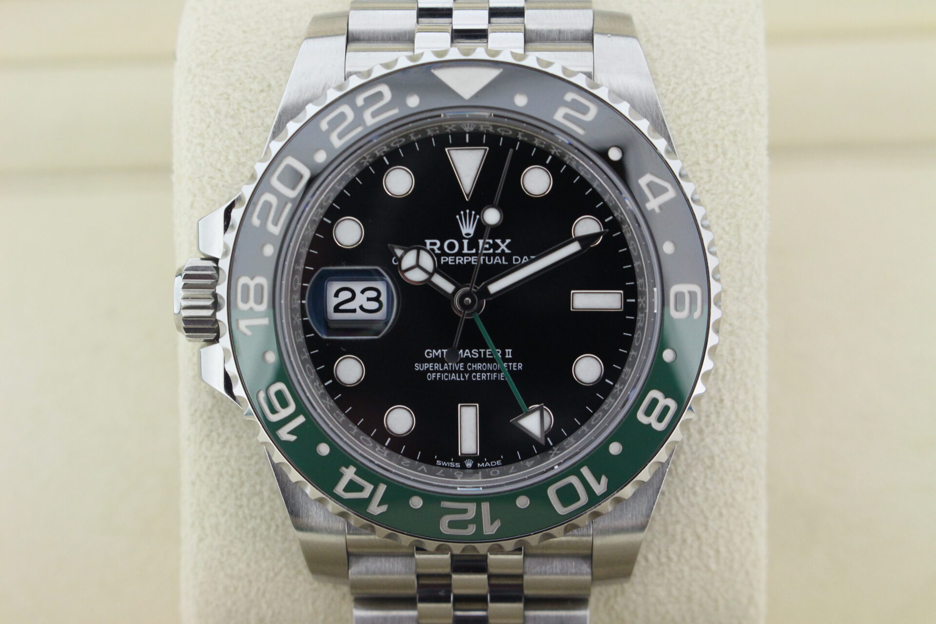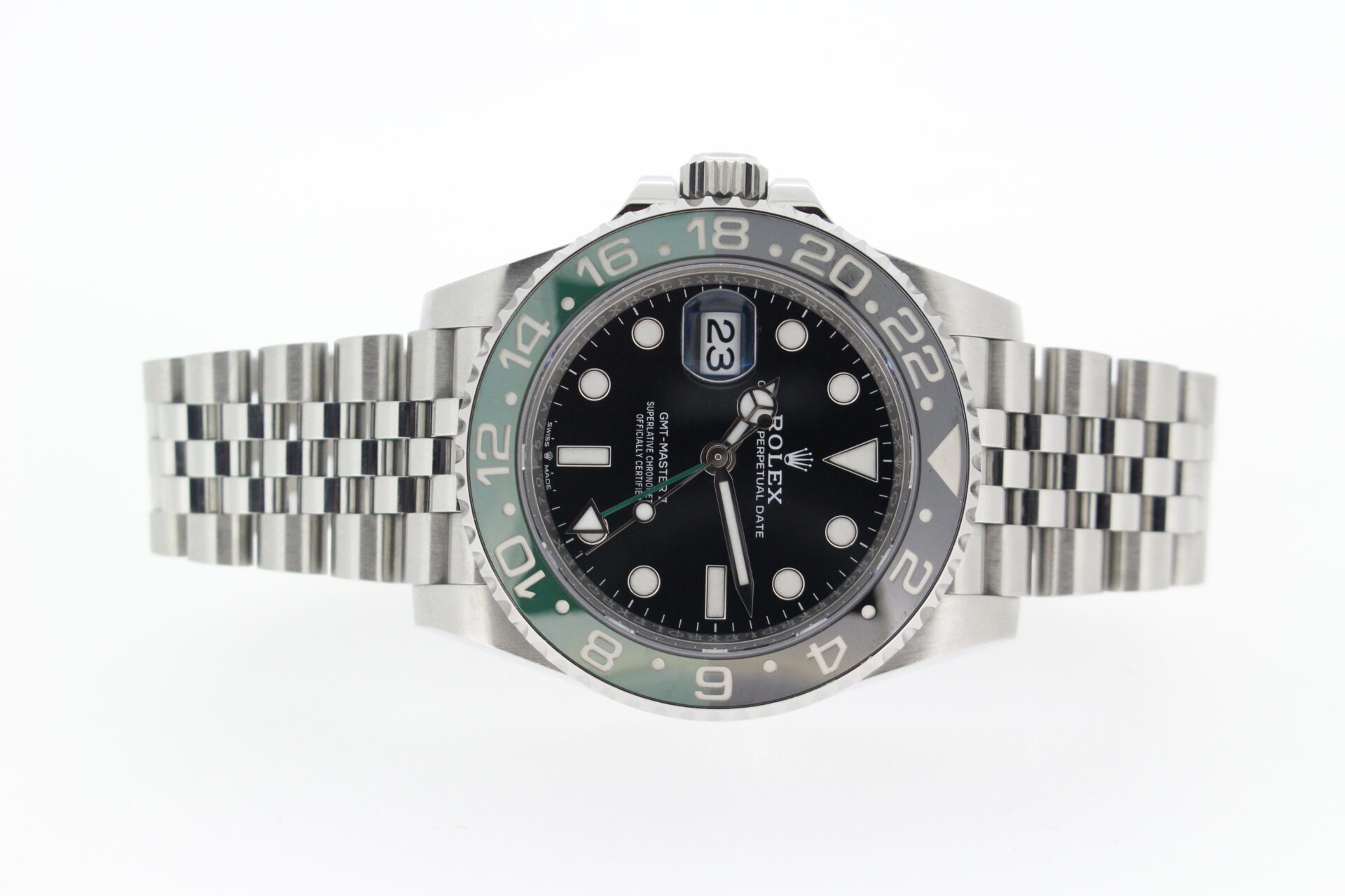 A stunning Rolex GMT Master II “Left hand drive” Sprite. Stainless Steel watch with a green and black ceramic bezel with the additional green GMT hand.