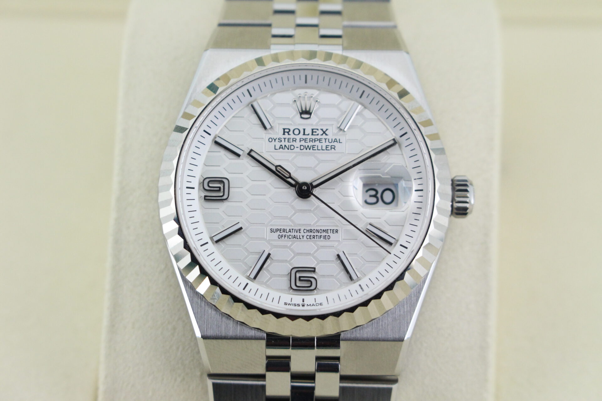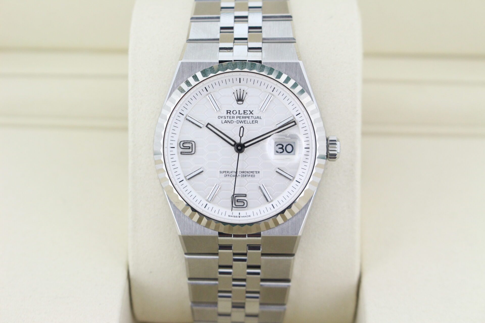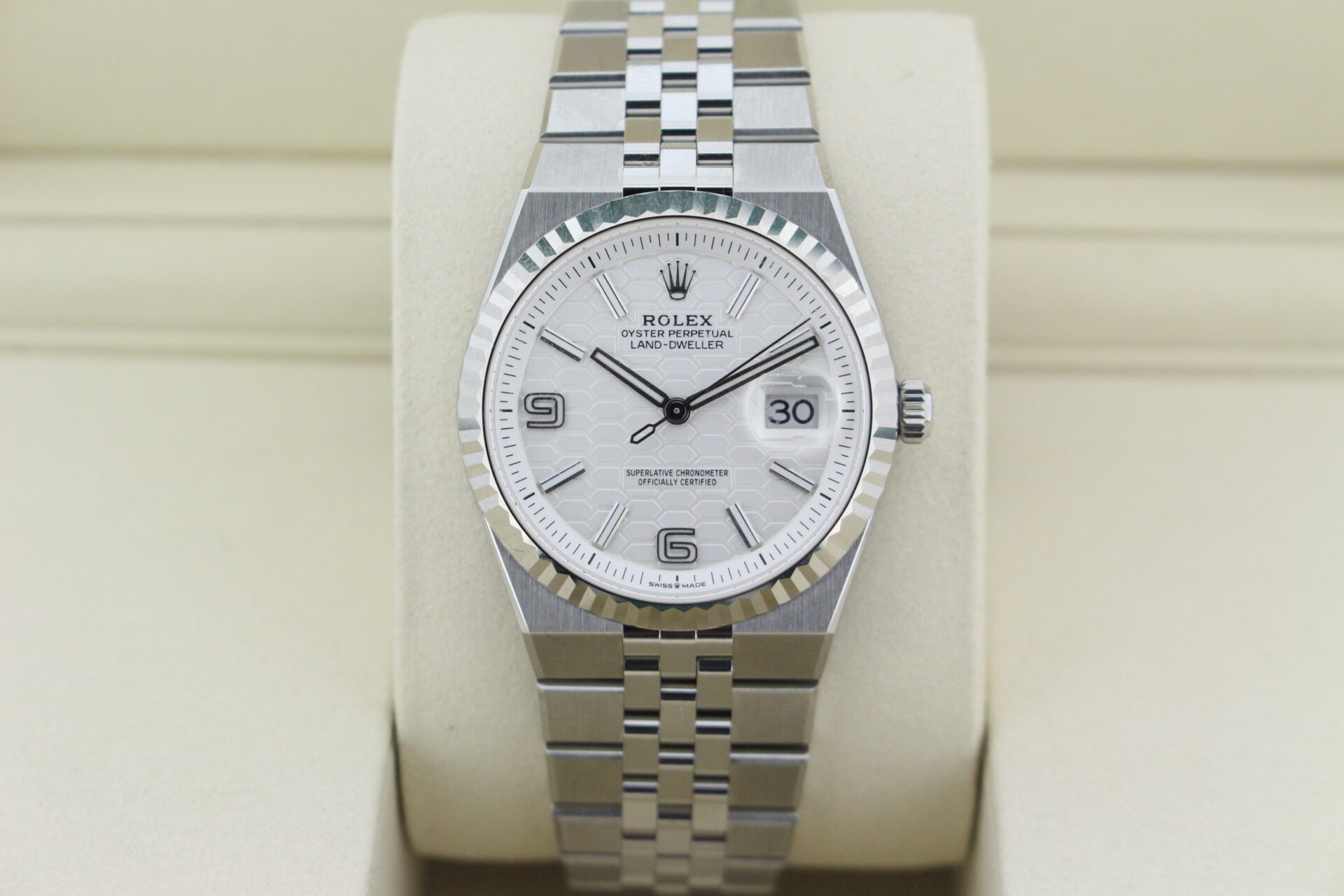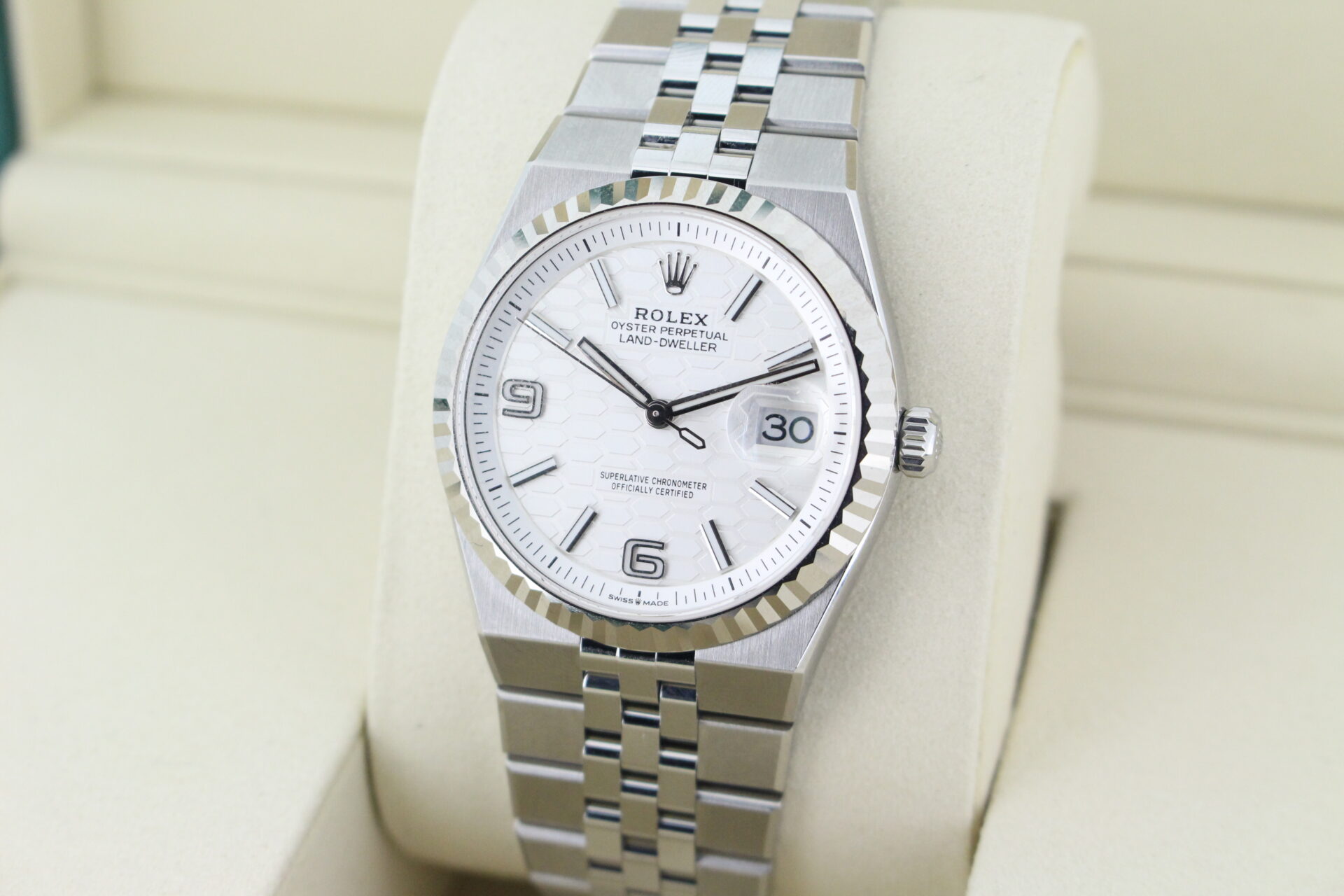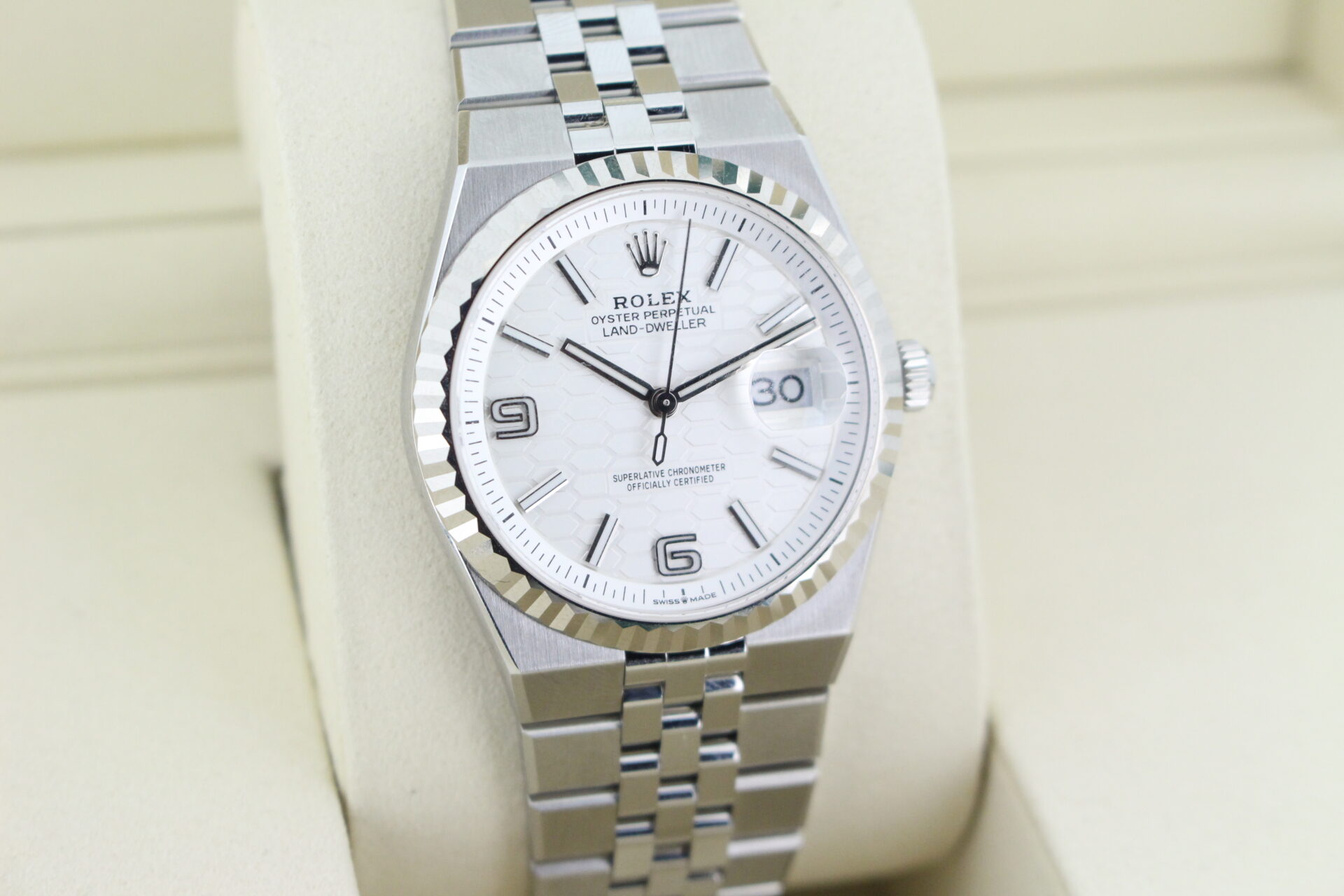 The stunning new release Rolex Land-Dweller 36 coming in stainless steel with an 18ct white gold fluted bezel and the integrated flat jubilee bracelet.