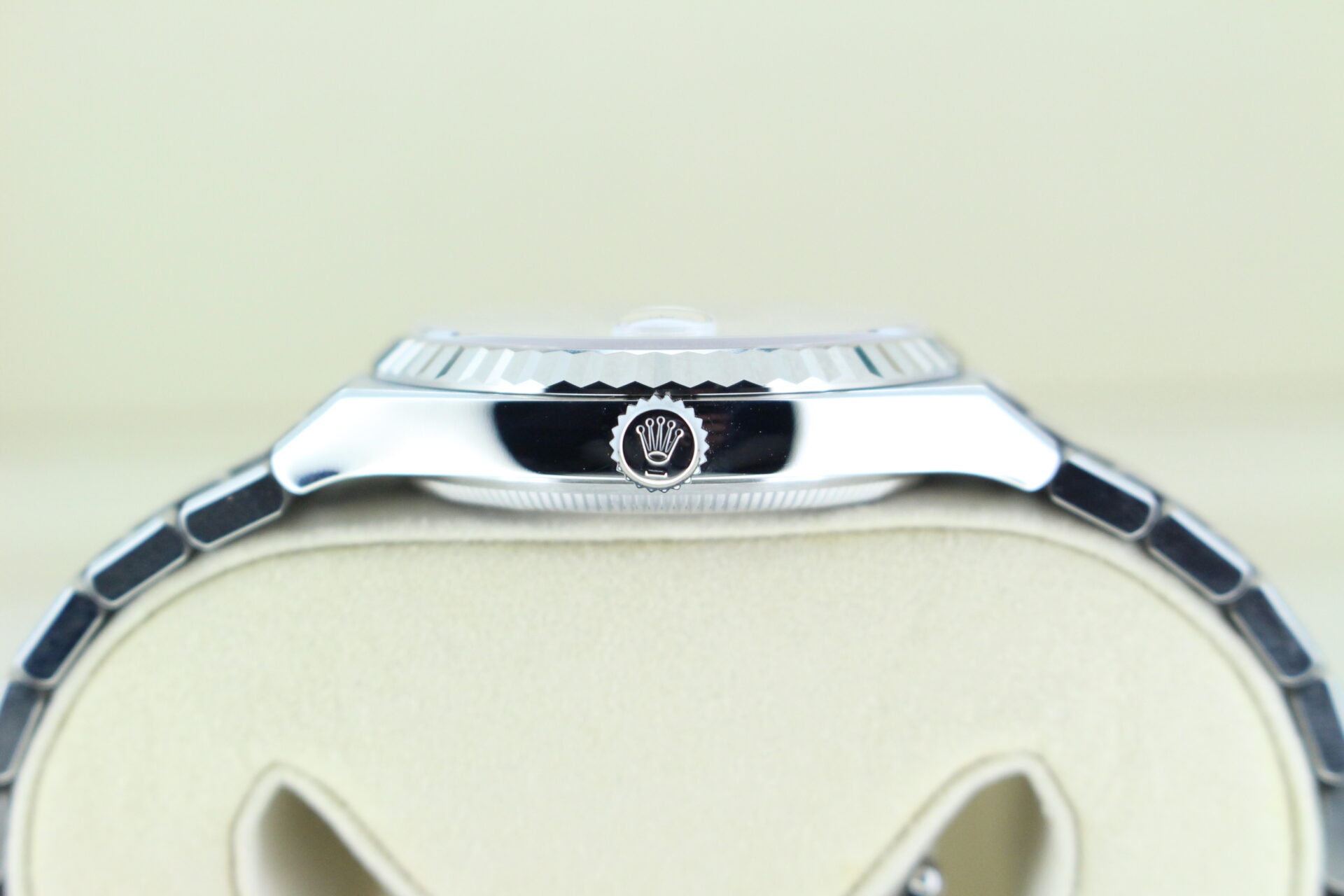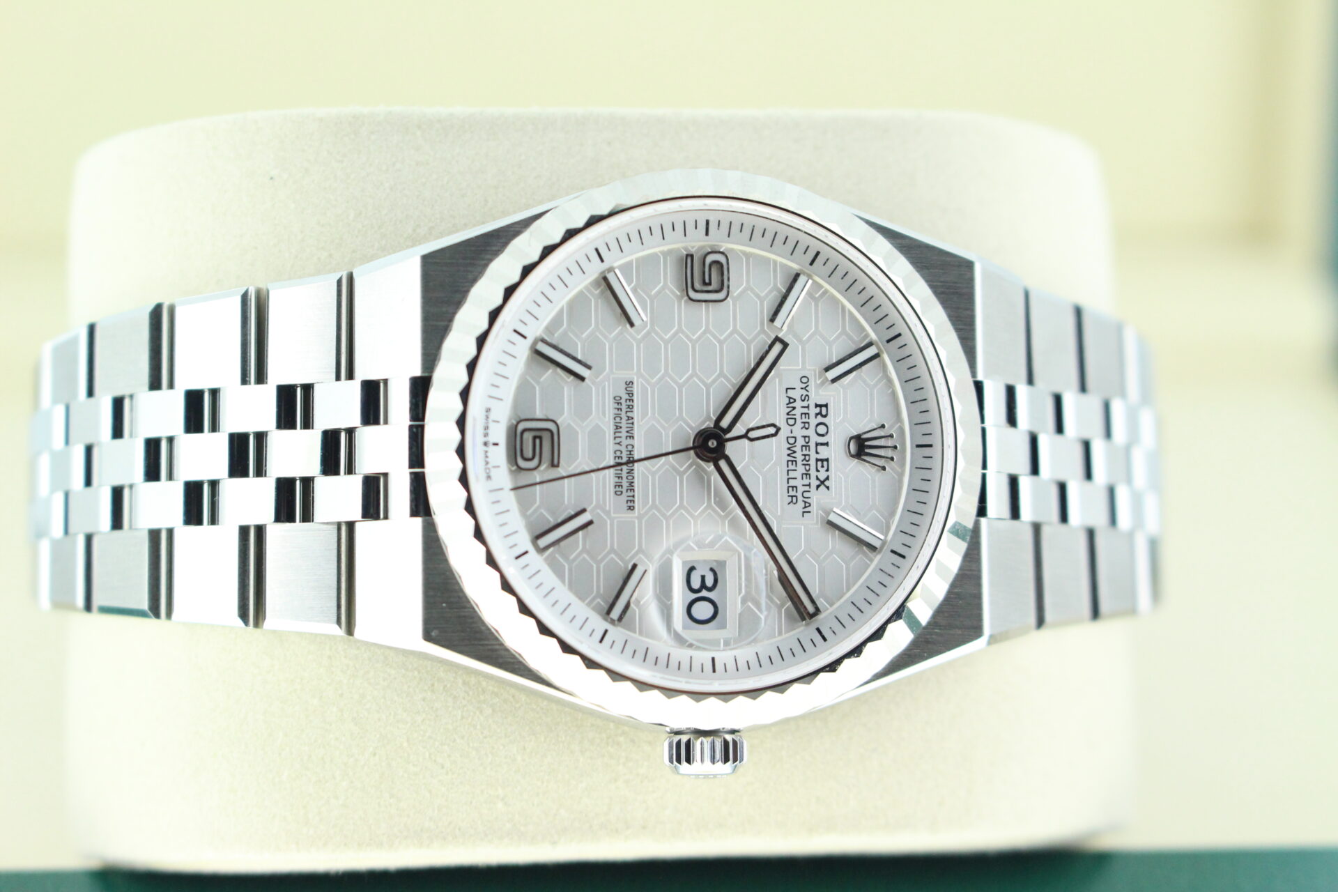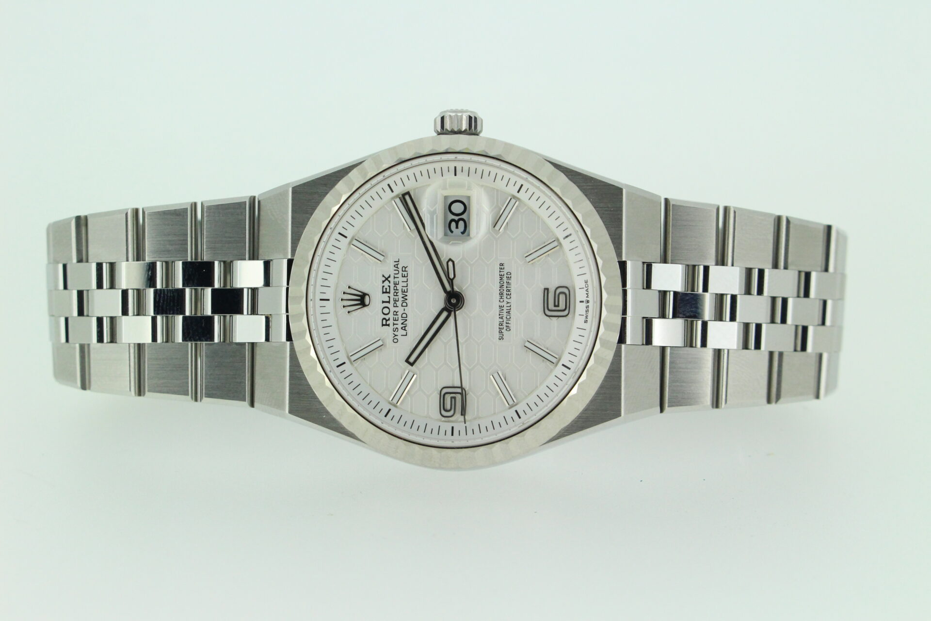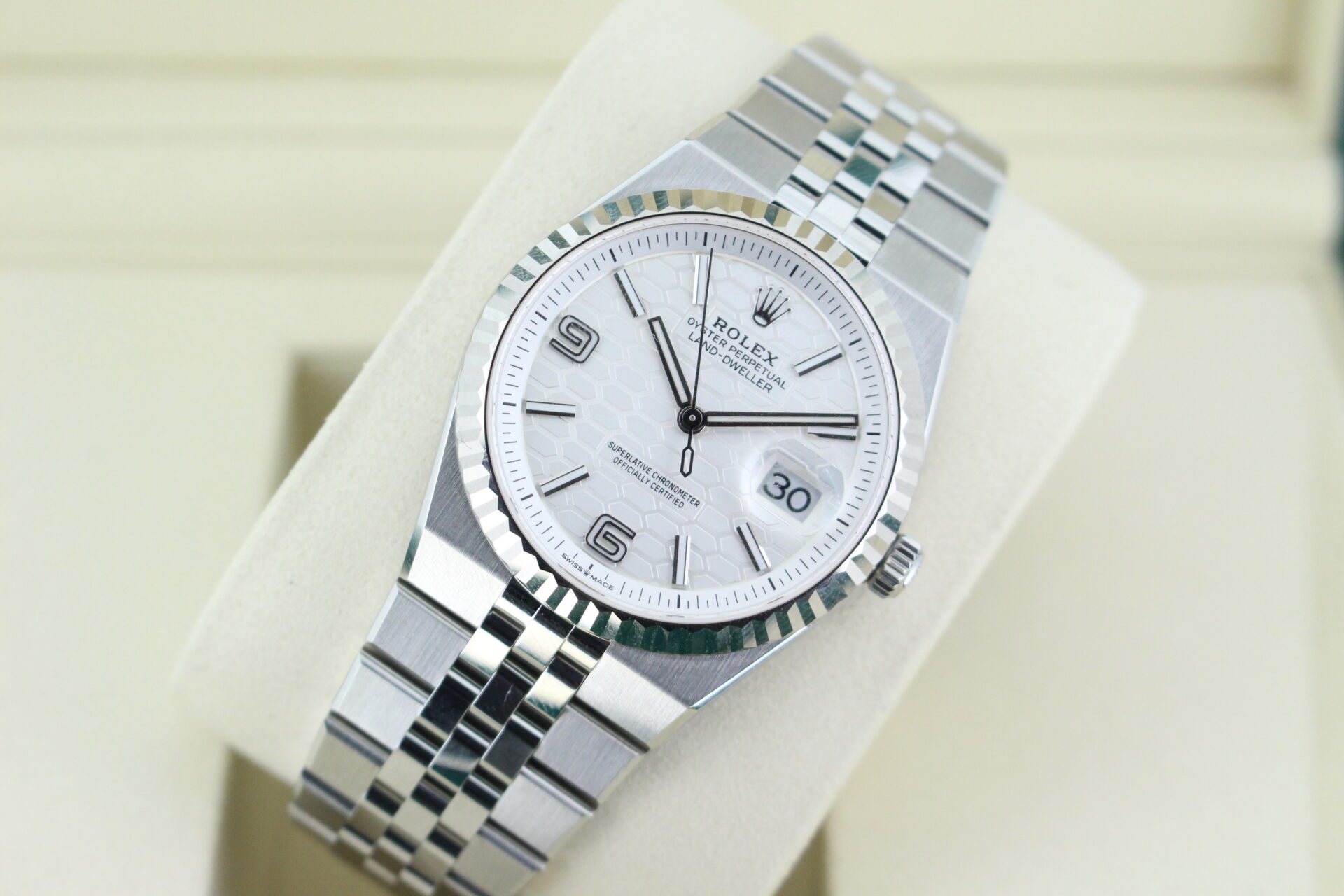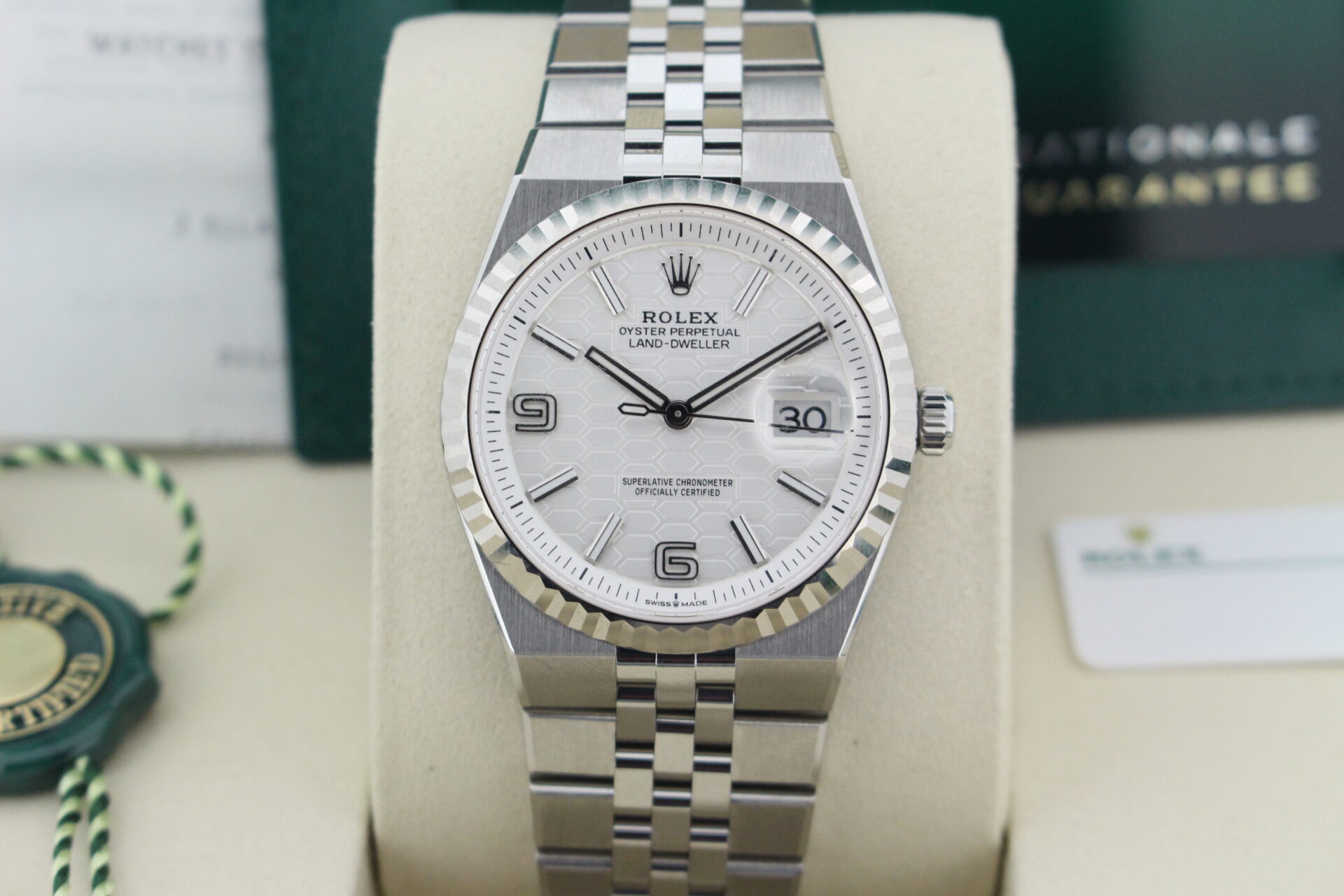 The stunning new release Rolex Land-Dweller 36 coming in stainless steel with an 18ct white gold fluted bezel and the integrated flat jubilee bracelet.