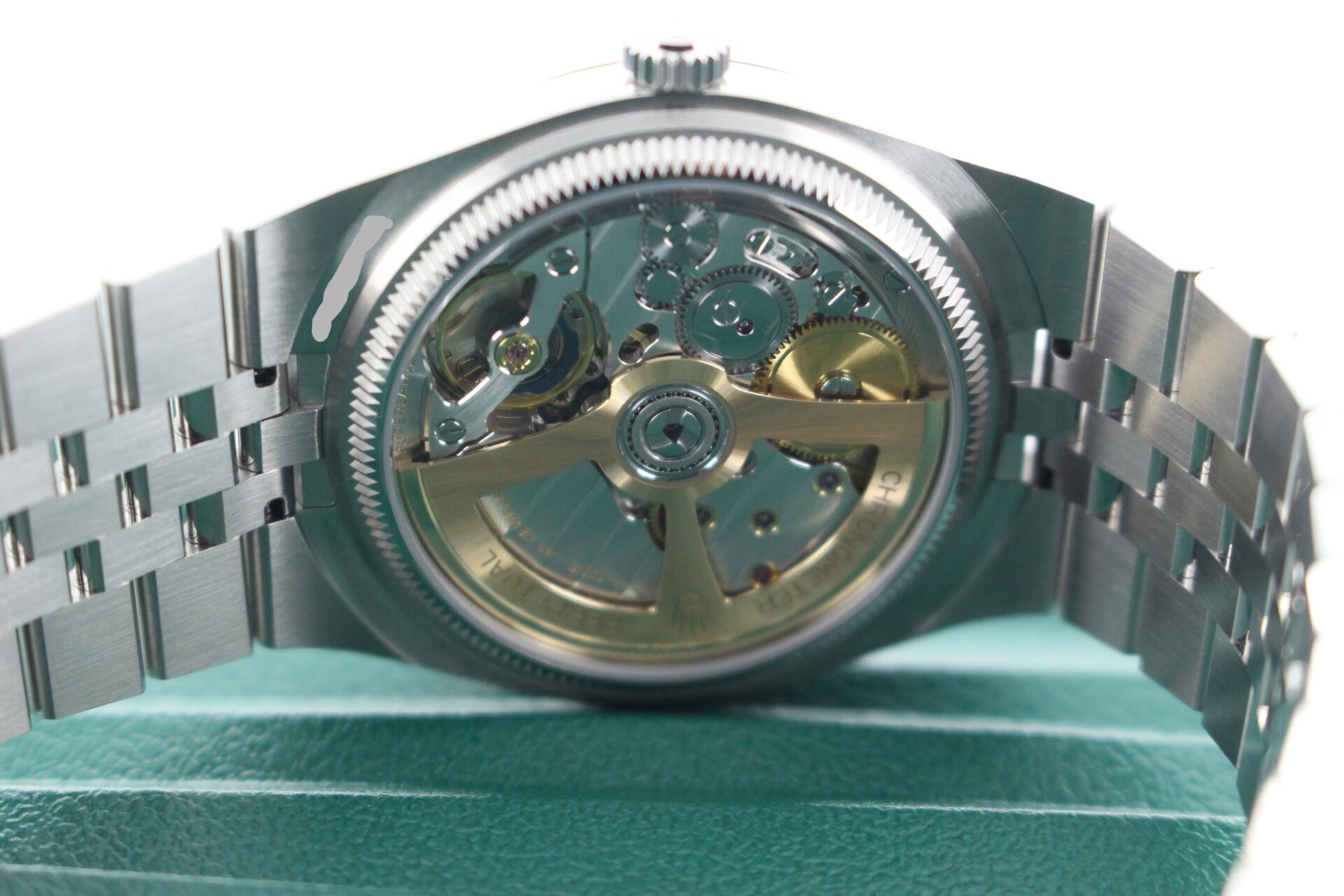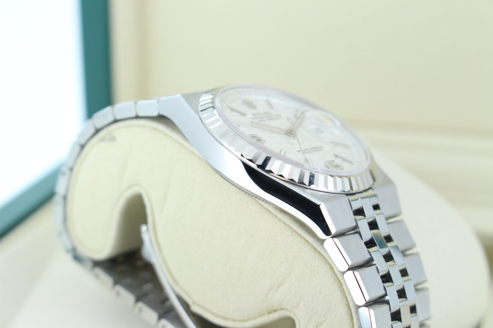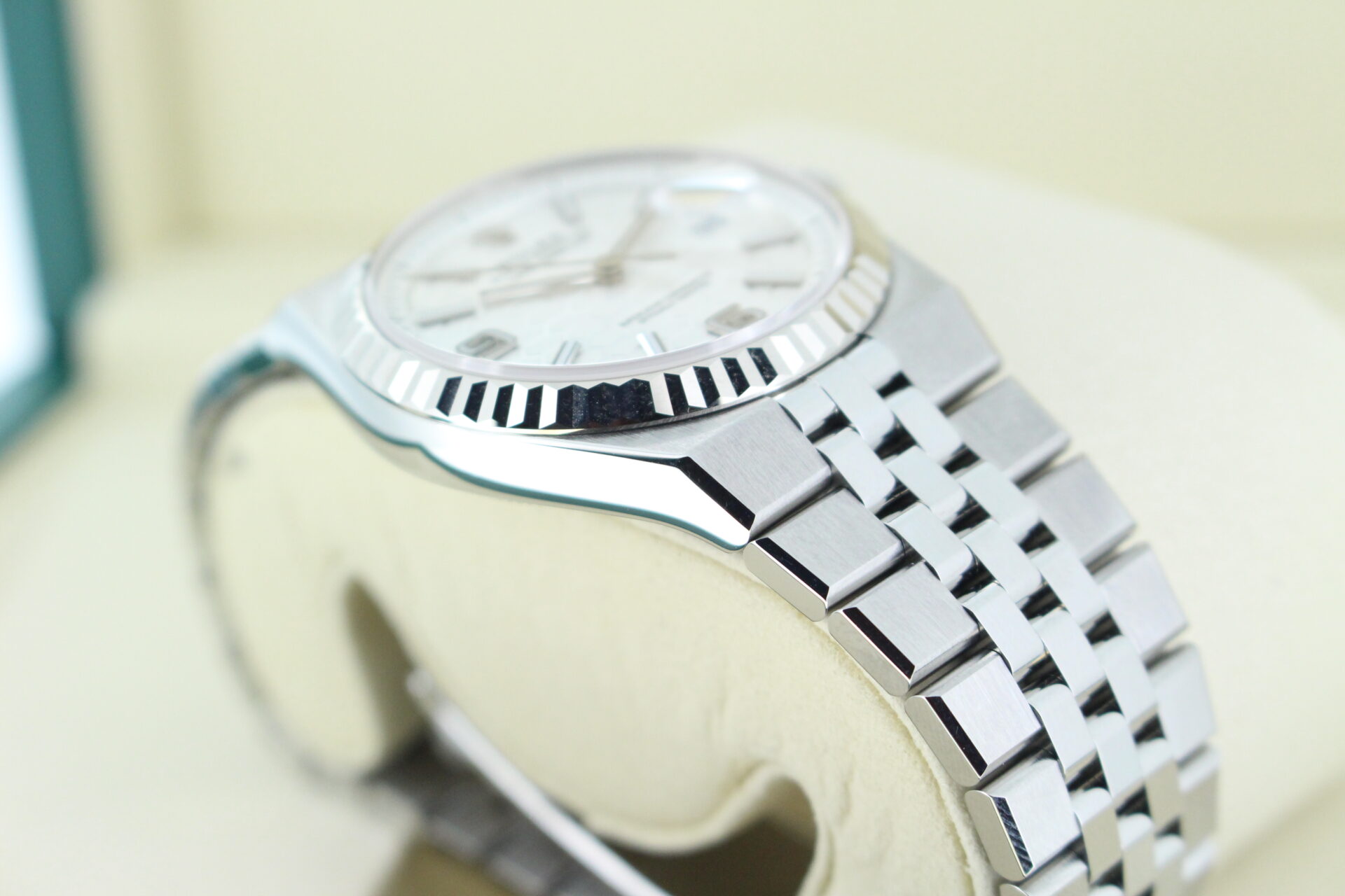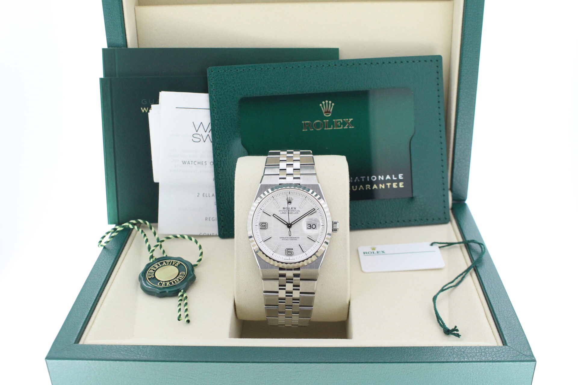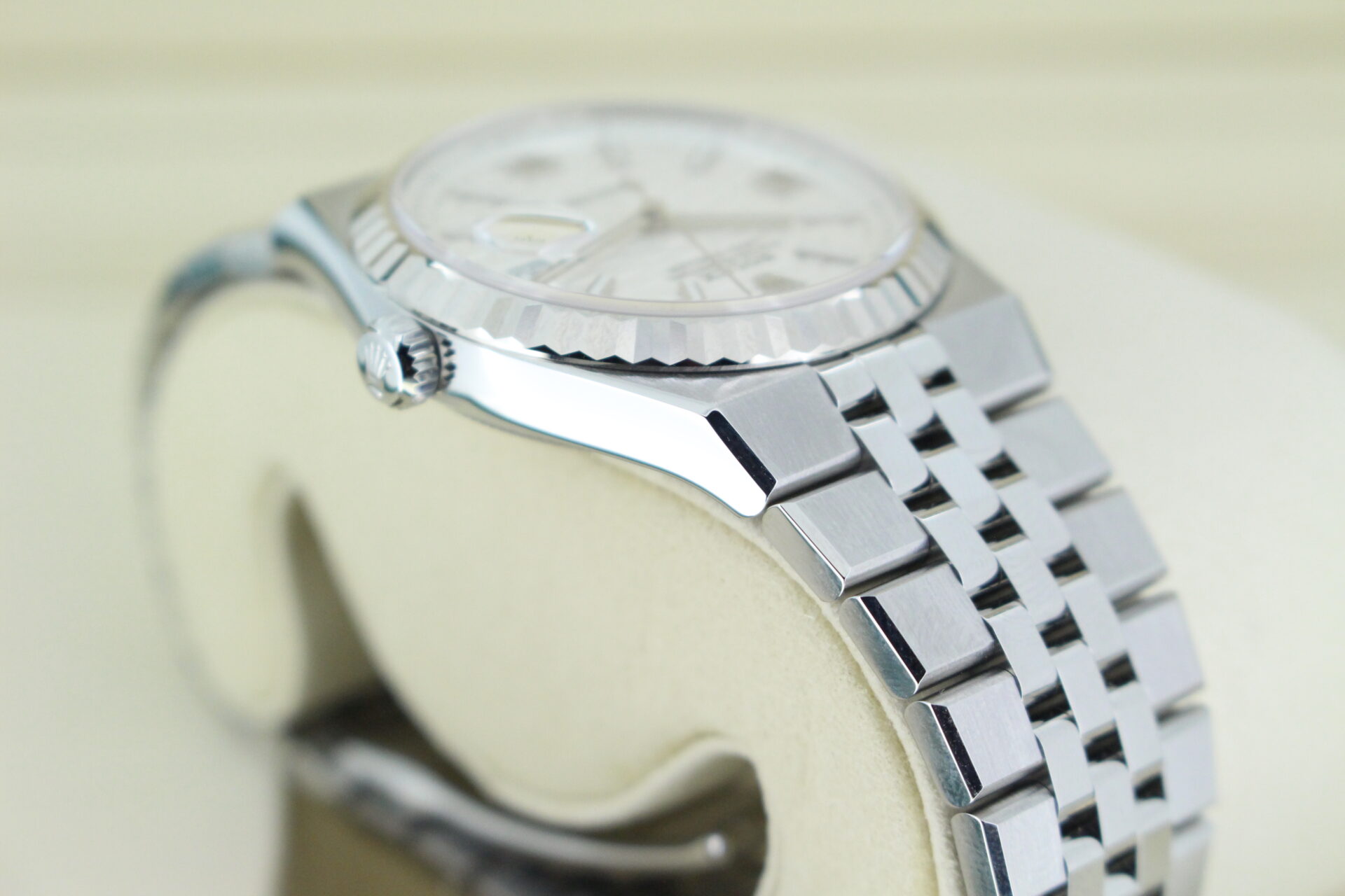 The stunning new release Rolex Land-Dweller 36 coming in stainless steel with an 18ct white gold fluted bezel and the integrated flat jubilee bracelet.