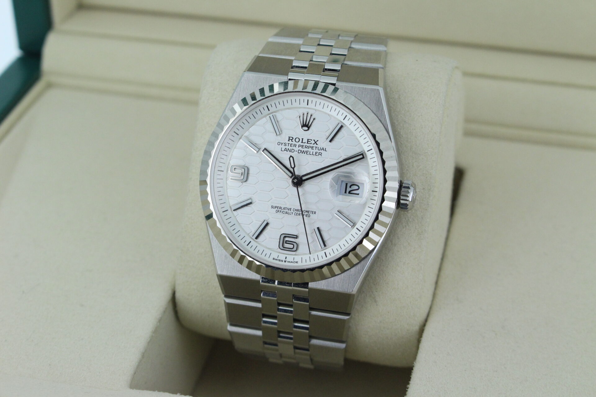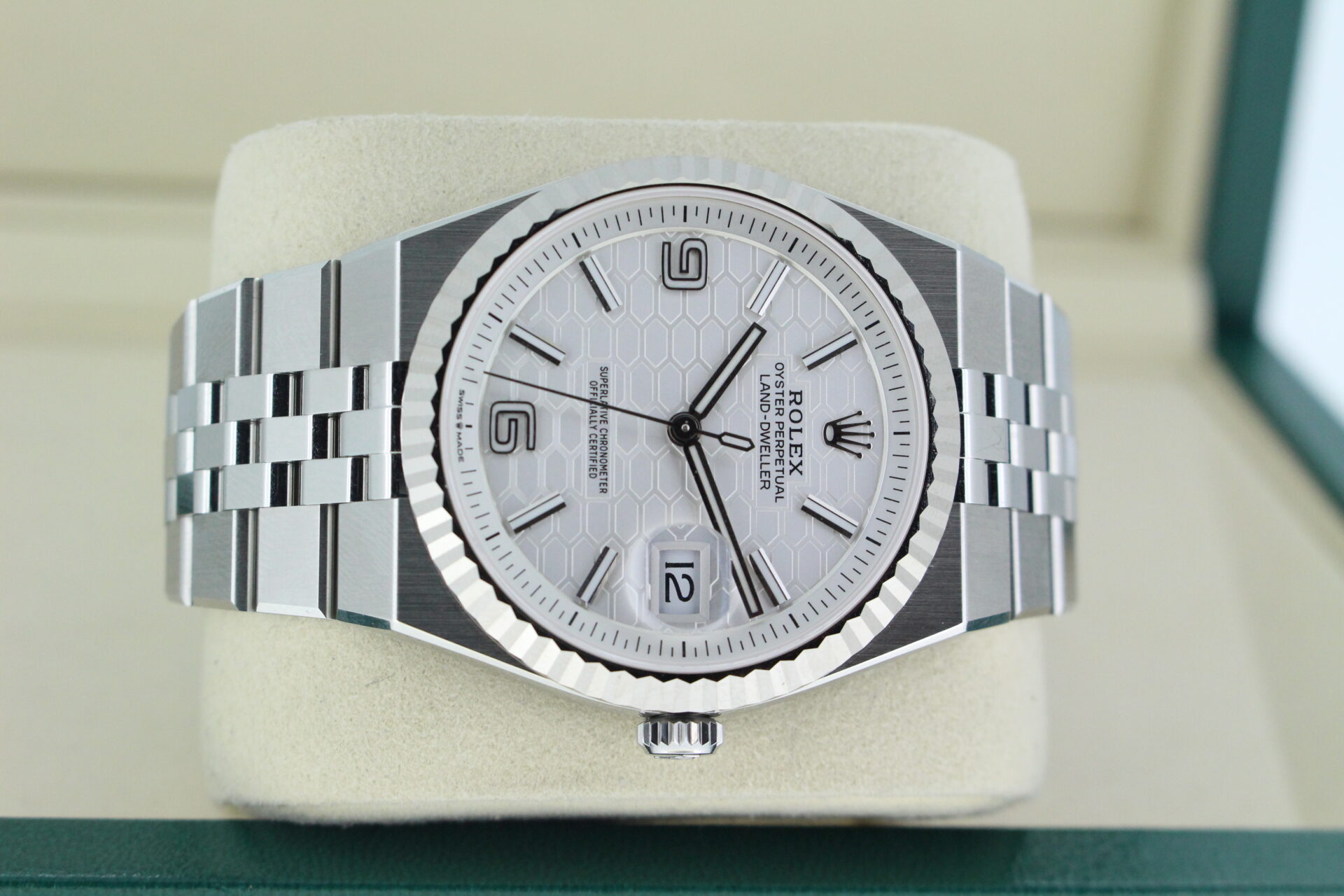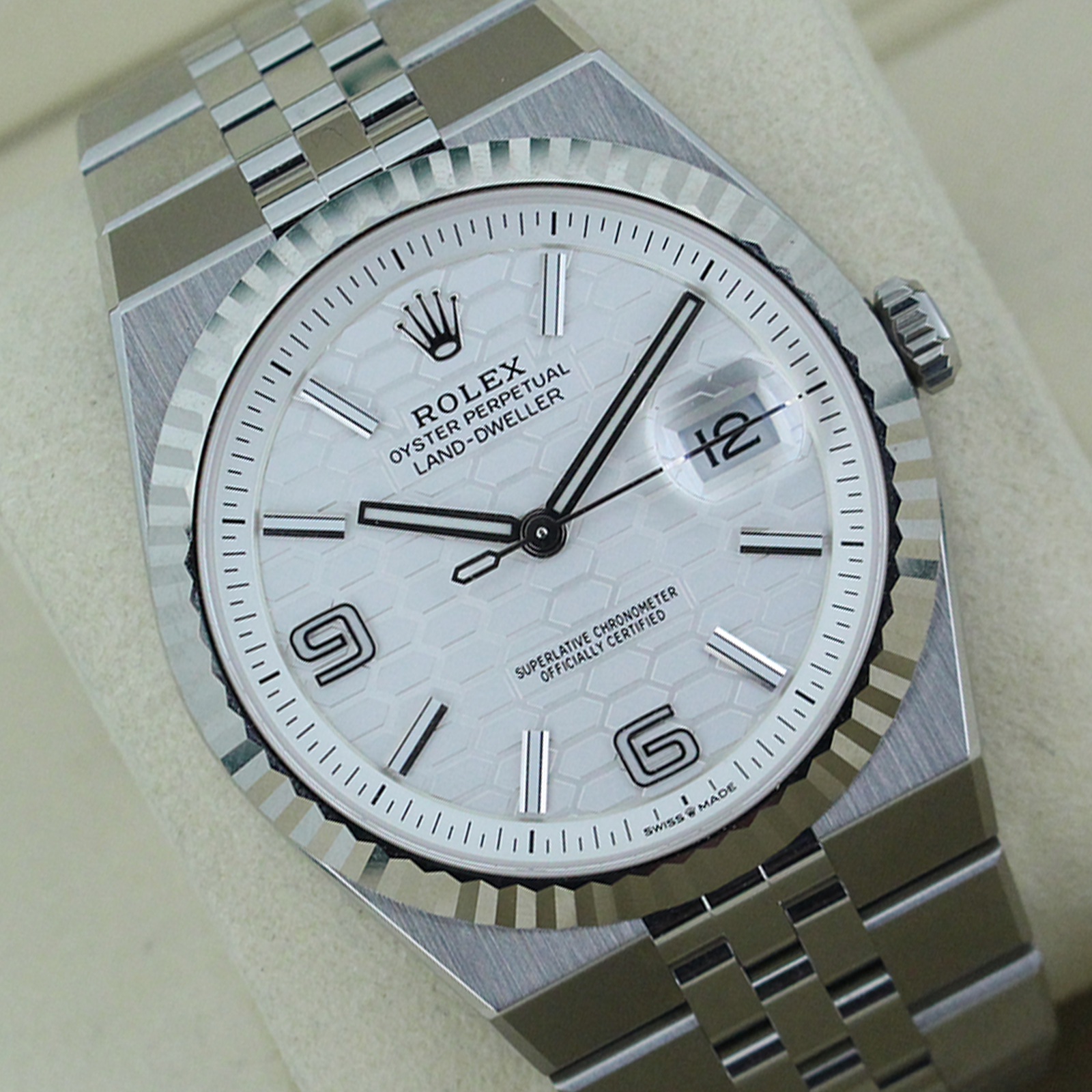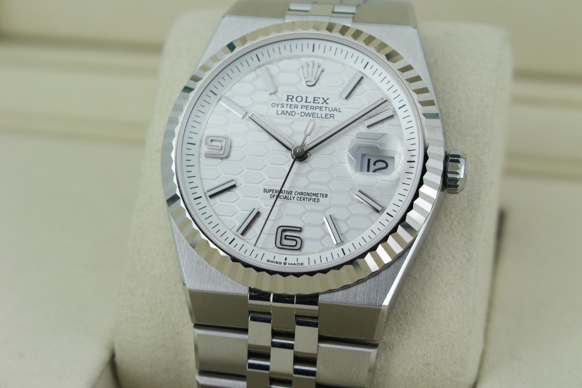 The Land-Dweller’s dial is where modern architecture meets classic Rolex execution. The beautifully finished surface features a distinctive honeycomb motif, adding depth and texture while maintaining the clean symmetry Rolex is known for.