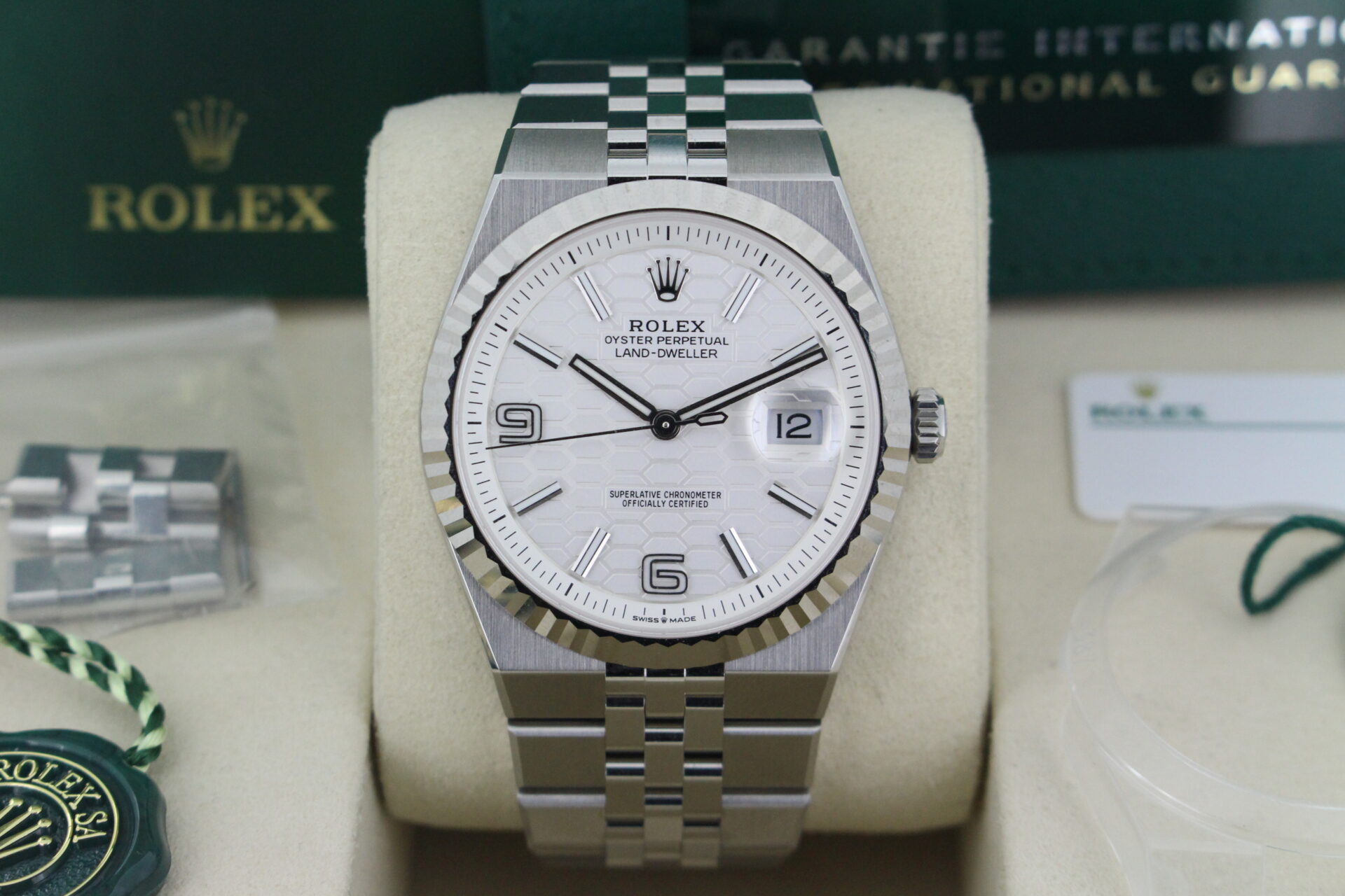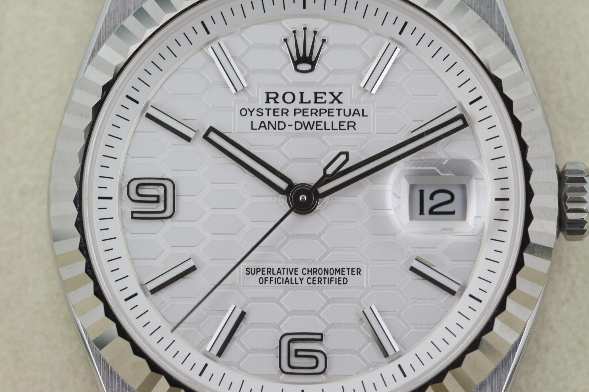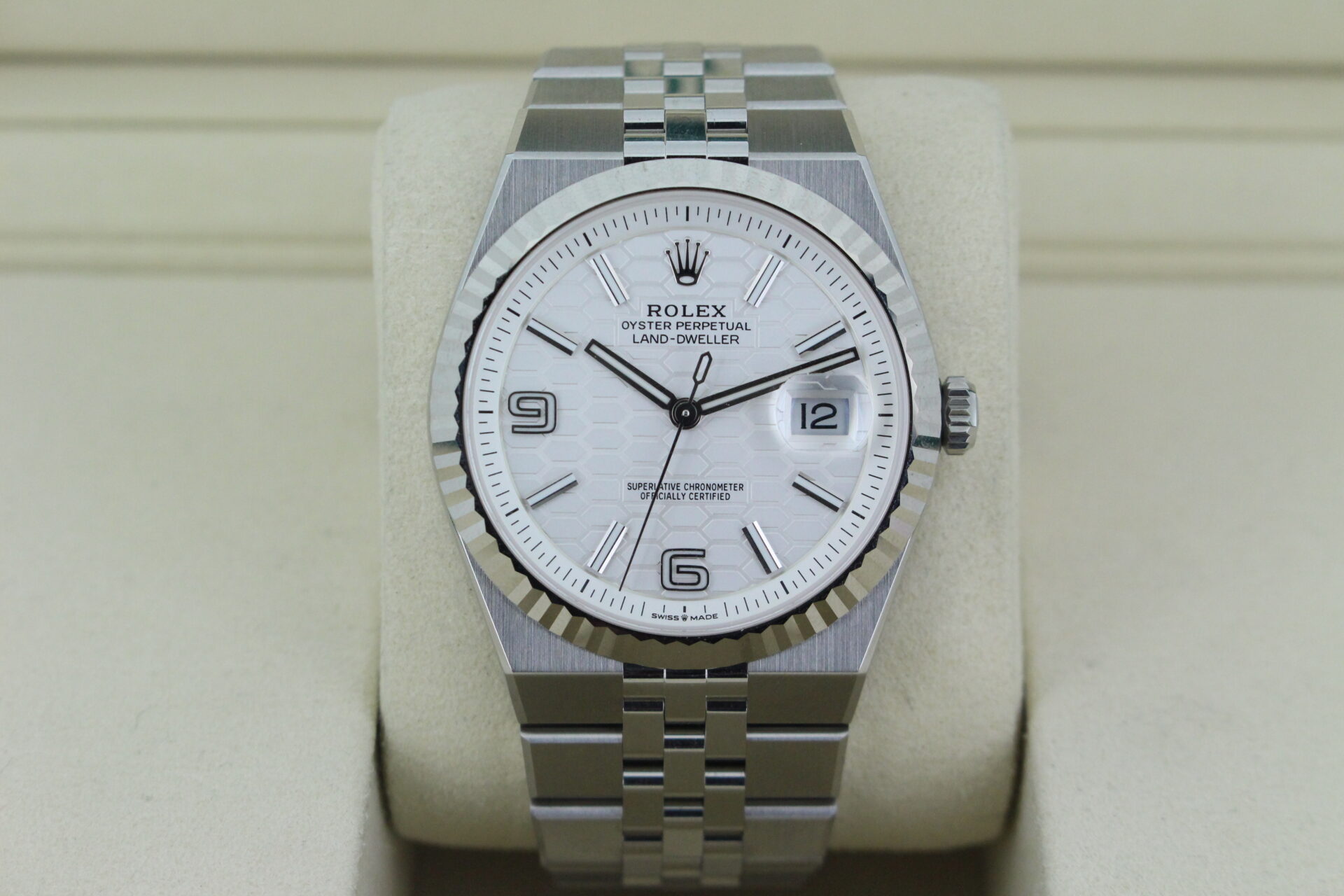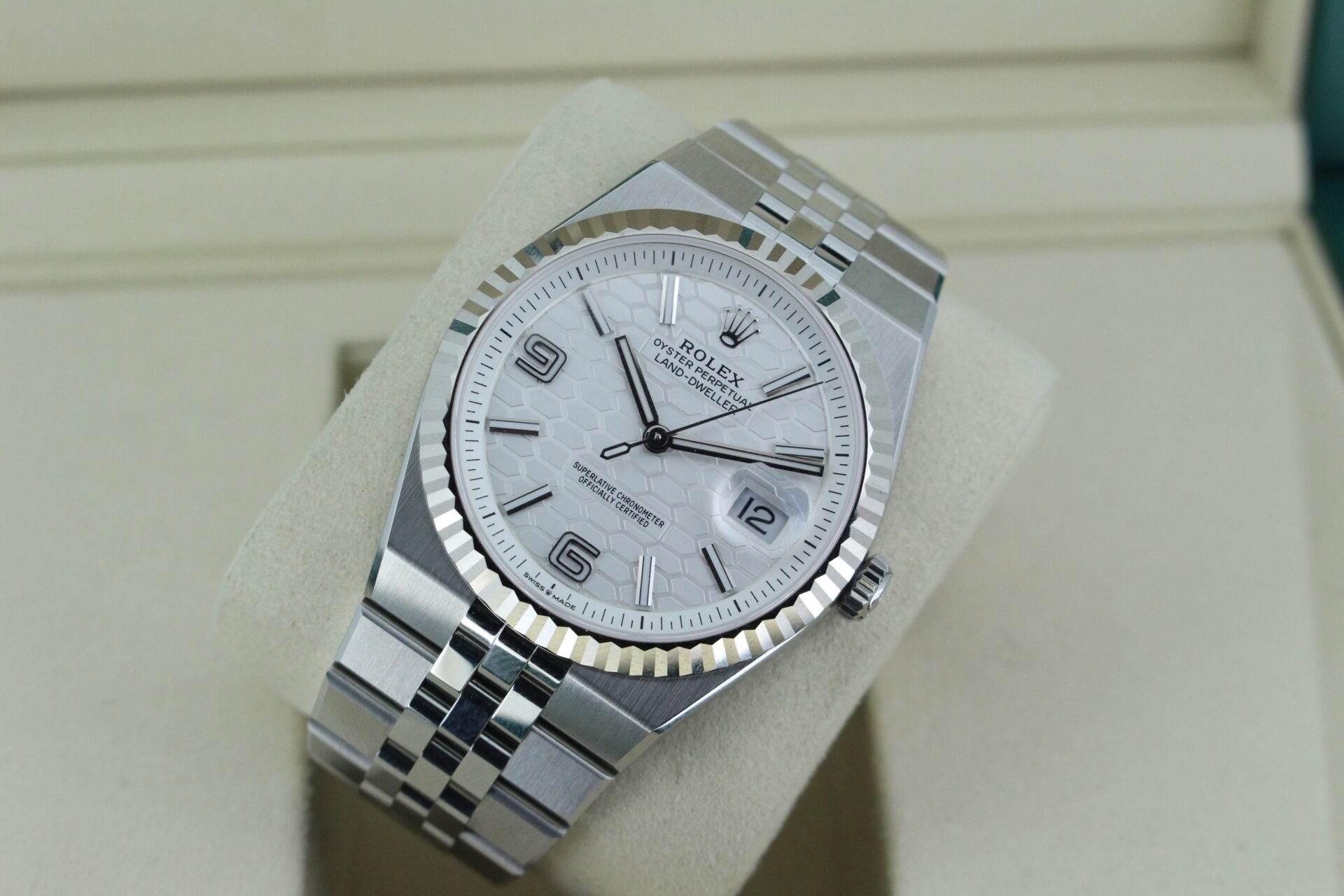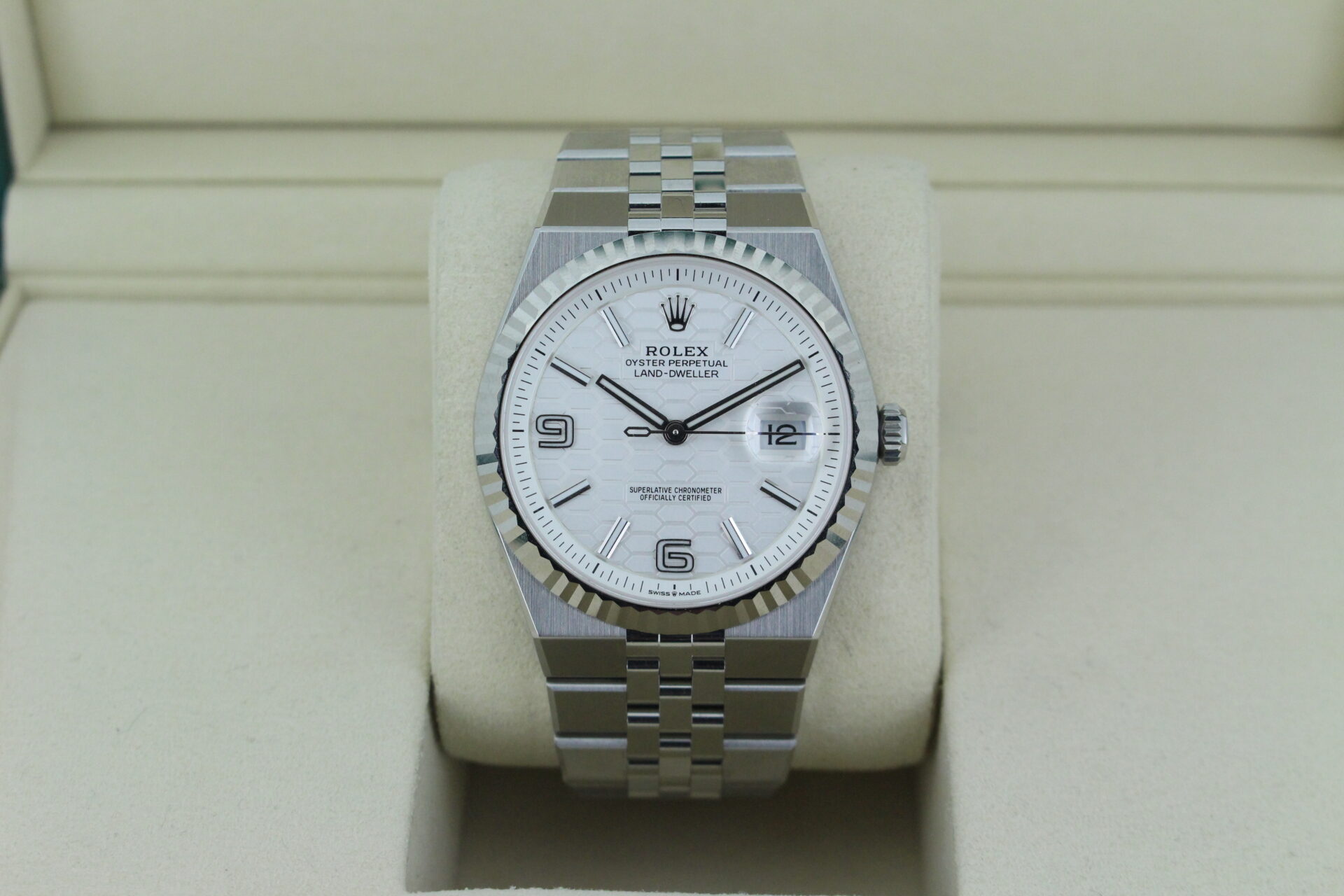 The Land-Dweller’s dial is where modern architecture meets classic Rolex execution. The beautifully finished surface features a distinctive honeycomb motif, adding depth and texture while maintaining the clean symmetry Rolex is known for.