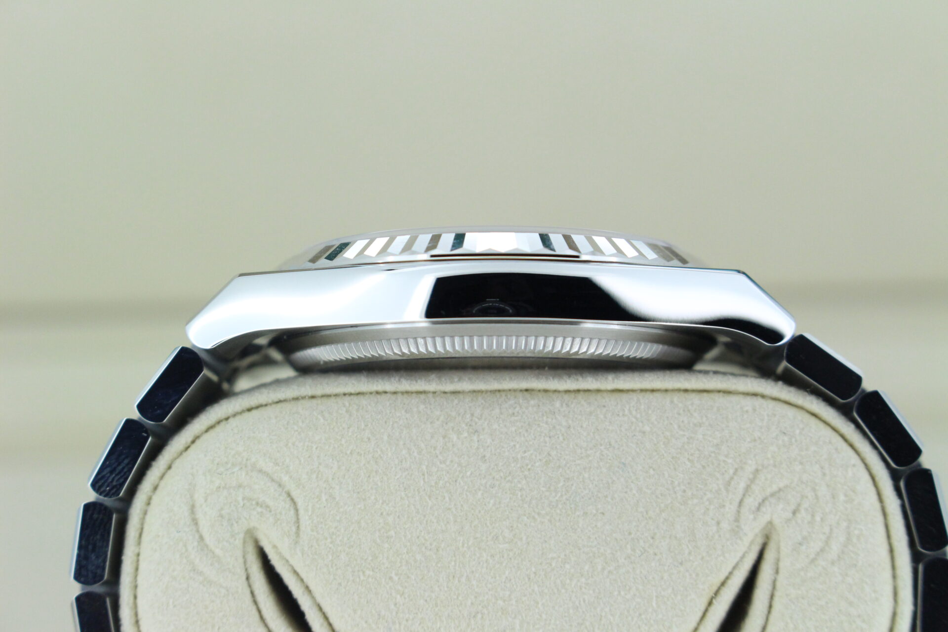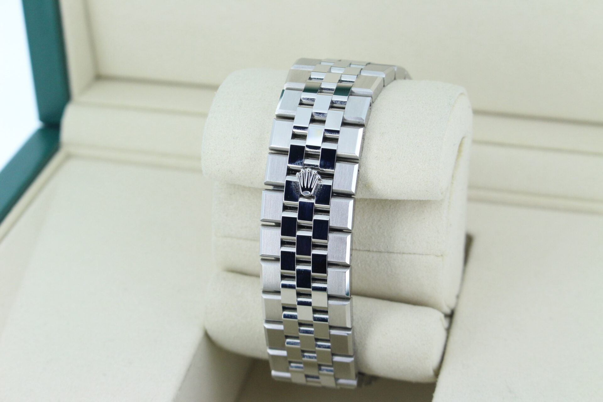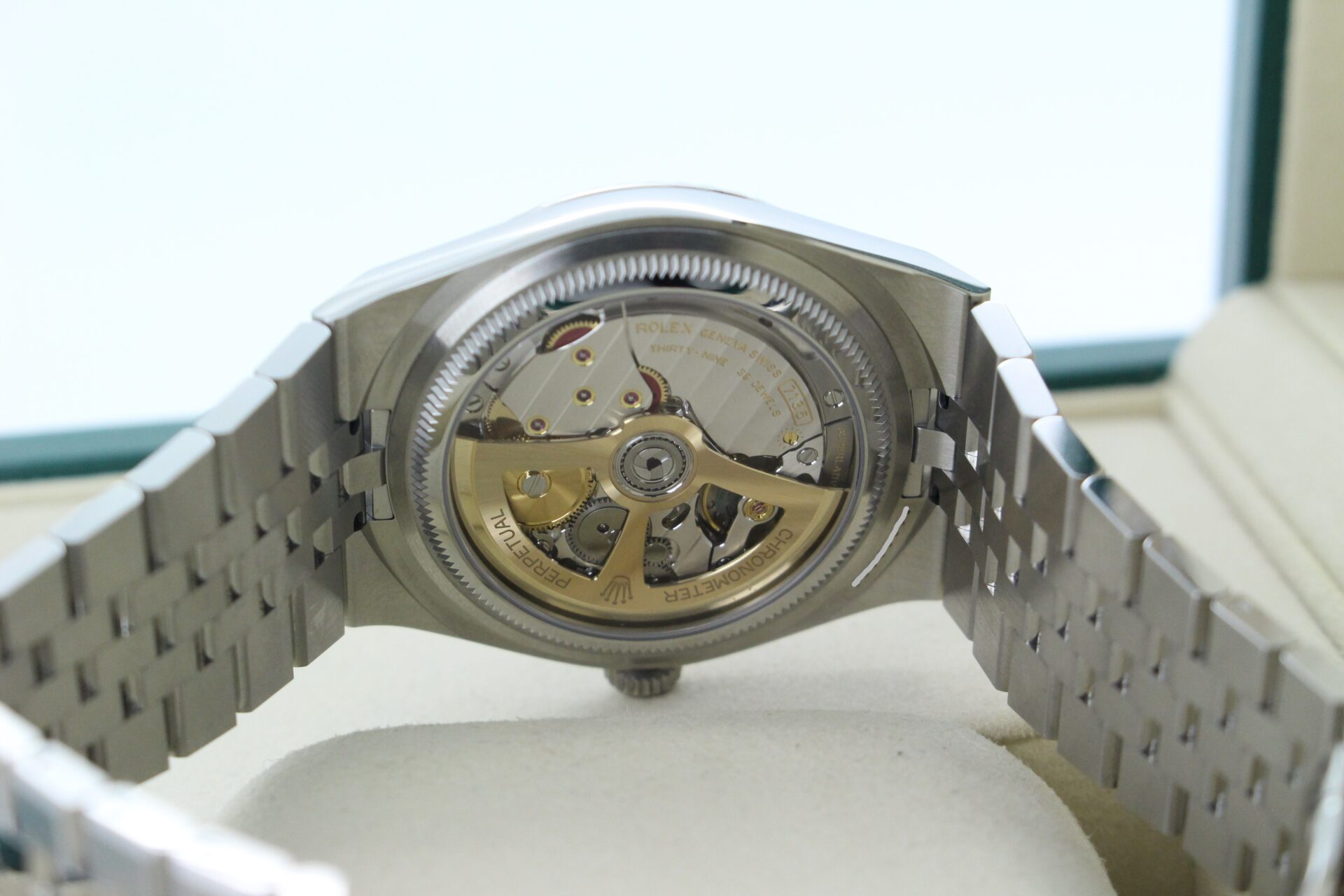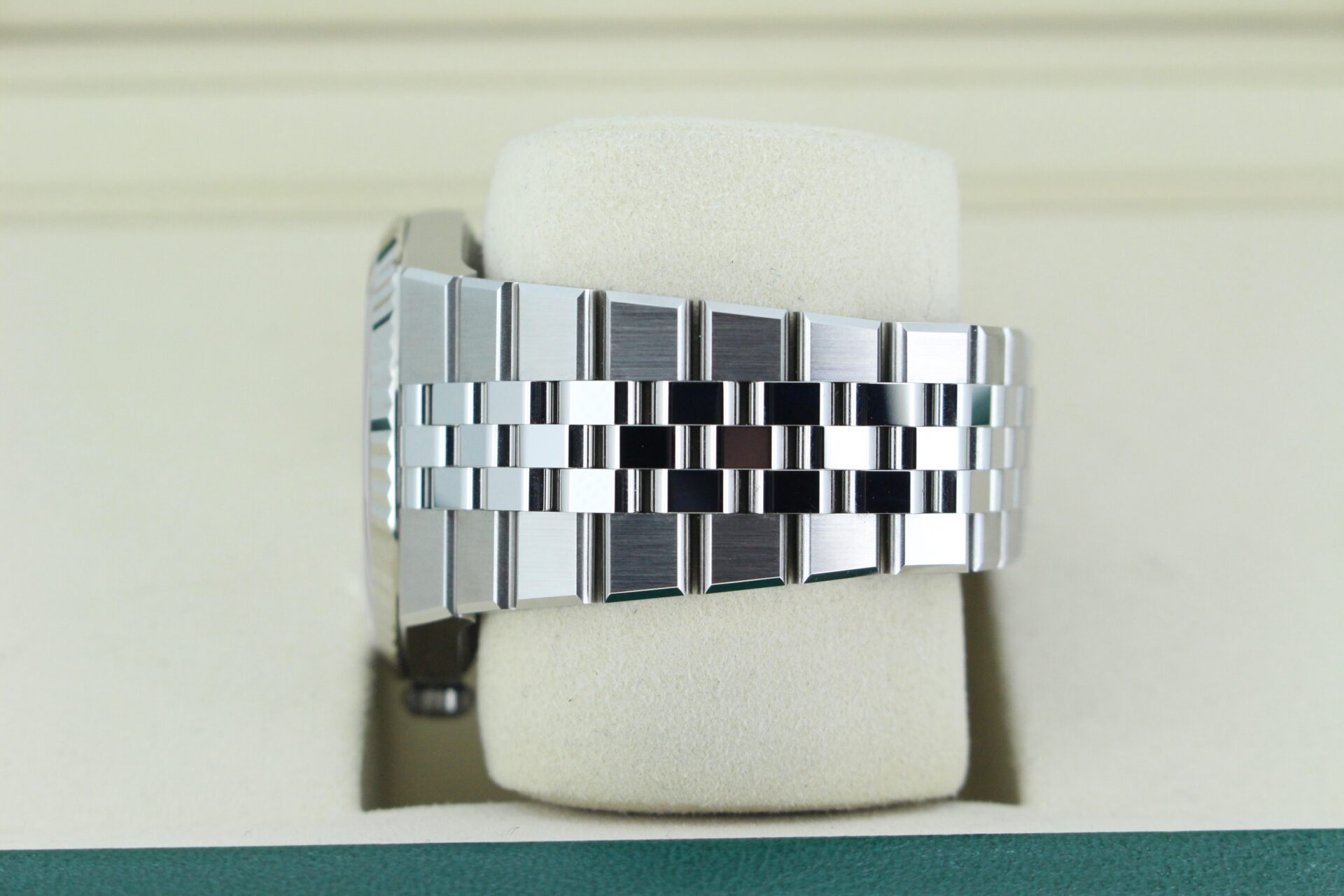 The Land-Dweller is fitted with the newly designed Flat Jubilee bracelet — a refined evolution of Rolex’s classic five-link construction. The bracelet combines brushed outer links with polished centre links, creating a subtle interplay of textures that catches the light without being overstated.
