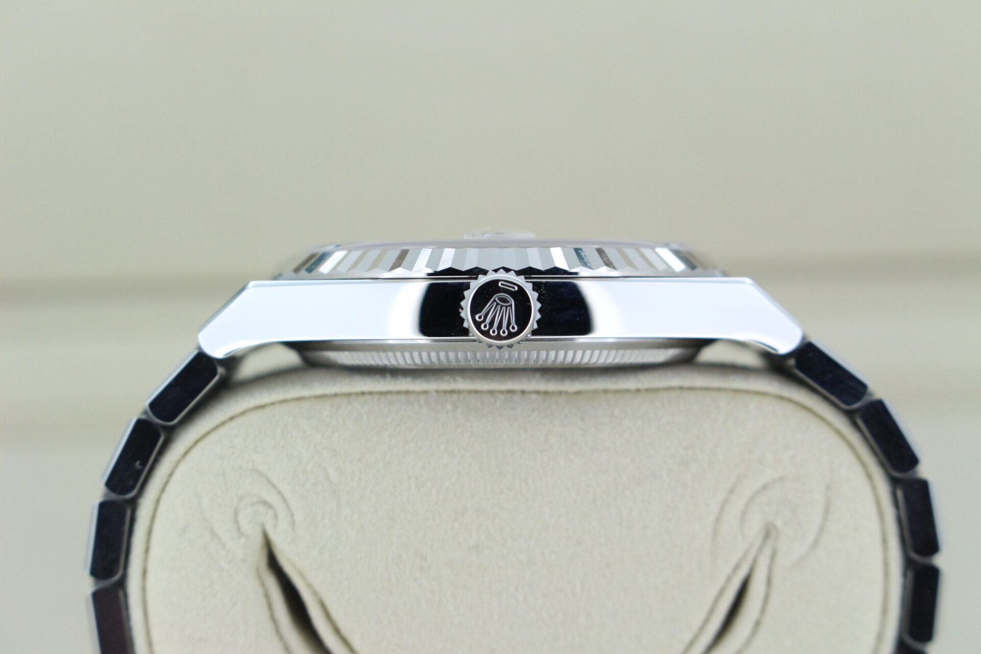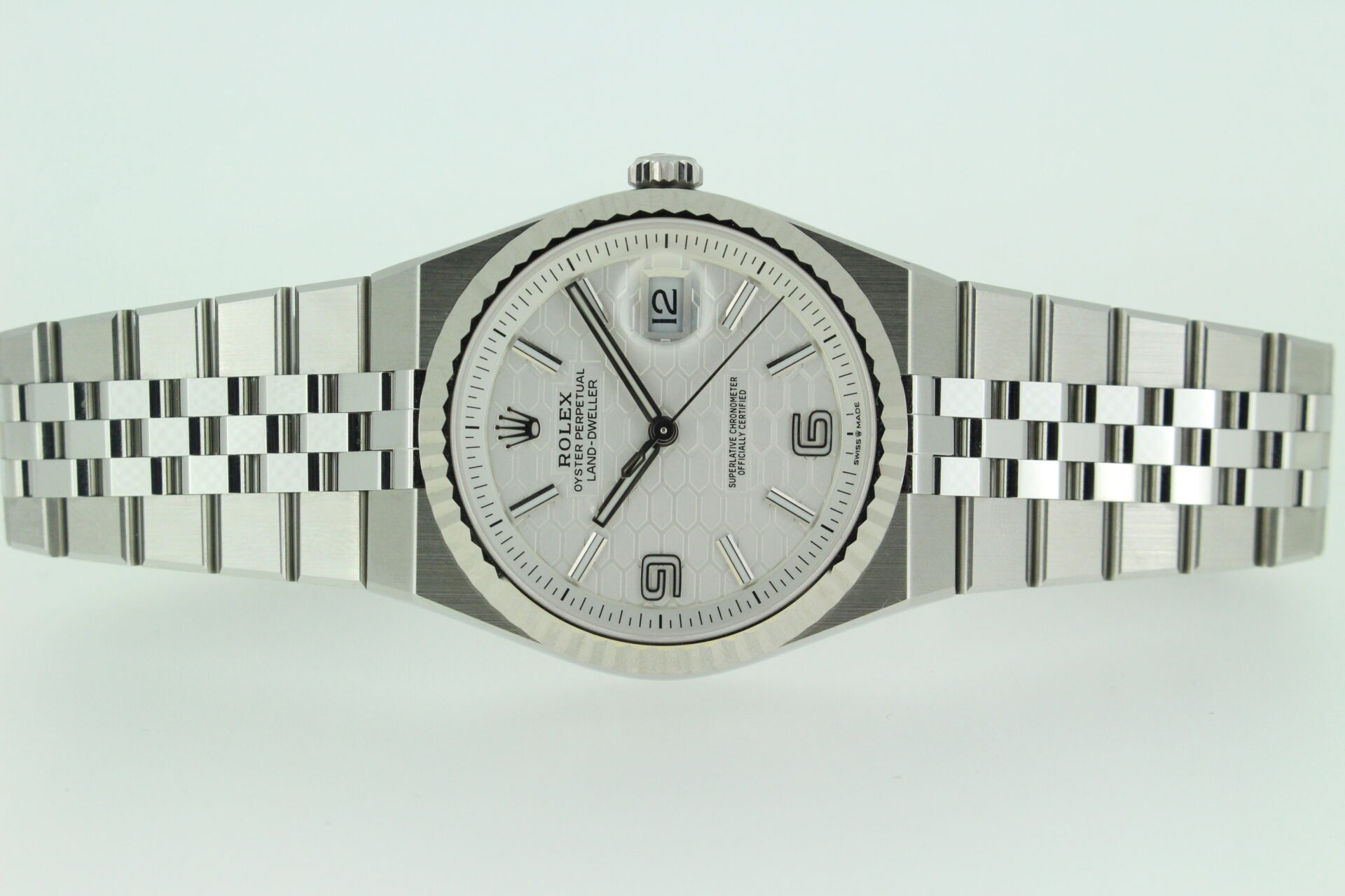 The stunning new release Rolex Land-Dweller 40 coming in stainless steel with an 18ct white gold fluted bezel with the integrated flat jubilee bracelet.