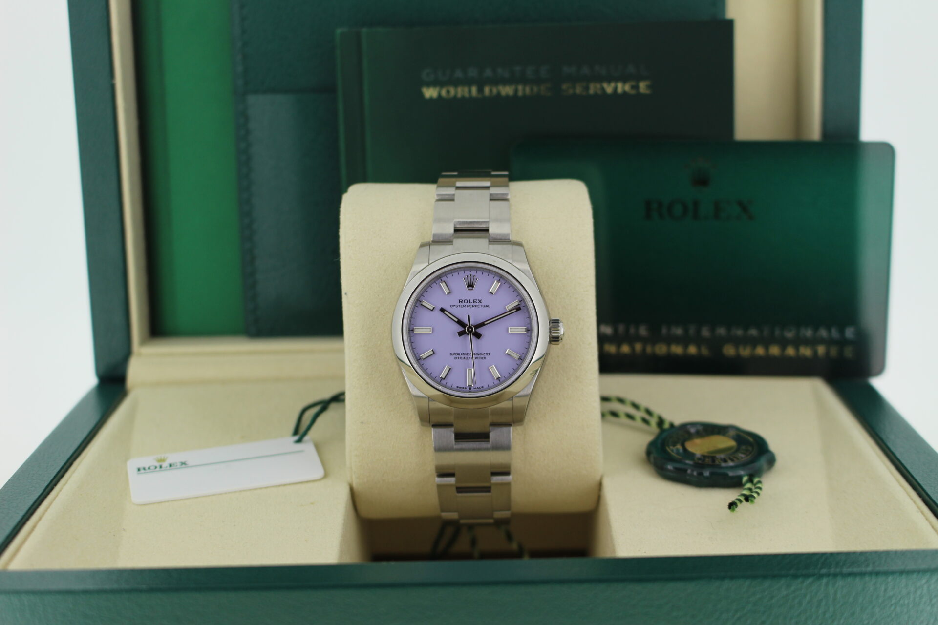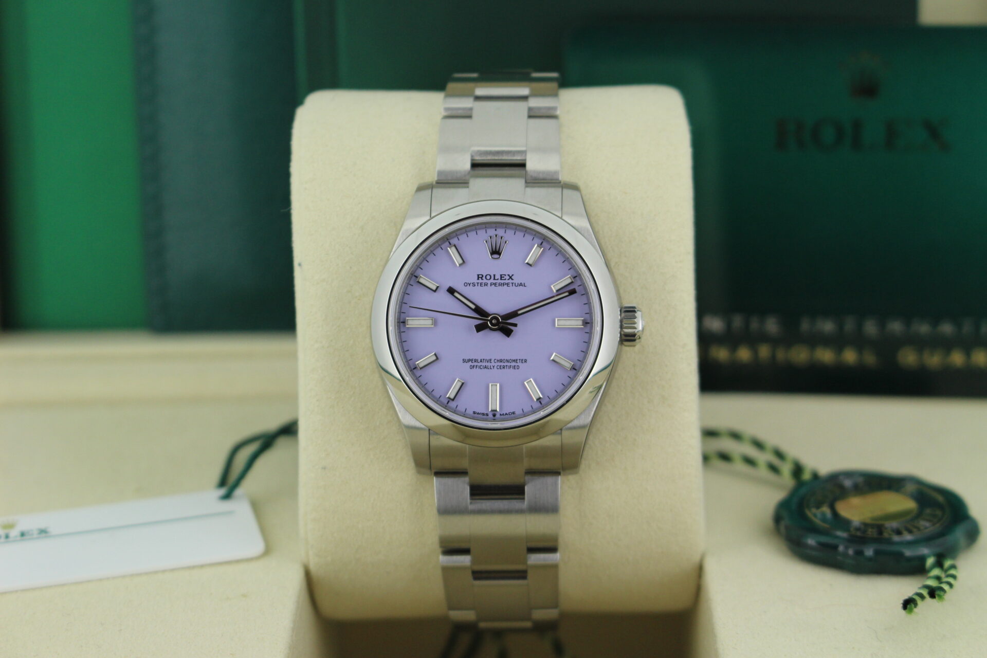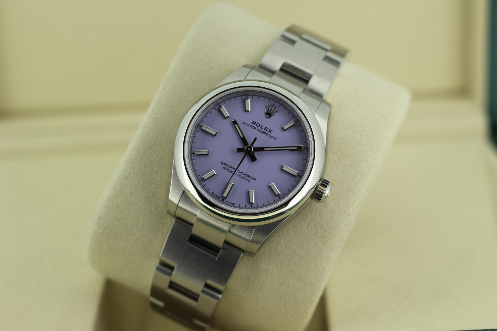 We are pleased to offer this unworn Rolex Oyster Perpetual 31mm. With a beautiful lavender dial fitted on the watch, this watch is a perfect daily wear.