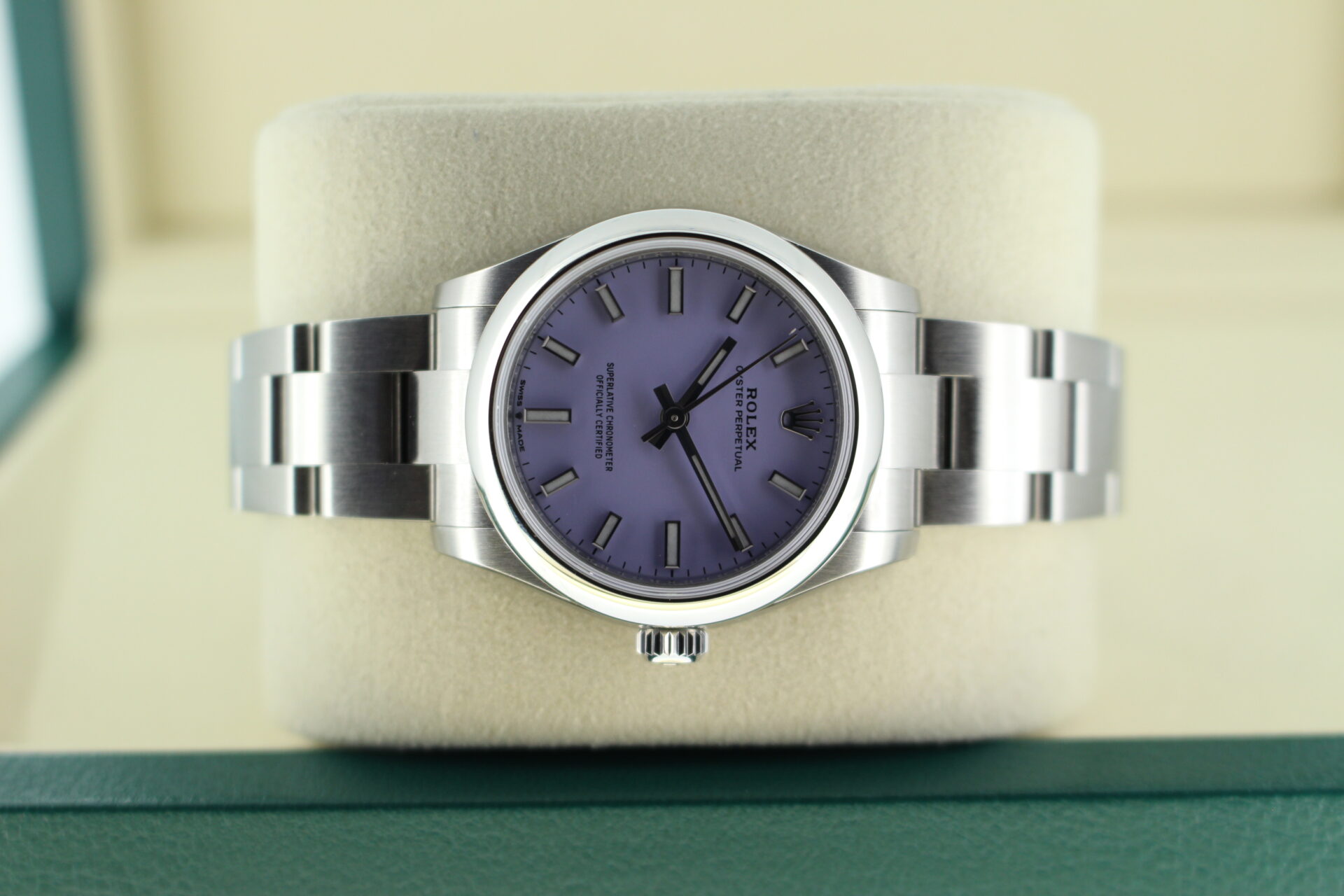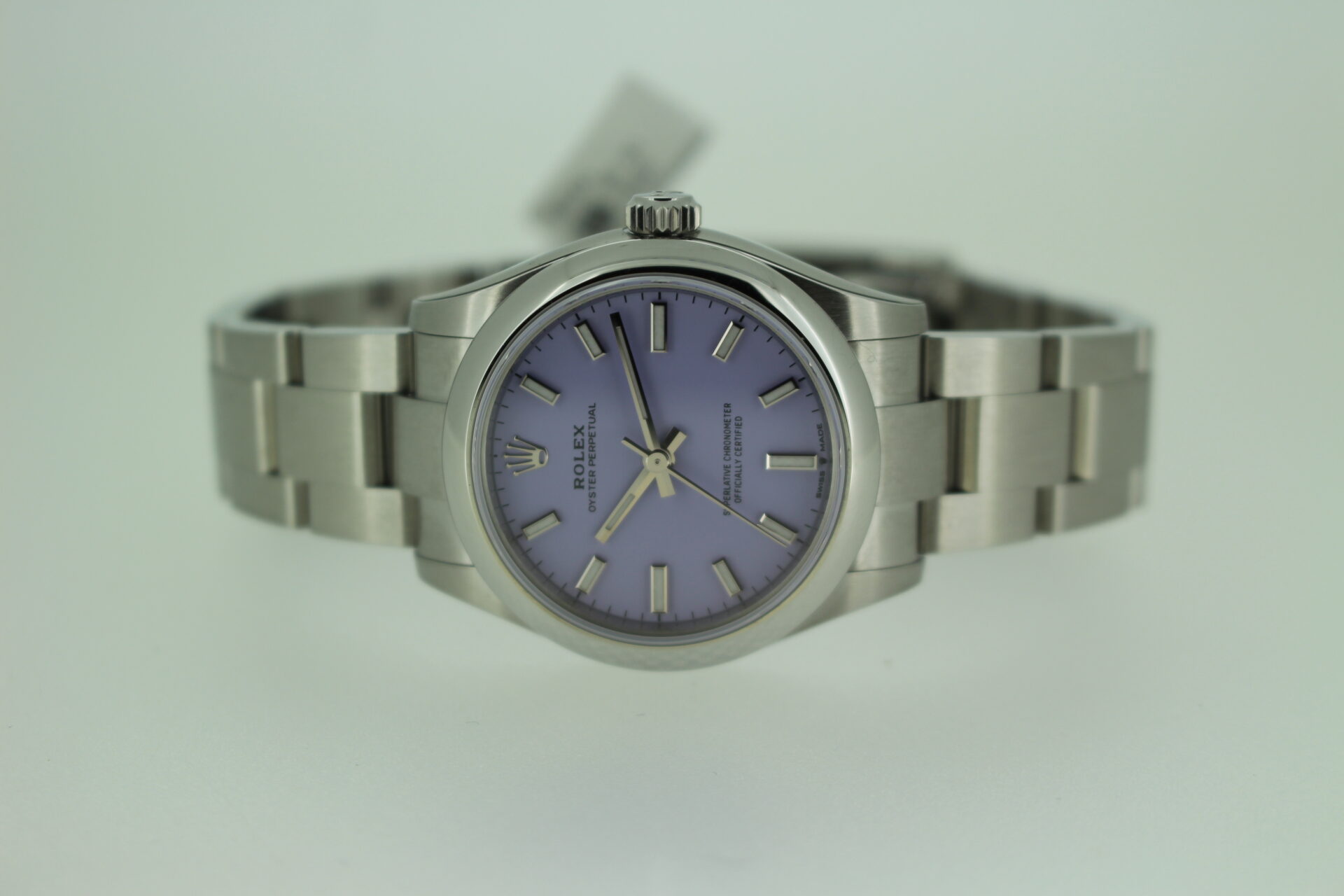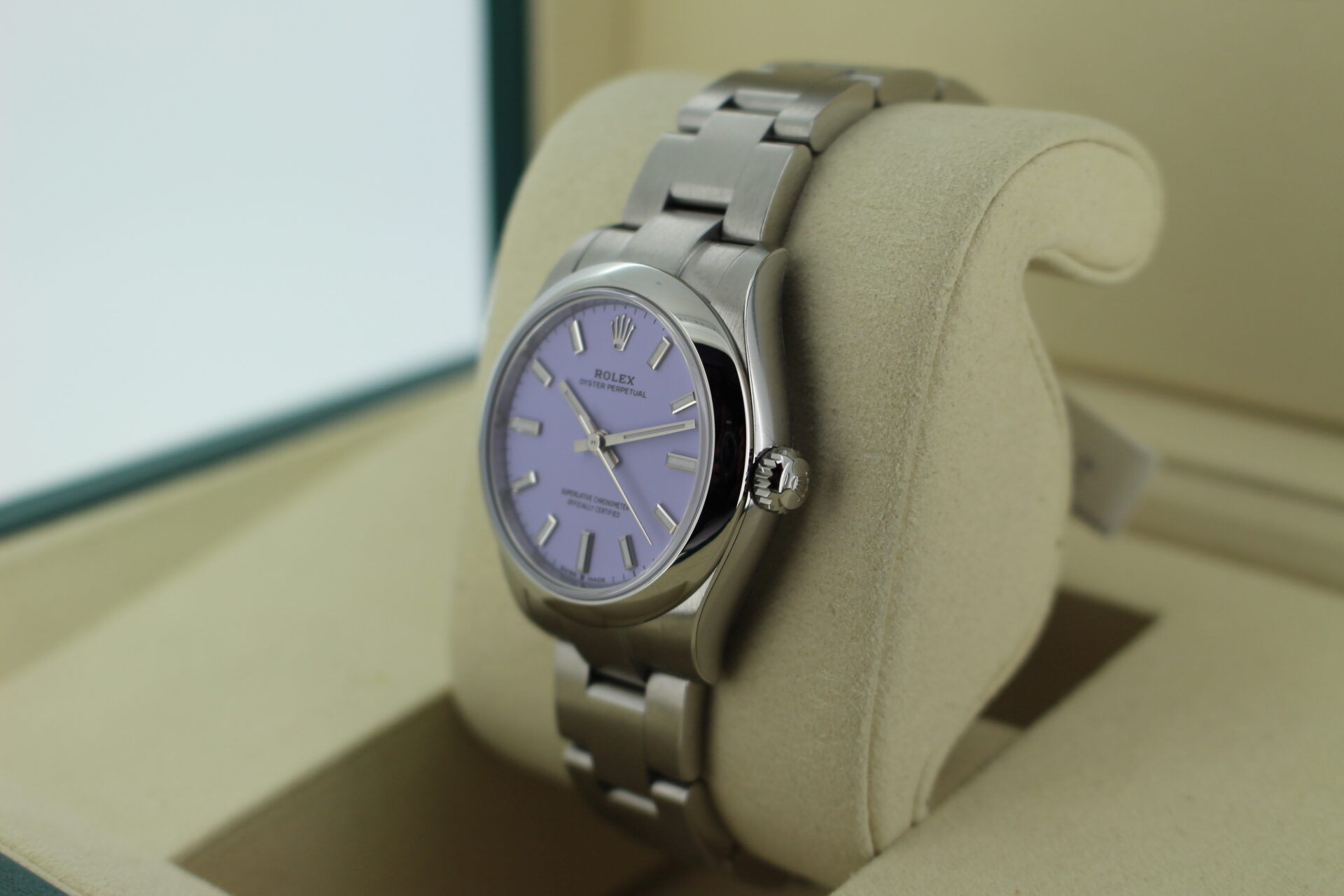 We are pleased to offer this unworn Rolex Oyster Perpetual 31mm. With a beautiful lavender dial fitted on the watch, this watch is a perfect daily wear.