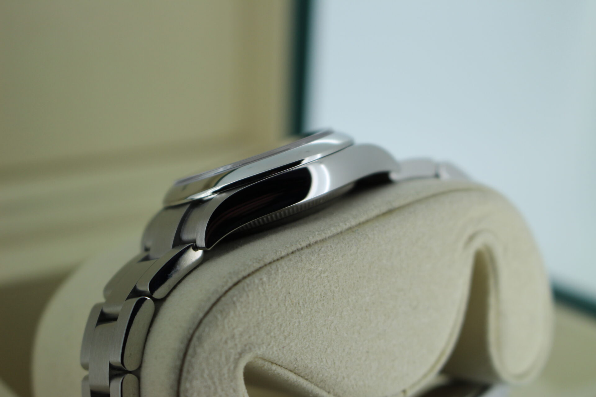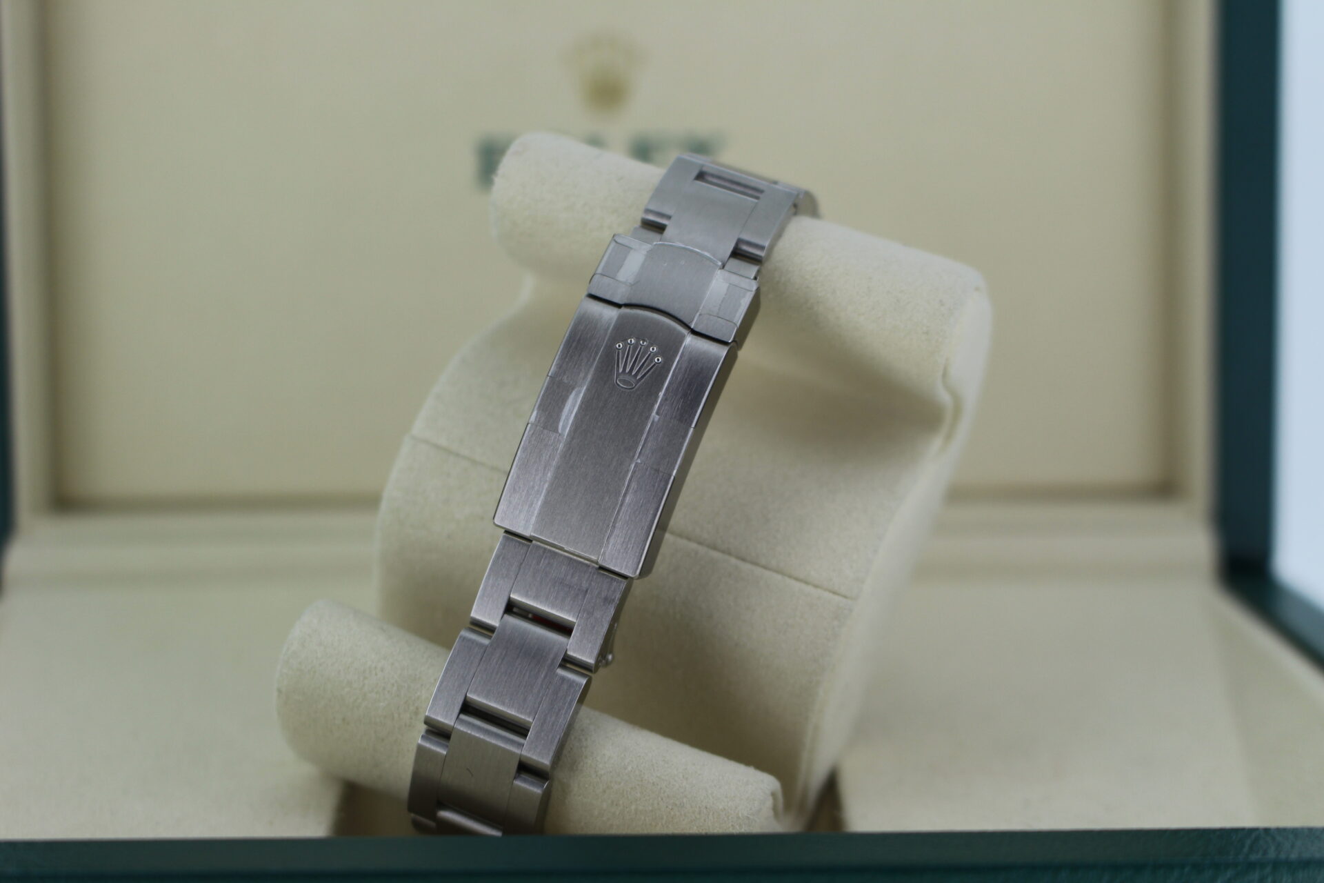 This particular watch comes as a full set from new including both inner and outer boxes, outer sleeve, both swing tags, booklets, green dial and Rolex warranty card stamped August 2025.