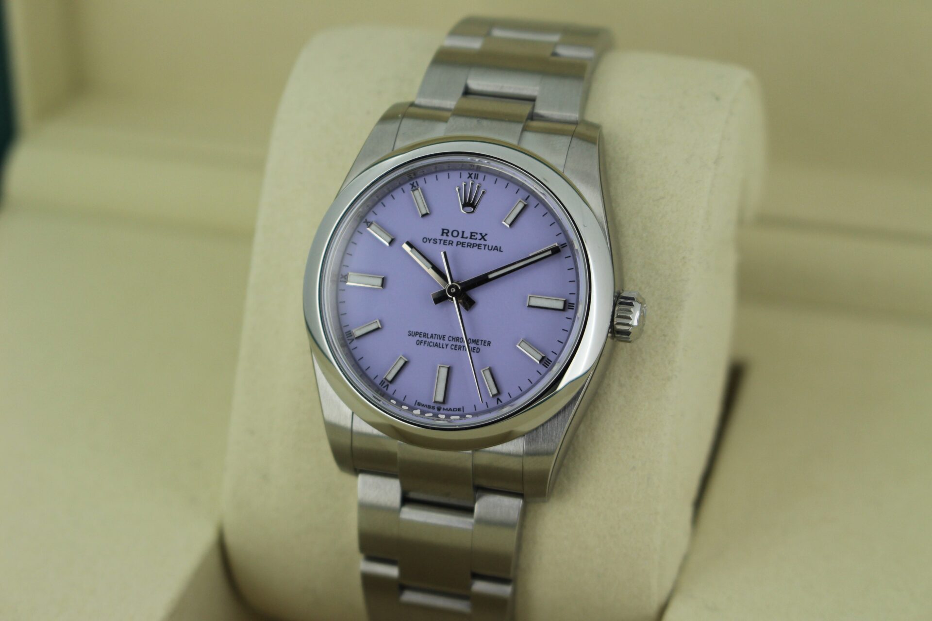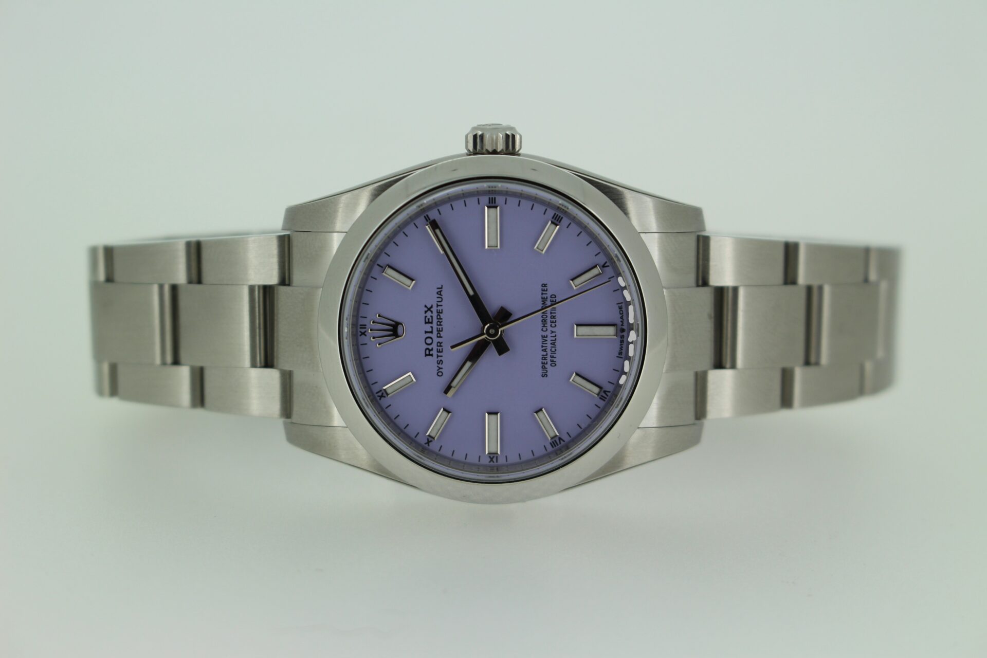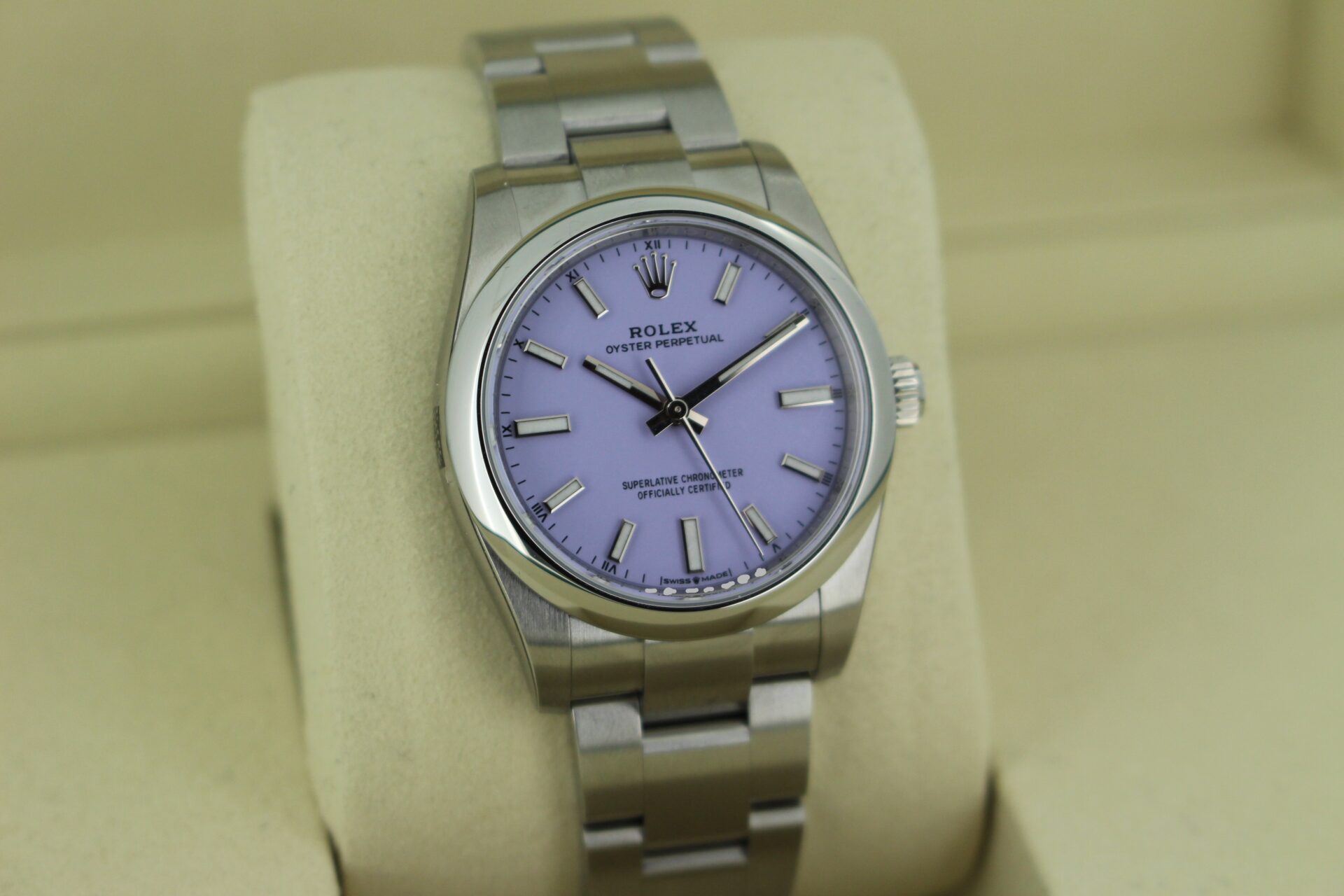 We are pleased to offer this unworn Rolex Oyster Perpetual 34mm. With a beautiful lavender dial fitted on the watch, this watch is a perfect daily wear.