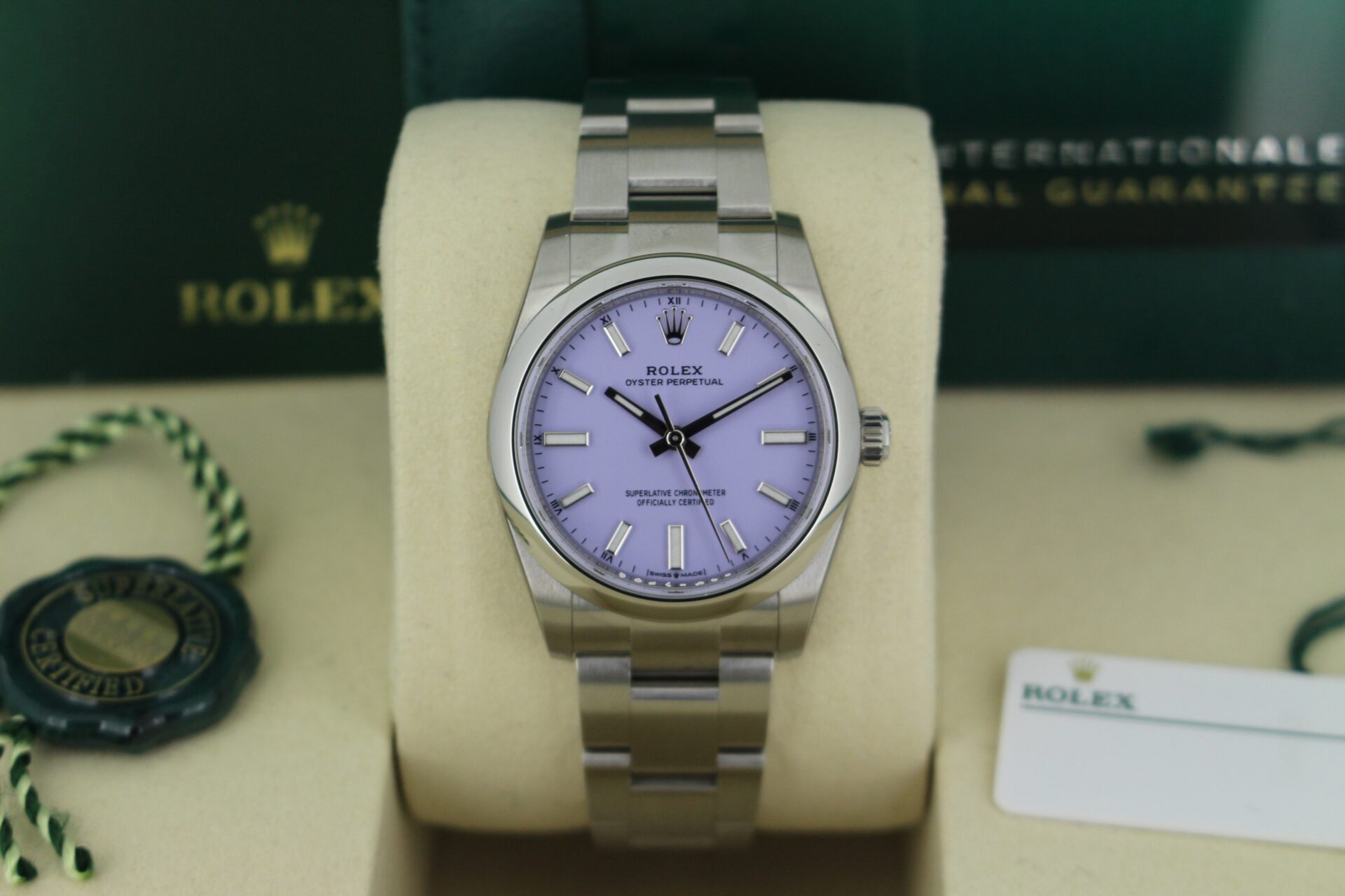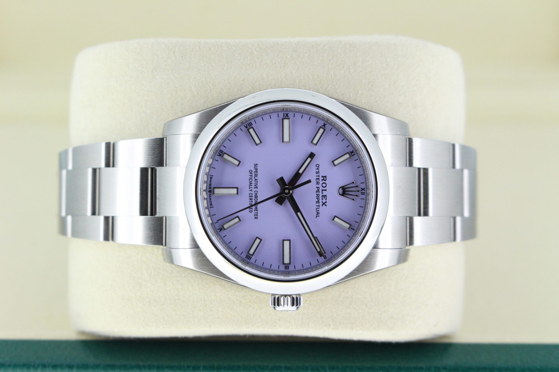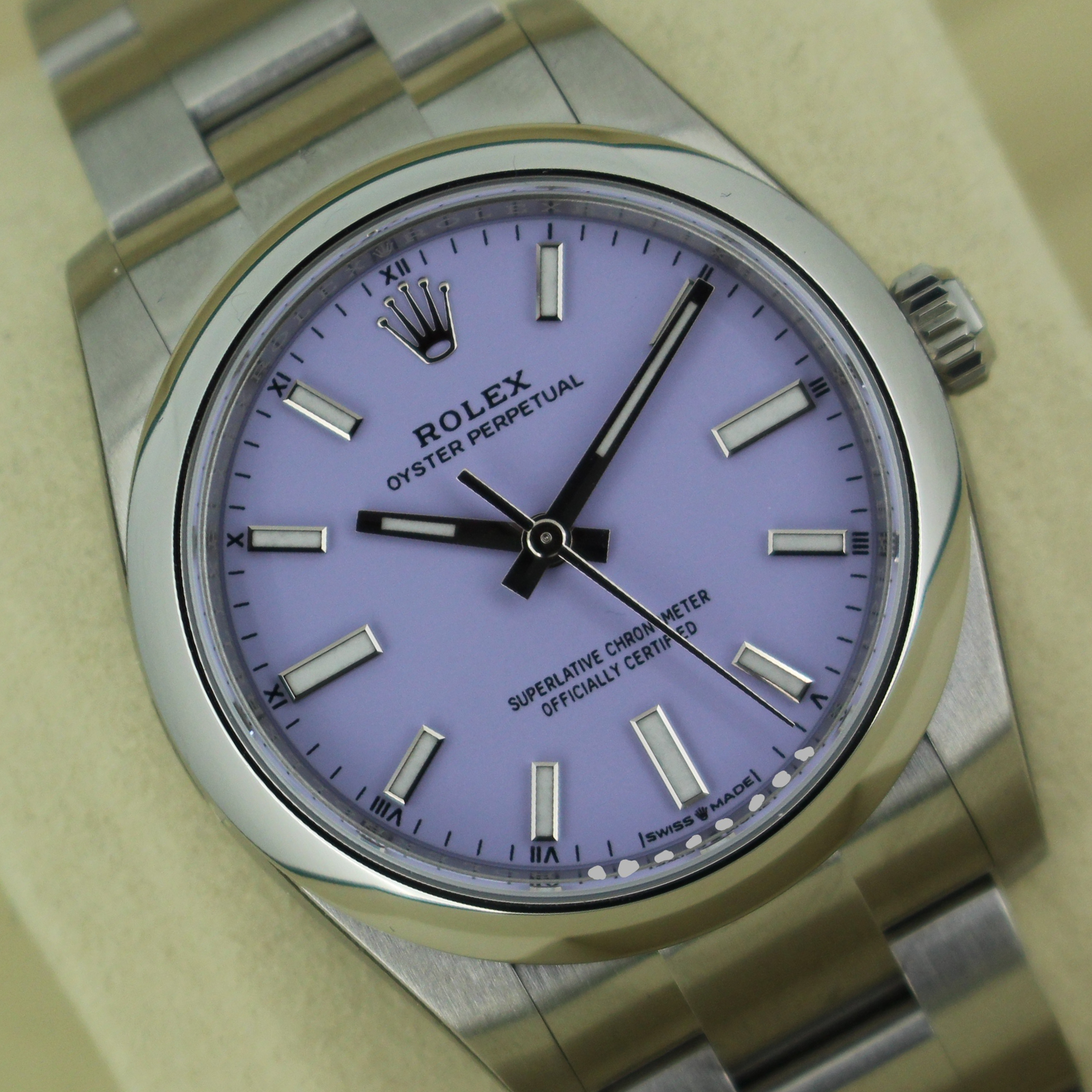 We are pleased to offer this unworn Rolex Oyster Perpetual 34mm. With a beautiful lavender dial fitted on the watch, this watch is a perfect daily wear.