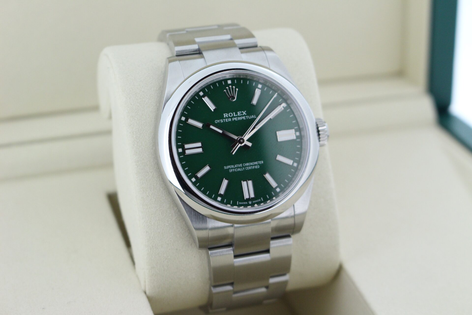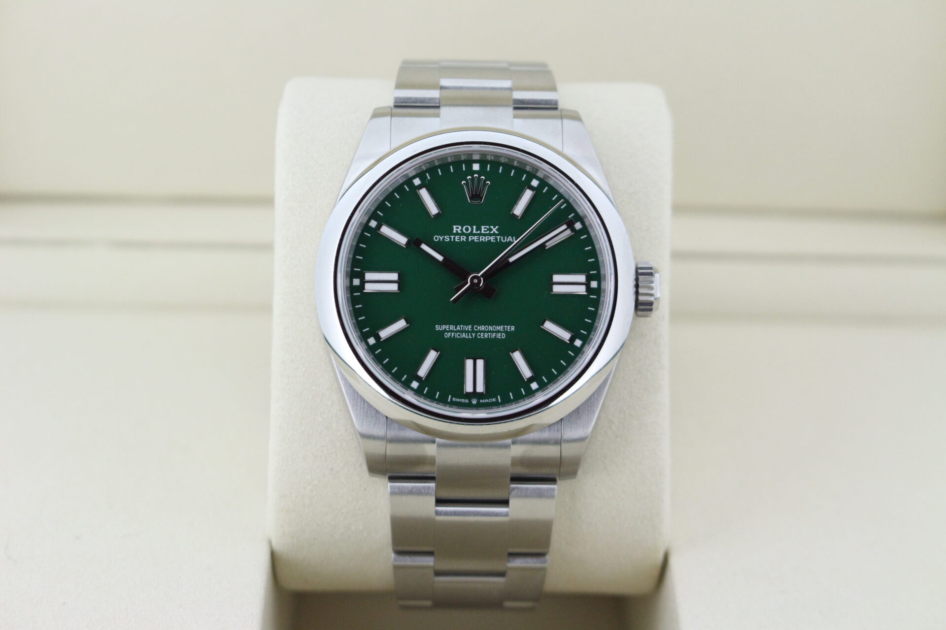 We are pleased to offer this Rolex Oyster Perpetual 41mm. With the striking green dial this watch is a perfect daily wear.