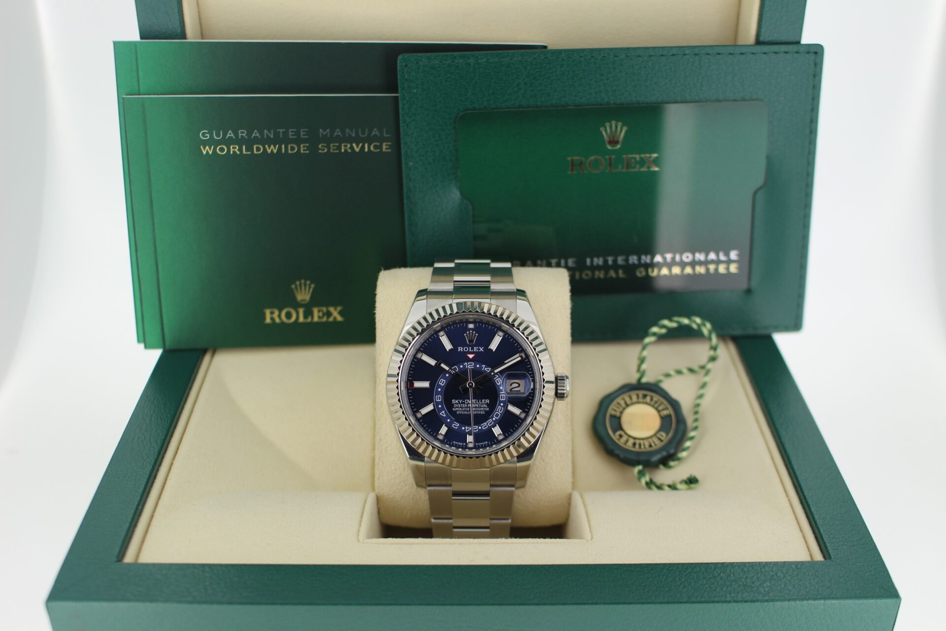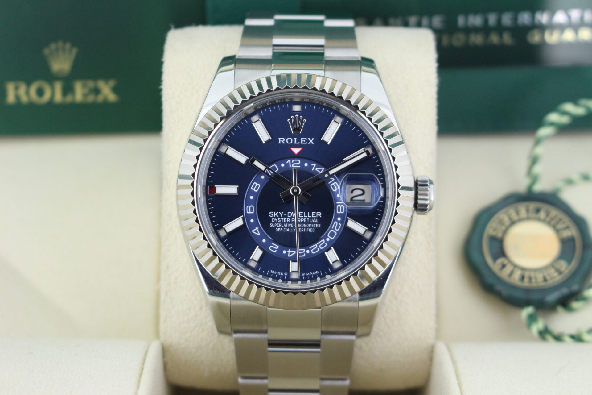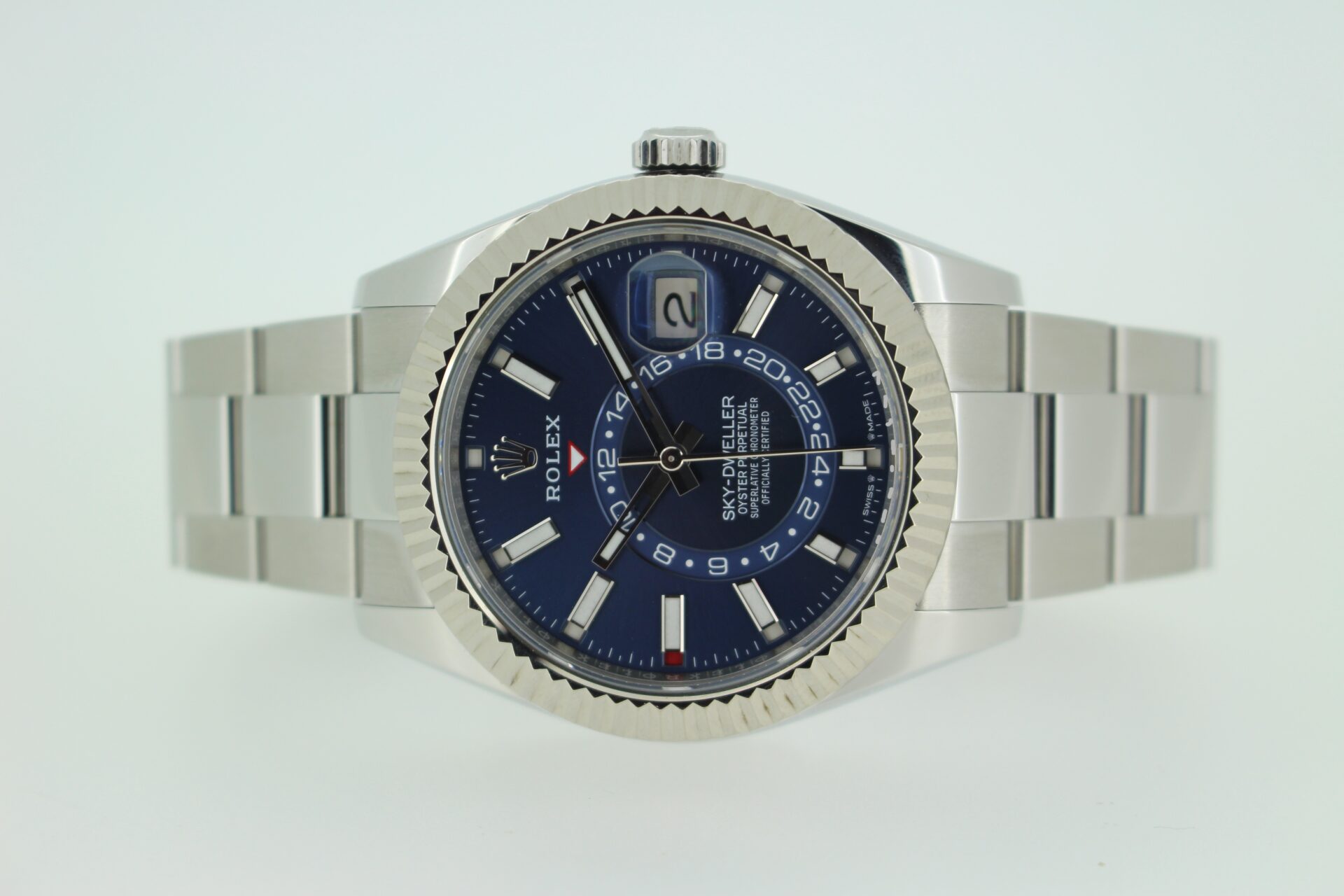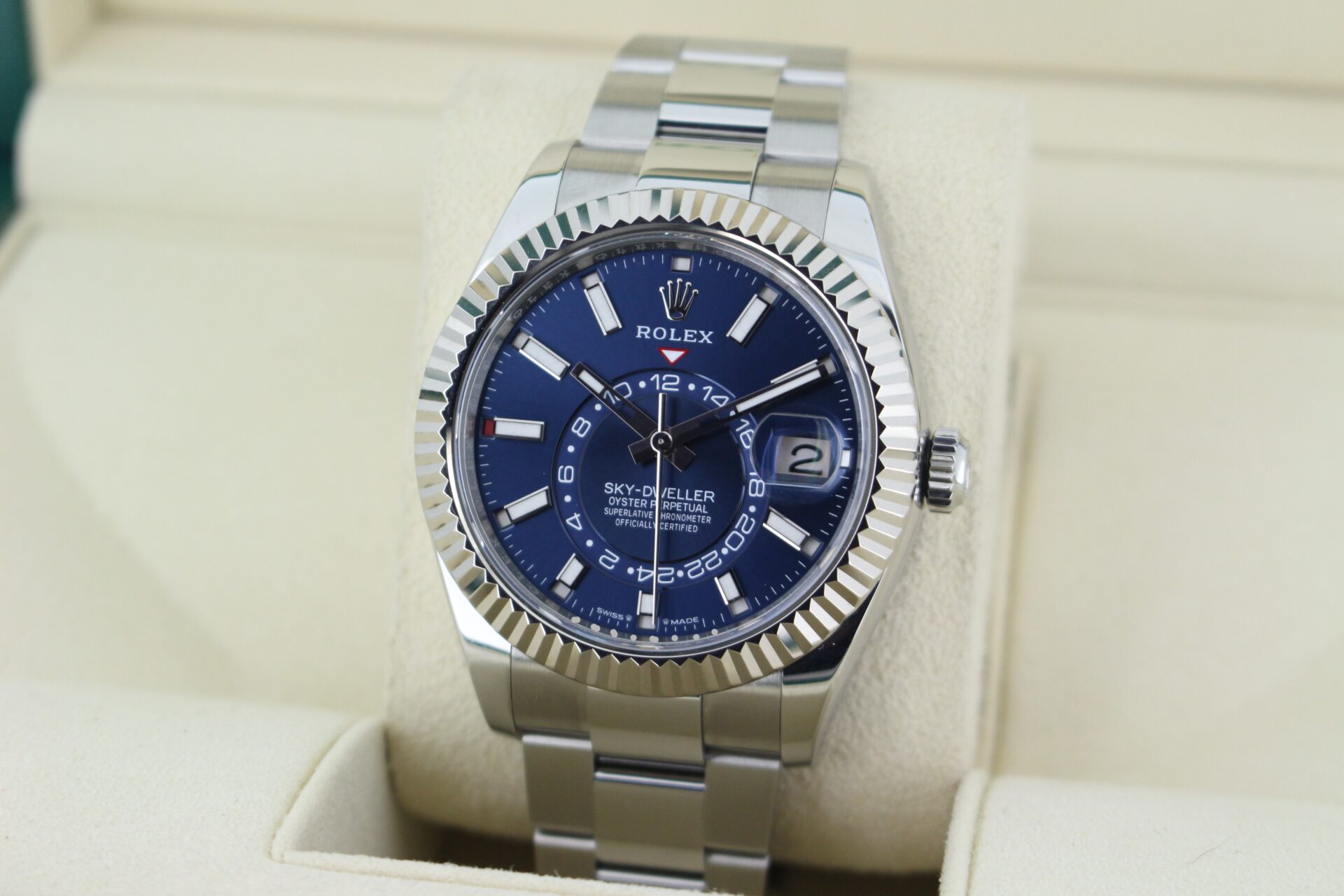 A stunning Rolex Sky-Dweller new reference watch in stainless steel with a blue dial, white gold fluted bezel and Oyster bracelet.