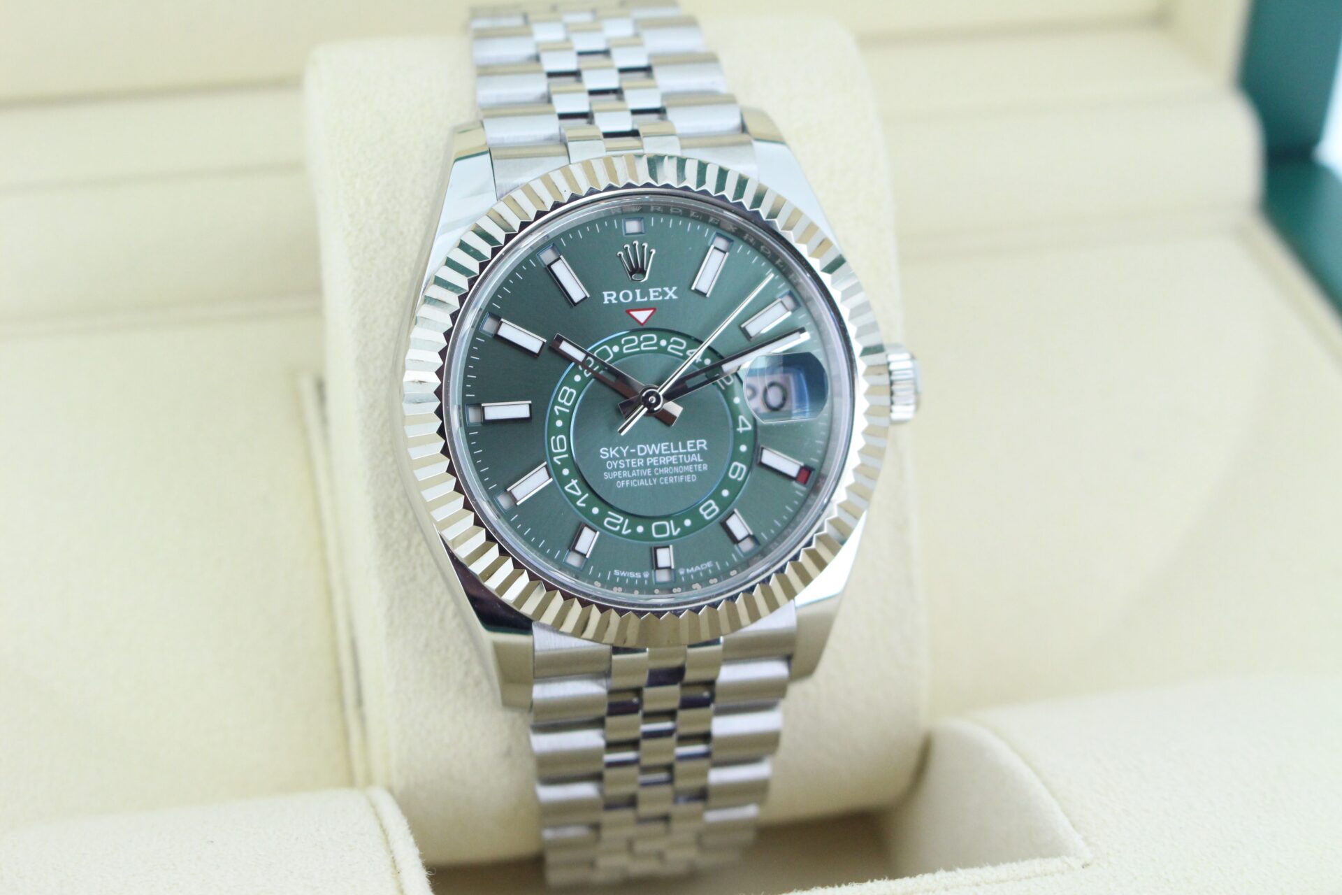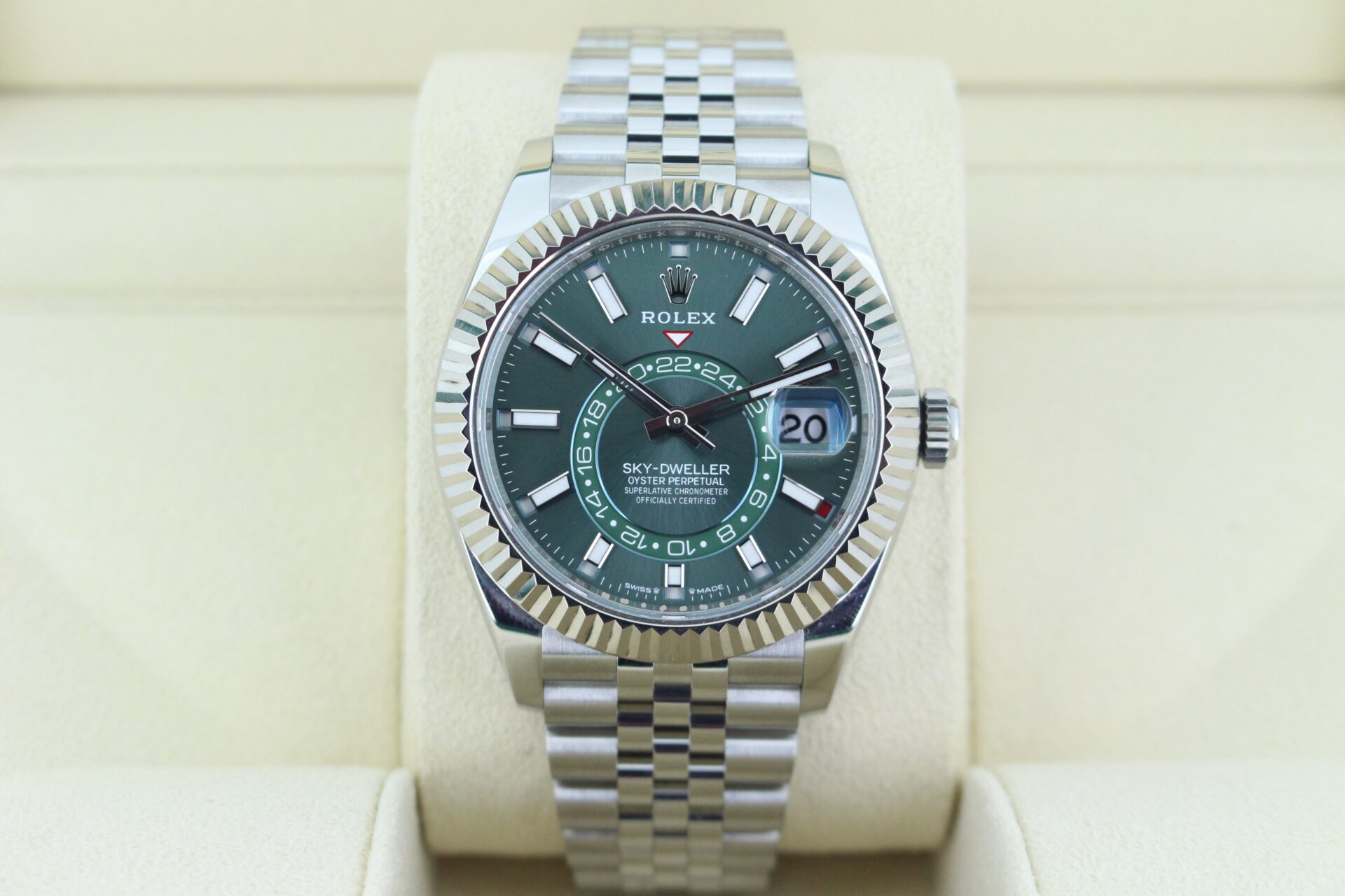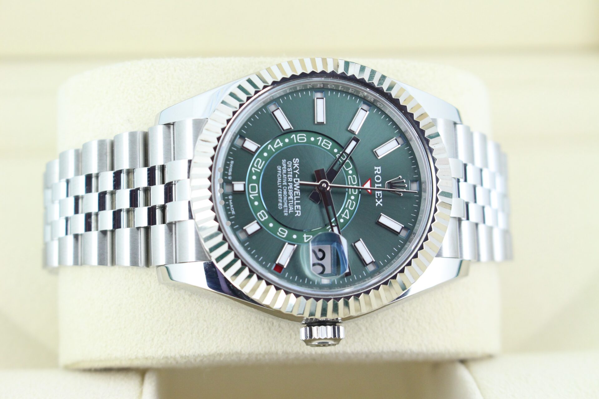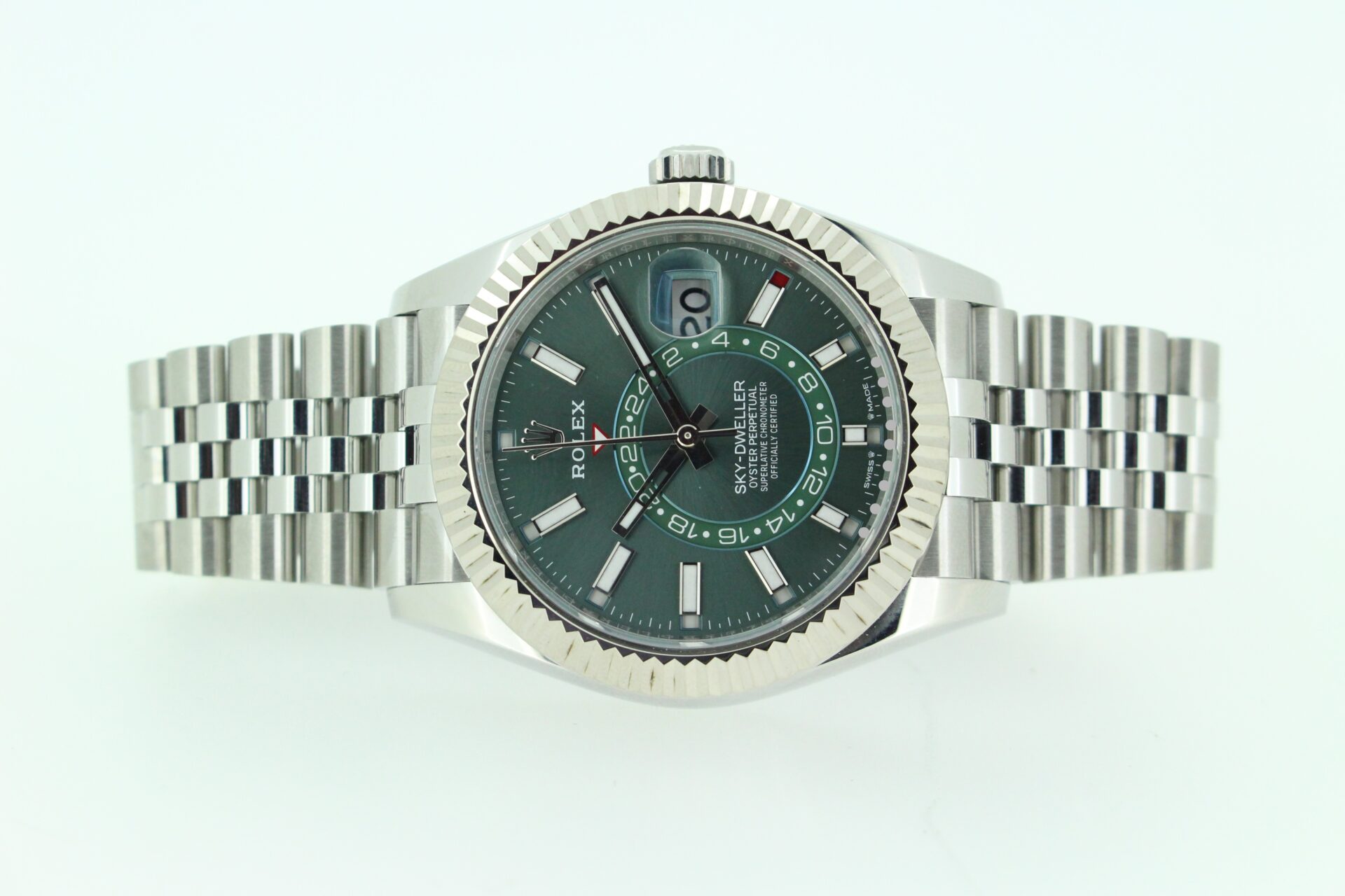 A stunning Rolex Sky-Dweller new reference watch in stainless steel with a green dial, 18ct white gold fluted bezel and a jubilee bracelet.
