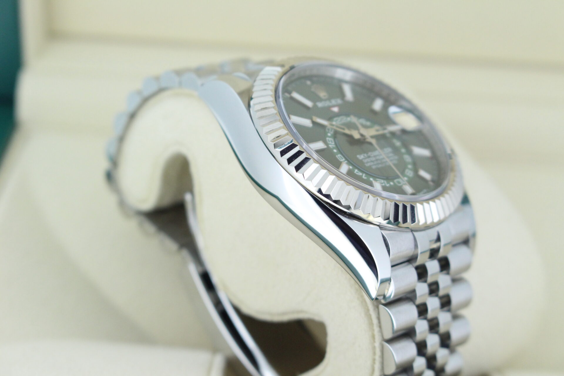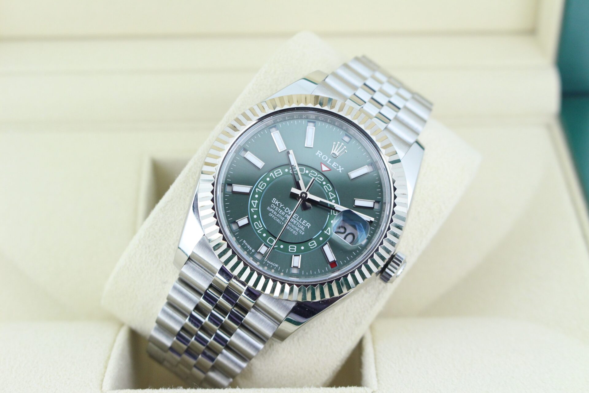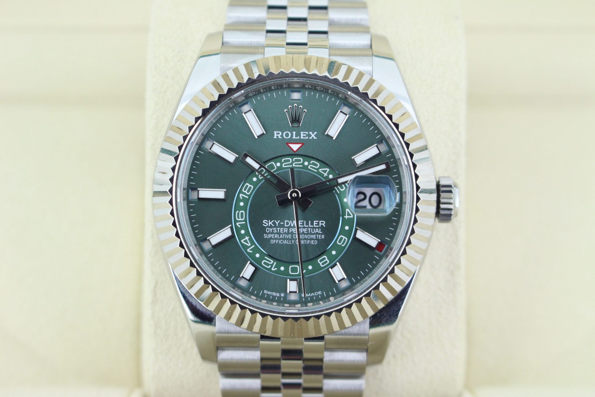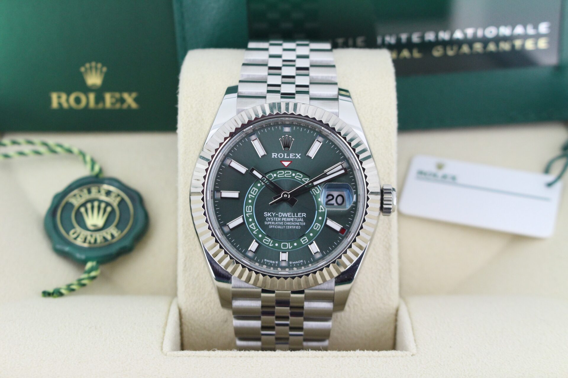 A stunning Rolex Sky-Dweller new reference watch in stainless steel with a green dial, 18ct white gold fluted bezel and a jubilee bracelet.
