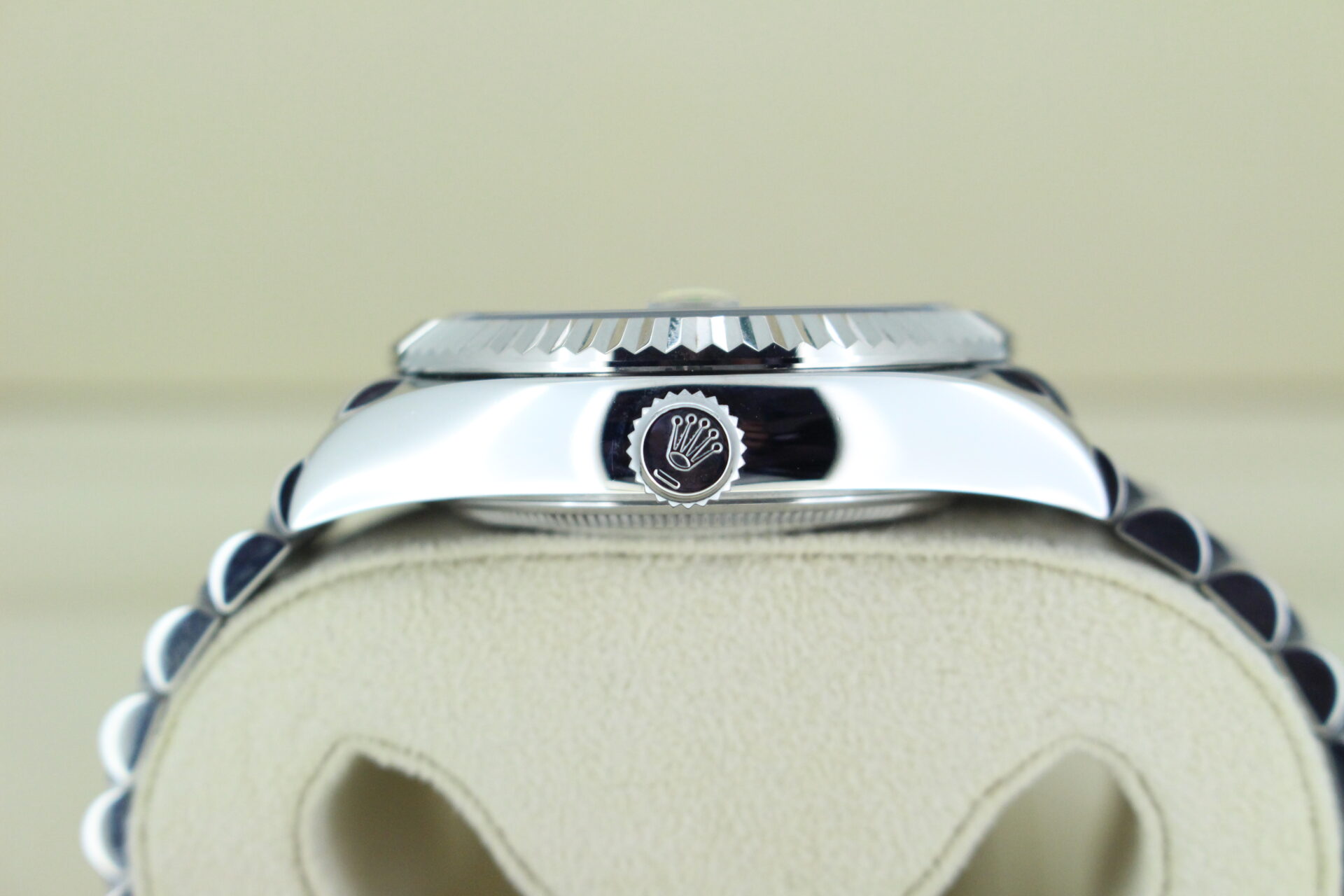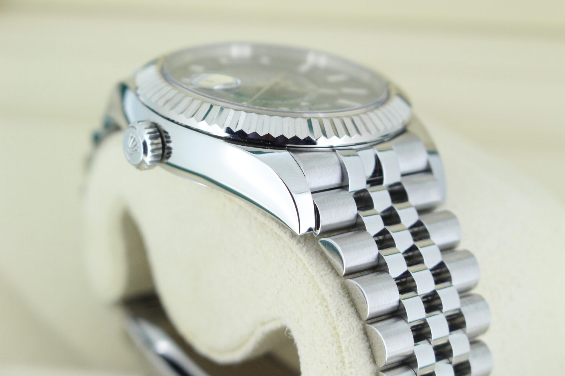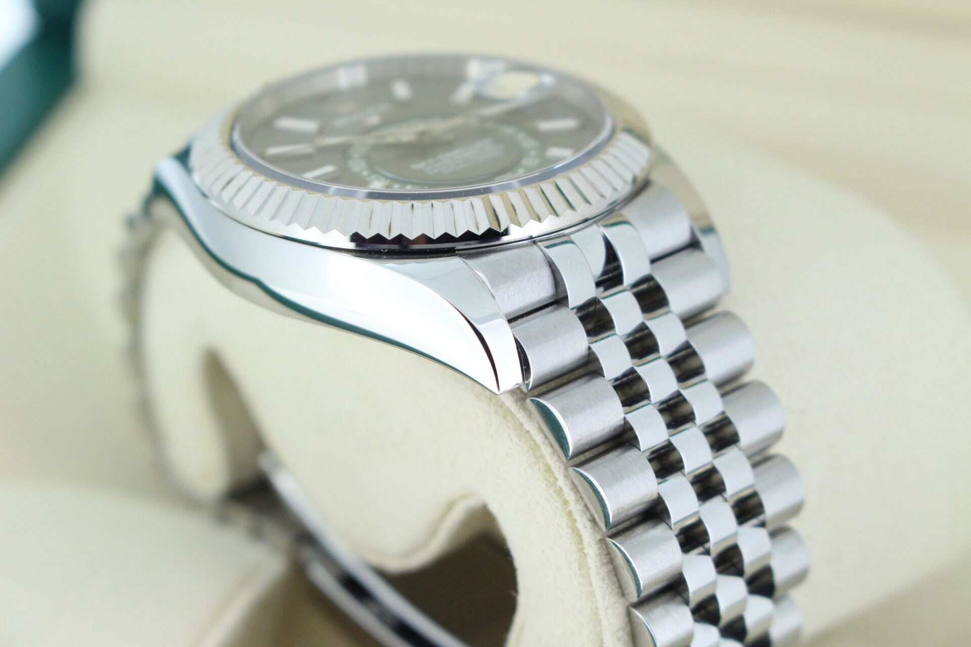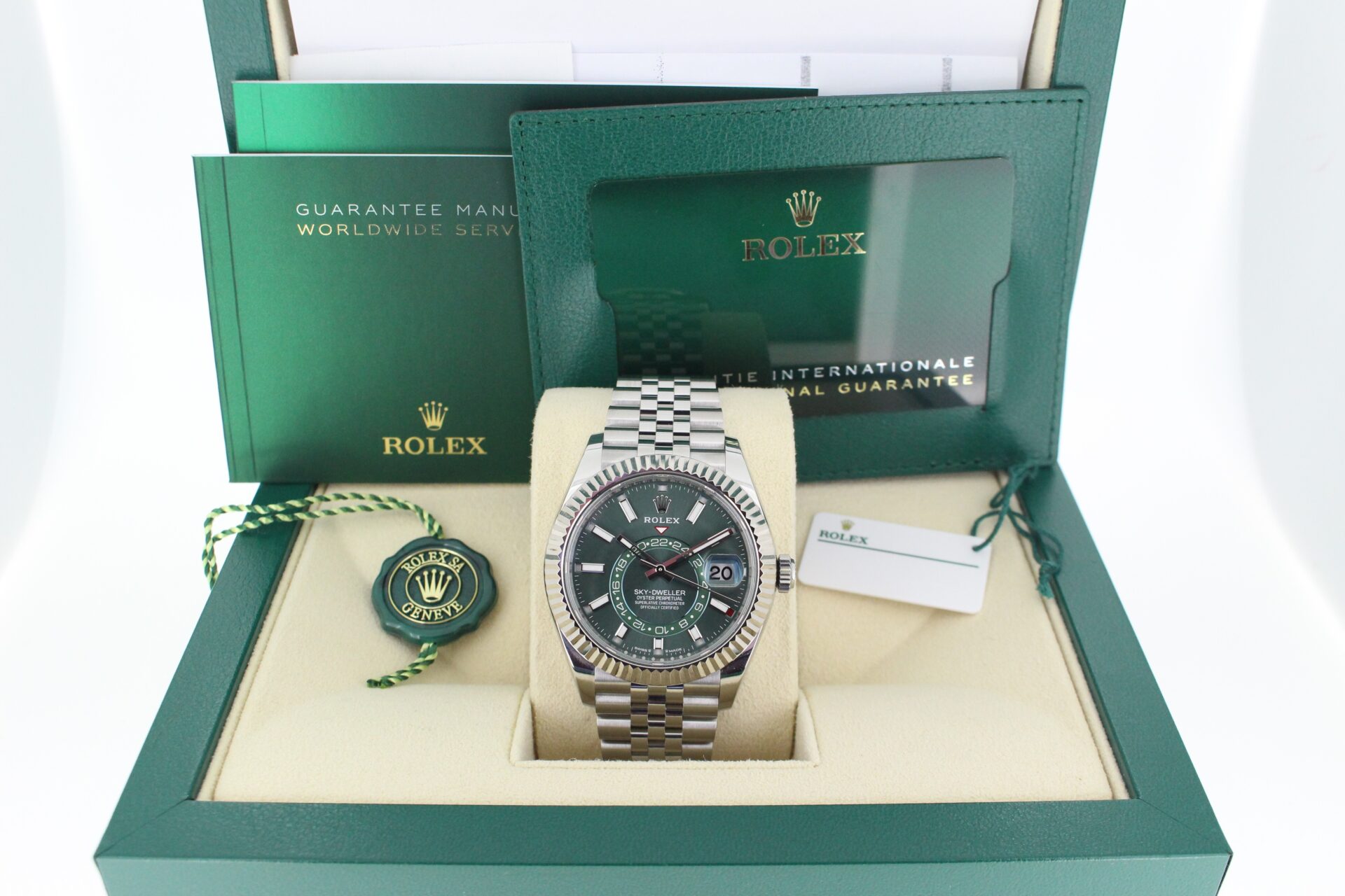 A stunning Rolex Sky-Dweller new reference watch in stainless steel with a green dial, 18ct white gold fluted bezel and a jubilee bracelet.