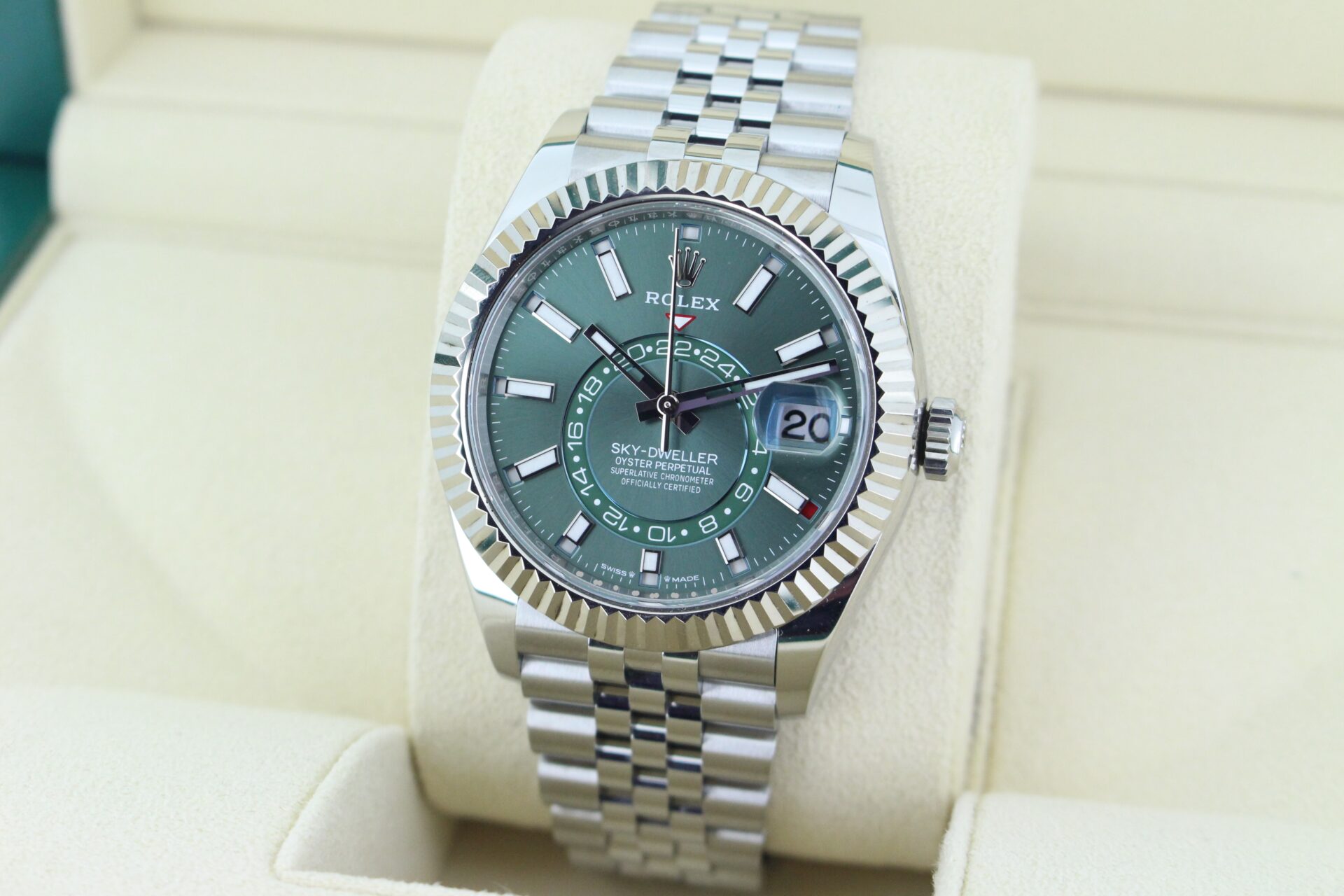 We are pleased to offer this Rolex Sky-Dweller 42mm. Fitted with the most in demand mint green dial this stylish and eye catching piece is a much sought after watch for all Rolex enthusiasts. Coming on the jubilee bracelet this is the most desirable configuration in the full Sky-Dweller range.