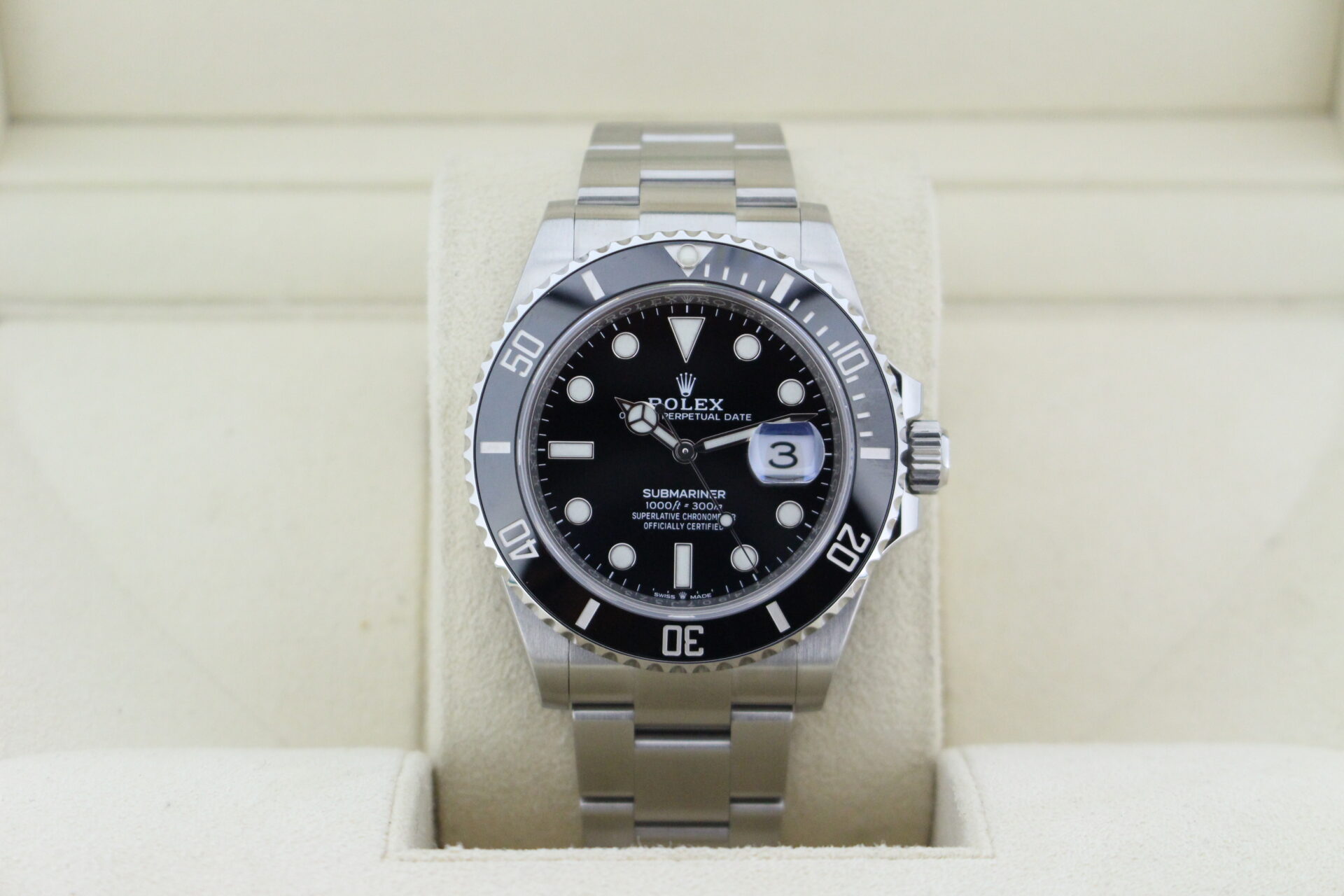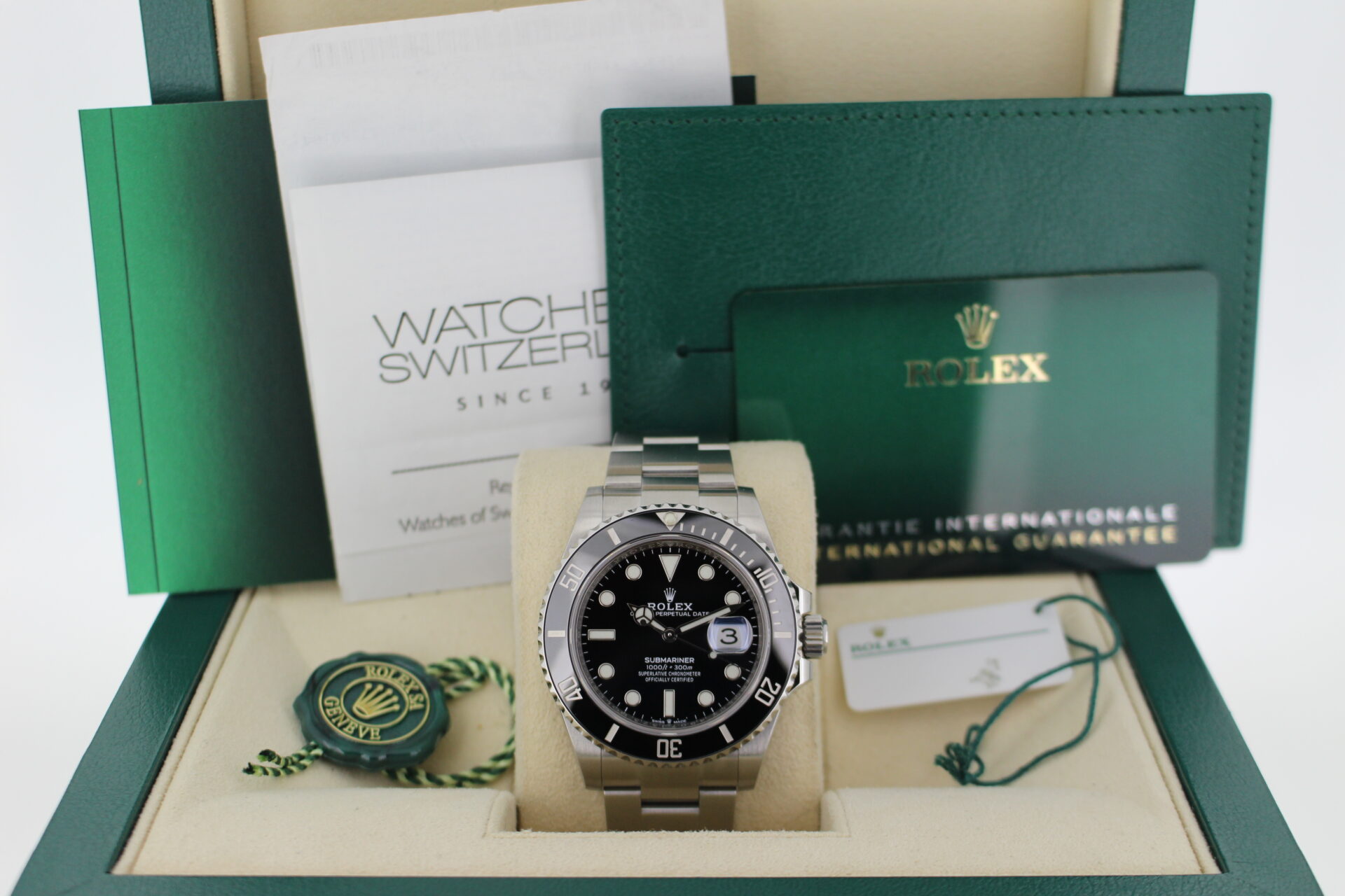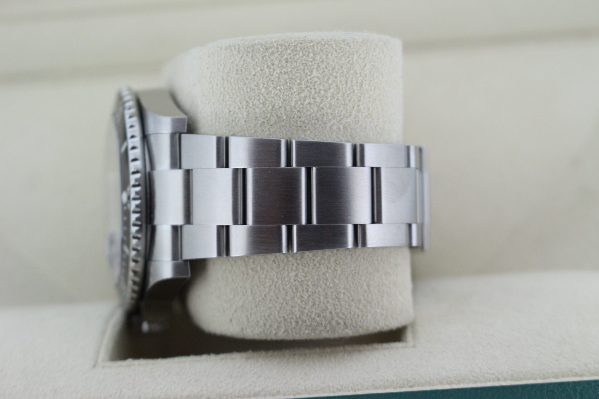 This particular watch comes as a full set from new including both inner and outer boxes, outer sleeve, both swing tags, booklets, original purchase receipt and new style Rolex warranty card stamped September 2020.
