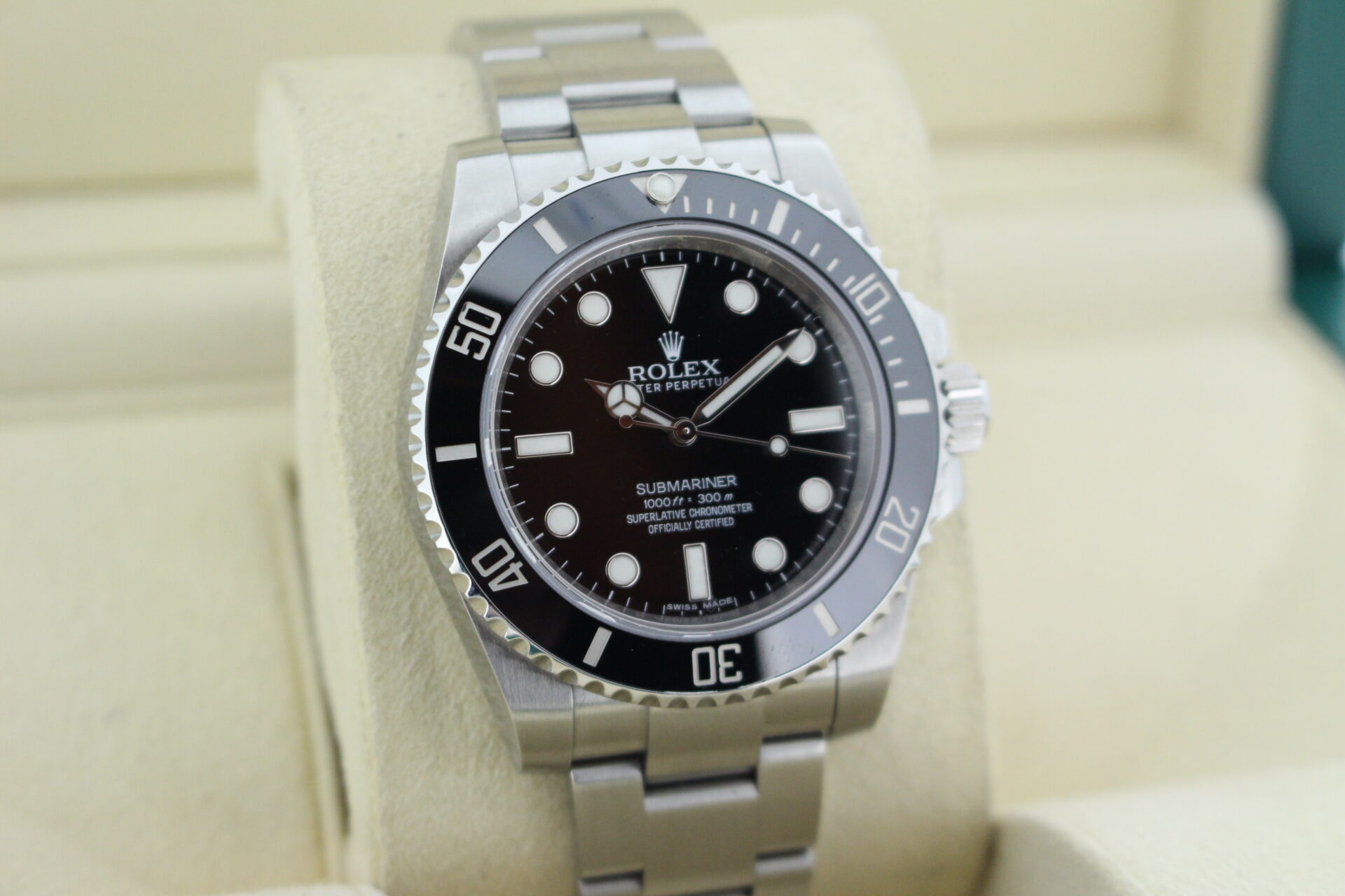 Stunning Gents Rolex Submariner Non-Date 40mm Watch in Stainless Steel with a Black Dial and Stainless Steel Rotating Bezel with a Black Ceramic Insert.