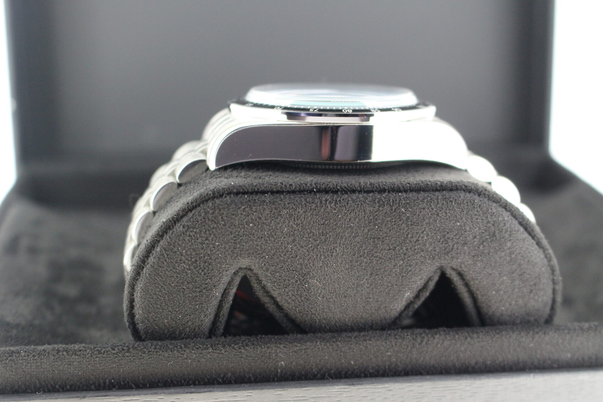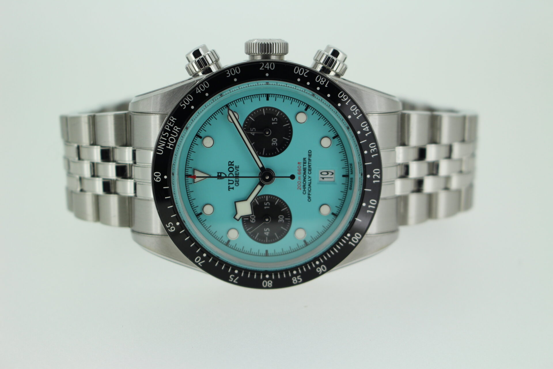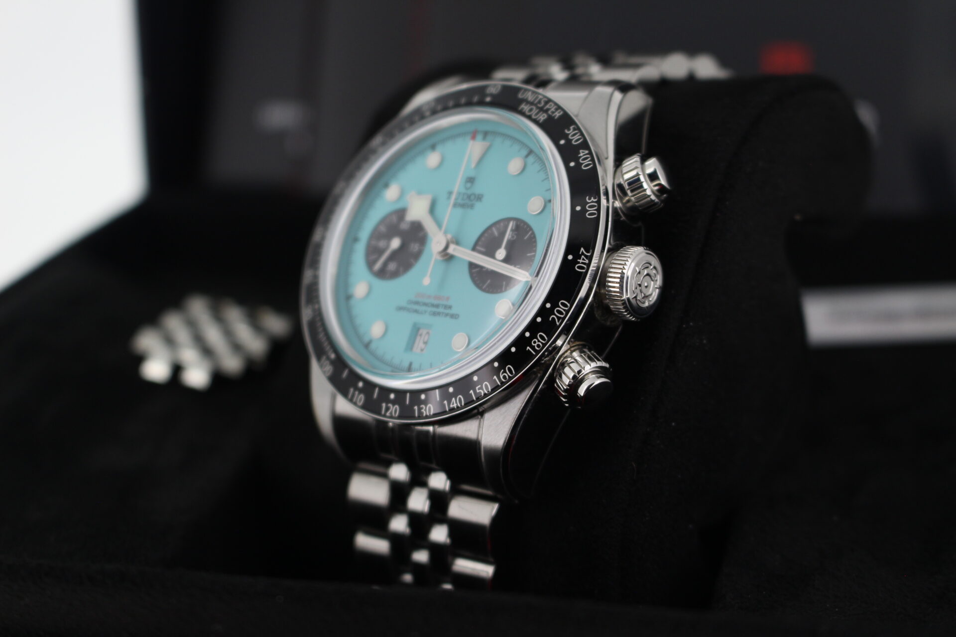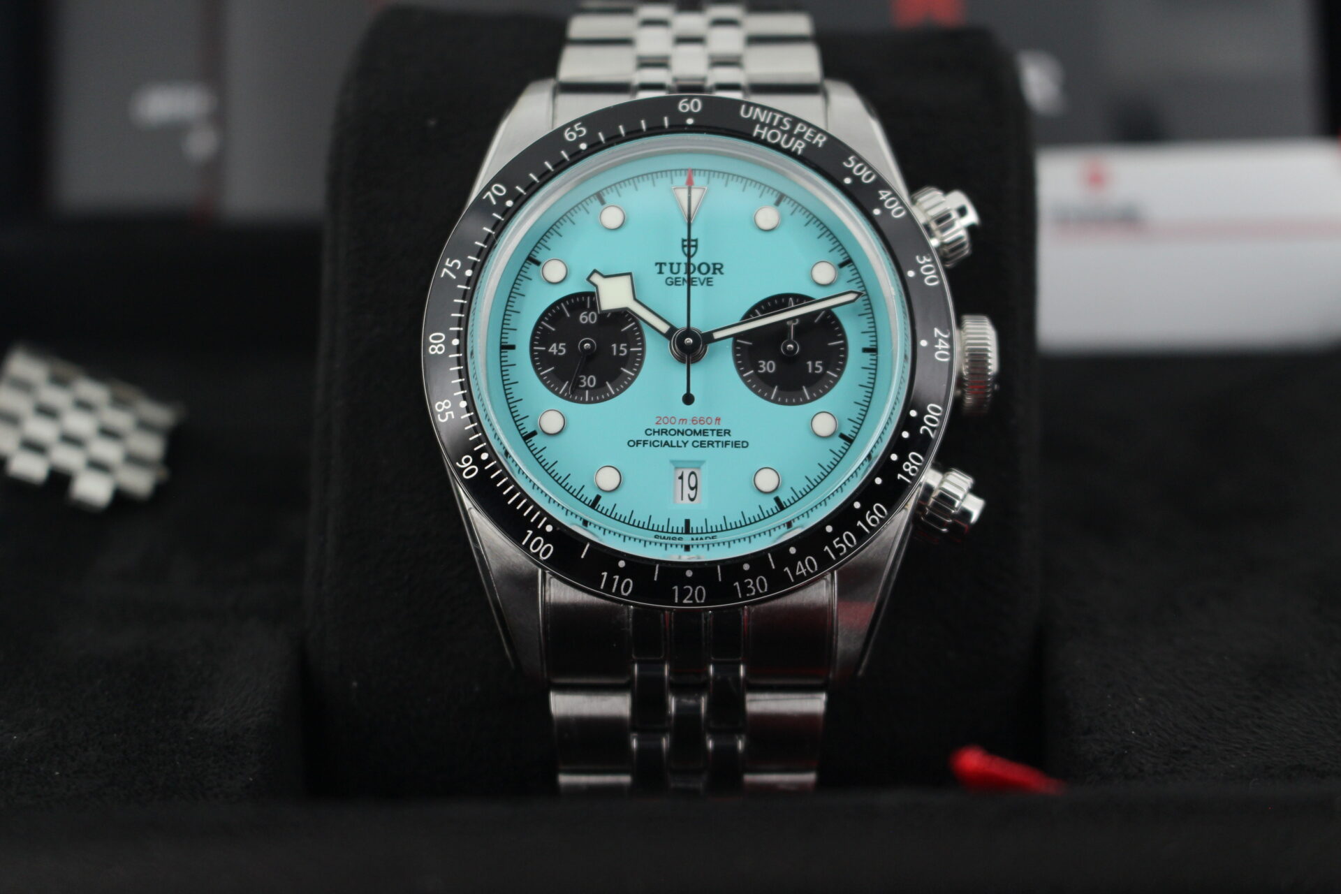 Following on the popularity of the Black Bay Chrono Pink “Inter Miami”, this model channels the vibes of South Beach, Miami but with a cool and fresh blue dial that creates a stylish look.